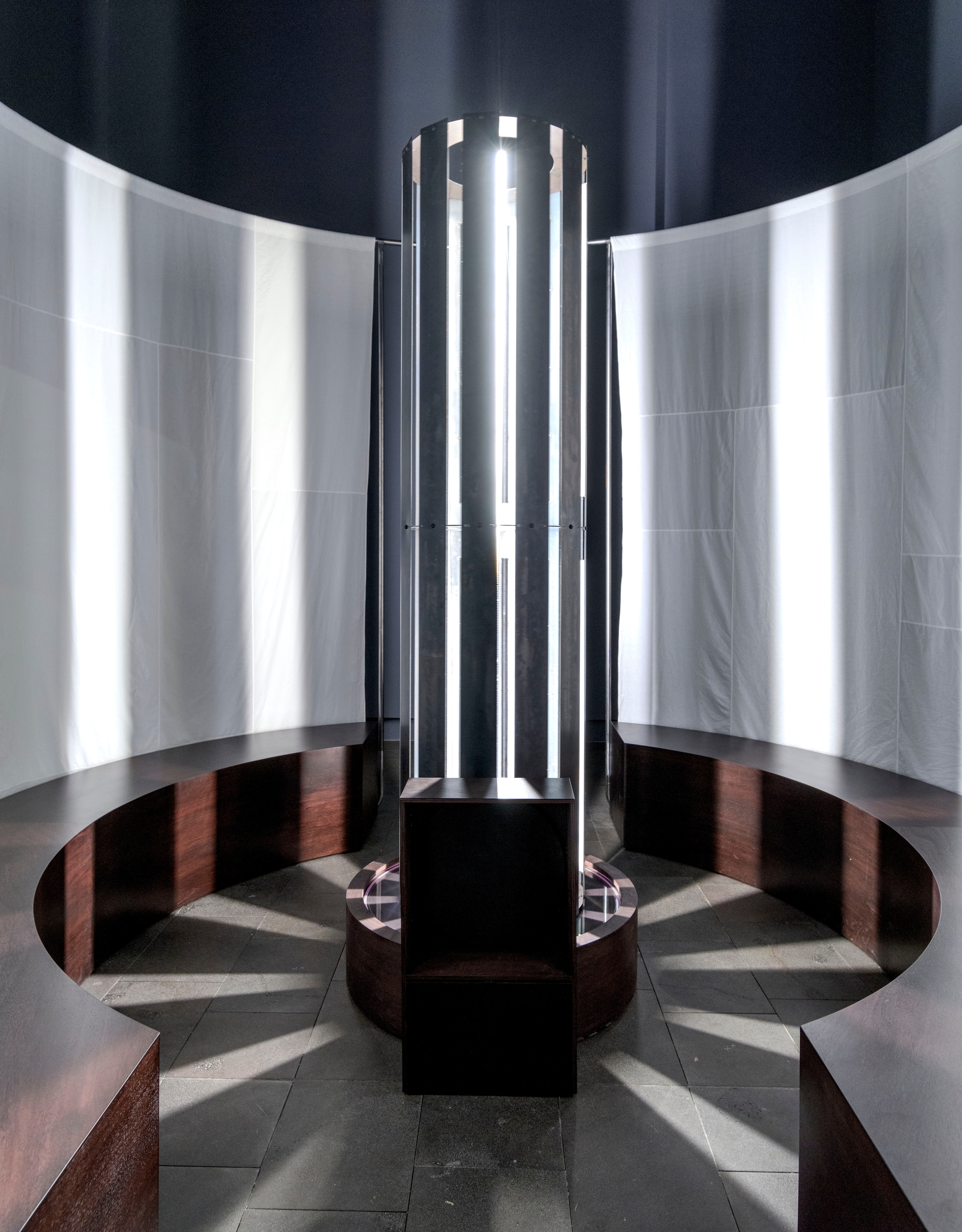 John Harris & Steven Junil Park, The Round, 2023, cotton, steel, brass, rubber, leather, wood, LED lights, Motor, 3000 x 3500 x 3500 mm. Image courtesy of the Christchurch Art Gallery Te Puna o Waiwhetū.