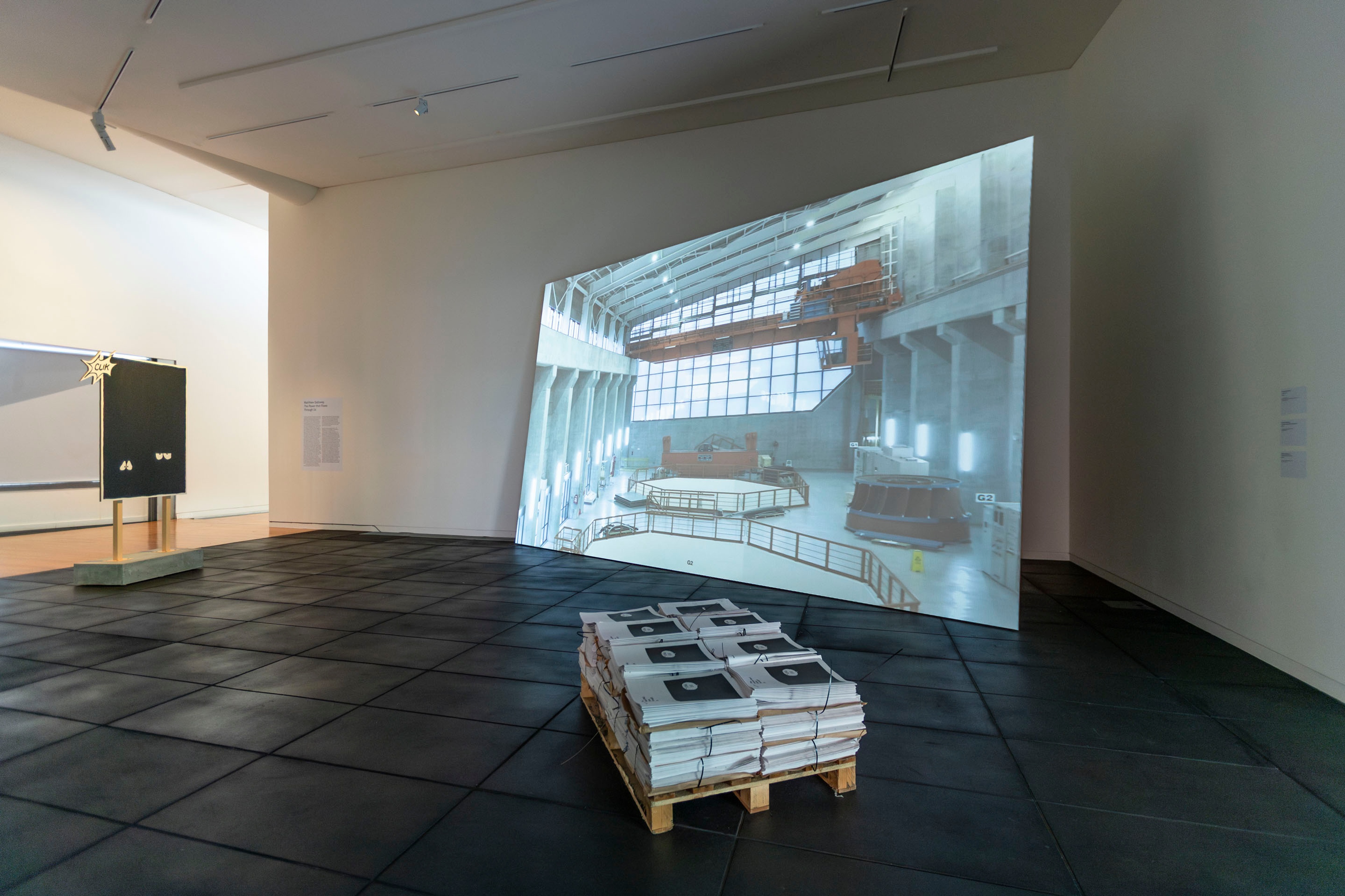 Installation view Matthew Galloway The Power that Flows Through Us in Infrastructure: power, politics and imagination, Te Pātaka Toi Adam Art Gallery. Photo: Ted Whitaker