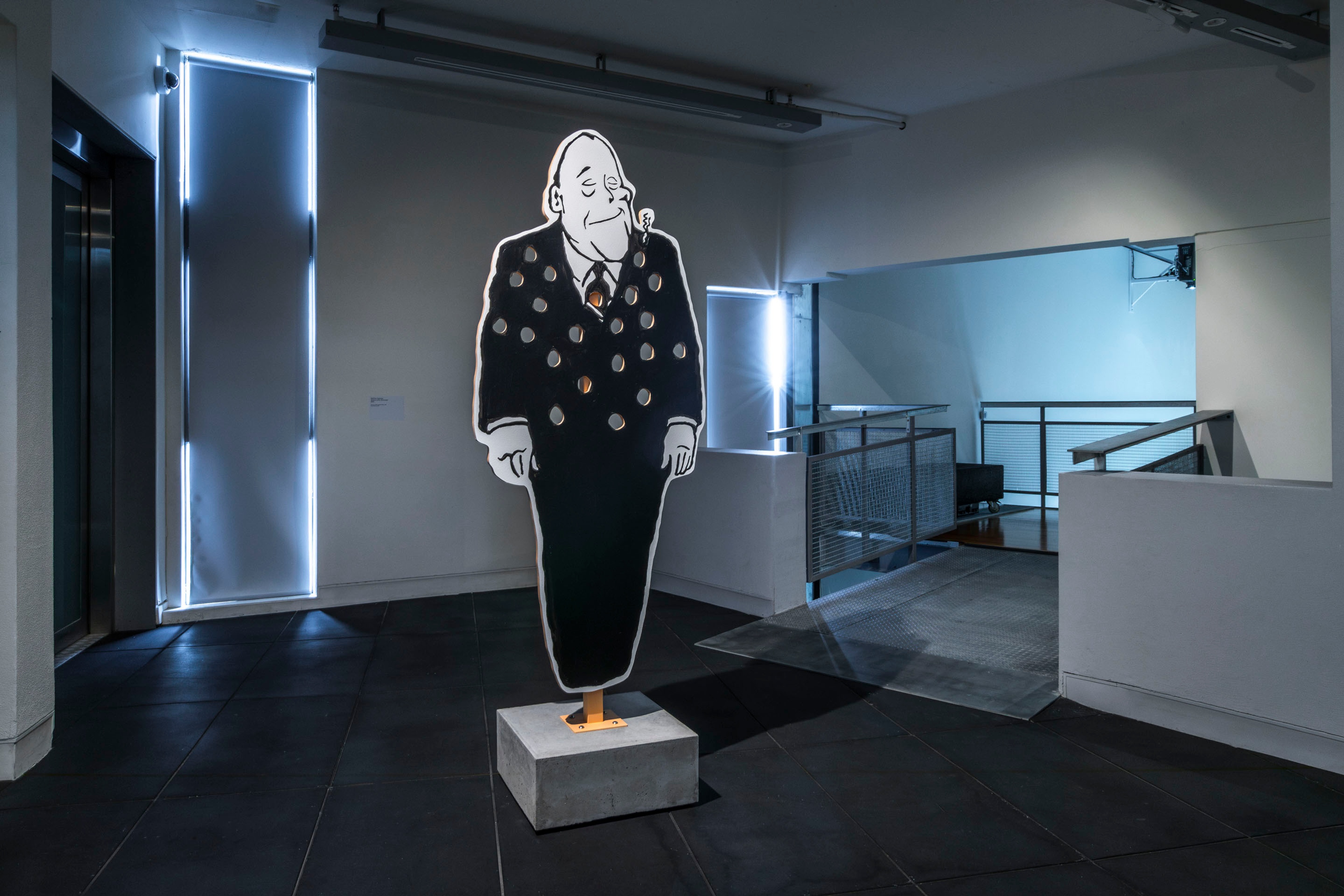 Matthew Galloway Muldoon (after Sid Scales), 2024, acrylic on MDF, painted steel, vinyl, courtesy the artist. Installation view Matthew Galloway The Power that Flows Through Us in Infrastructure: power, politics and imagination, Te Pātaka Toi Adam Art Gallery. Photo: Ted Whitaker