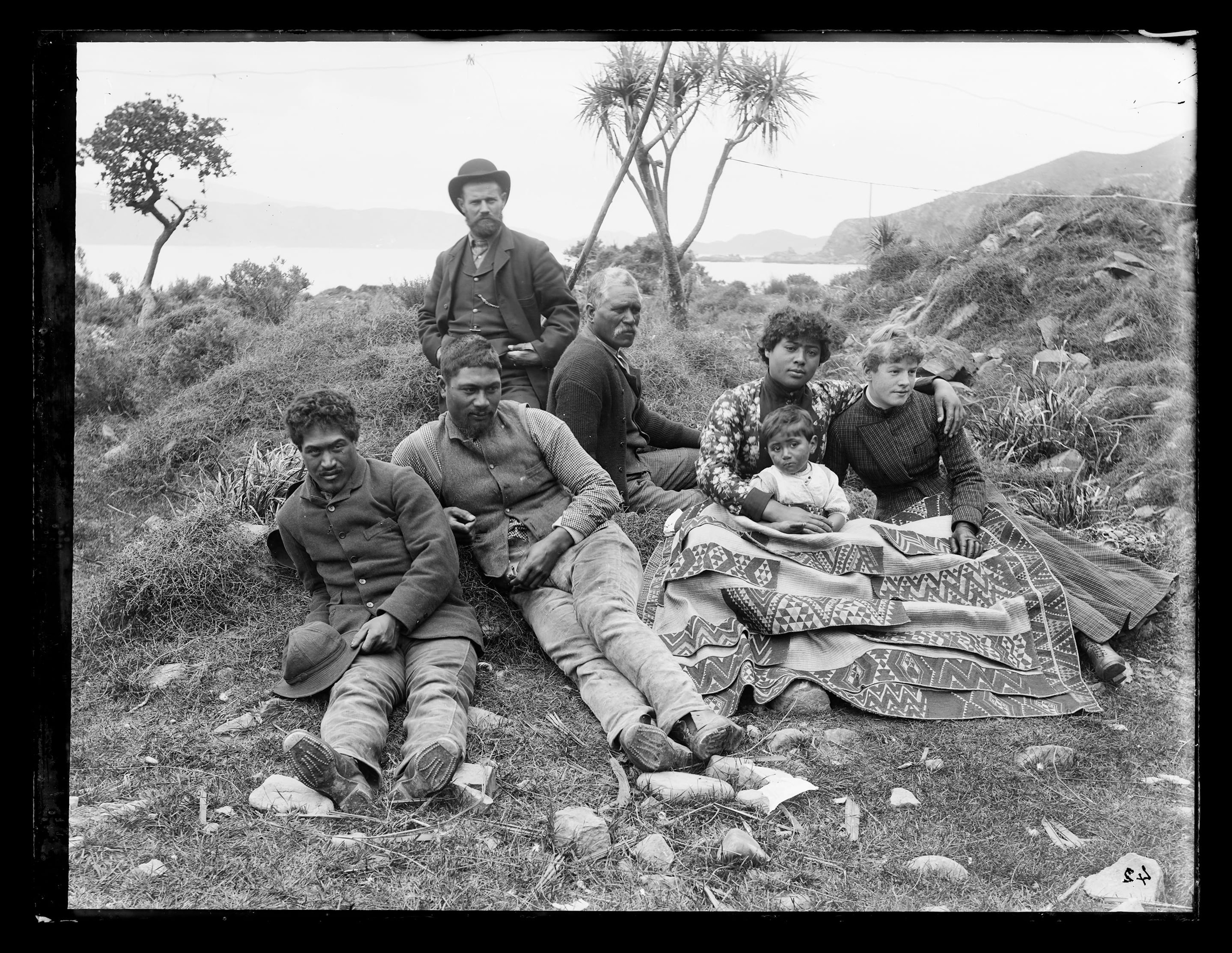 Henry Wright, Captain William Shilling (back, kneeling); Kereopa Tukumaru (centre); Rīpeka Te Puni with her arm around the photographer’s daughter, Amy Elizabeth Wright; and Rīpeka’s brothers Nopera and Atanatiu, photographed at Karaka Bay, Wellington, c. 1885, gelatin silver glass plate negative (165 × 216 mm) Alexander Turnbull Library, 1/1-020634-G.