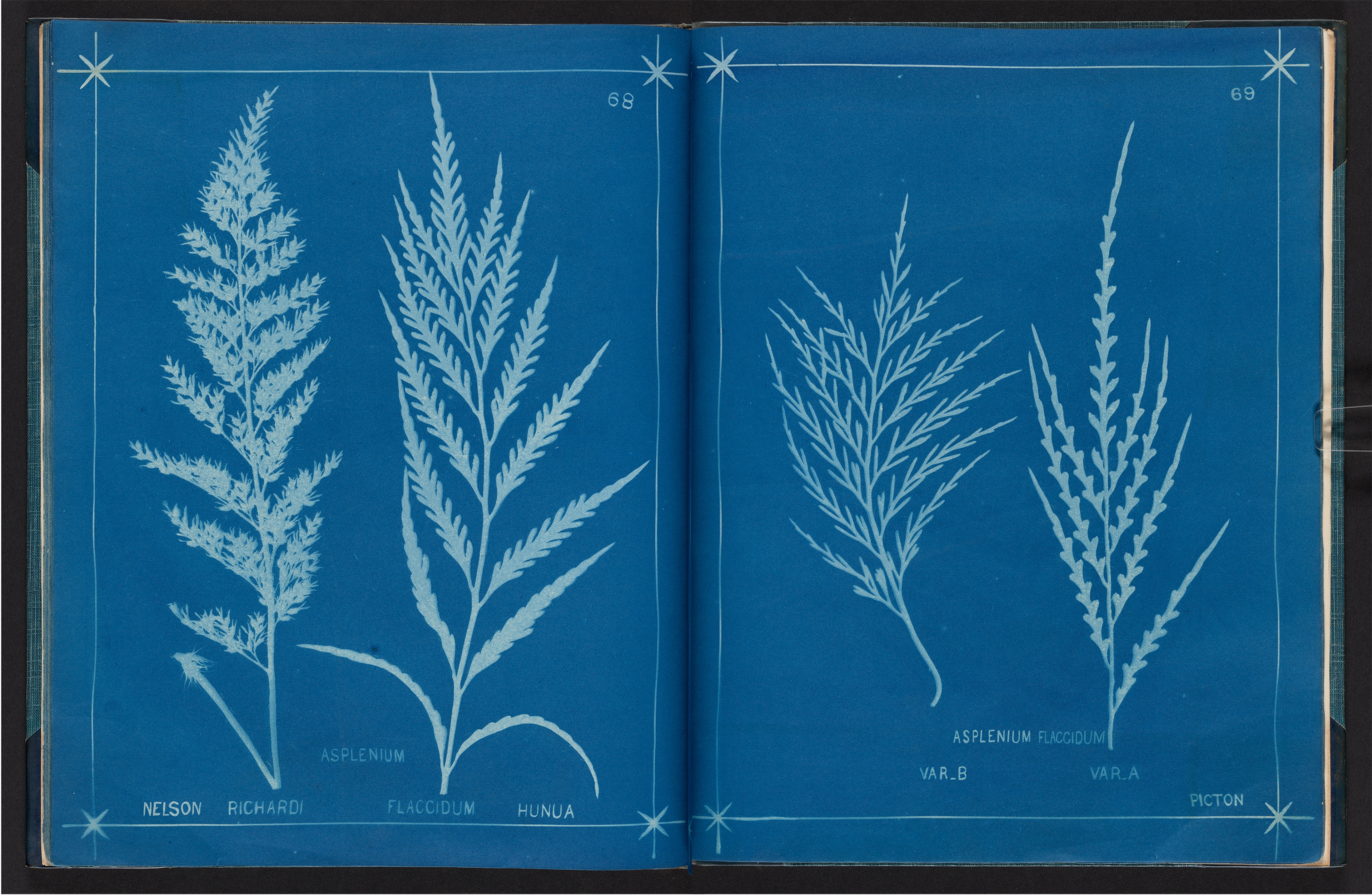 Herbert B. Dobbie, New Zealand ferns, 1880, cyanotype, 278 × 340 mm, Alexander Turnbull Library, P q587.309931 DOB 1880, pp. 68–69.