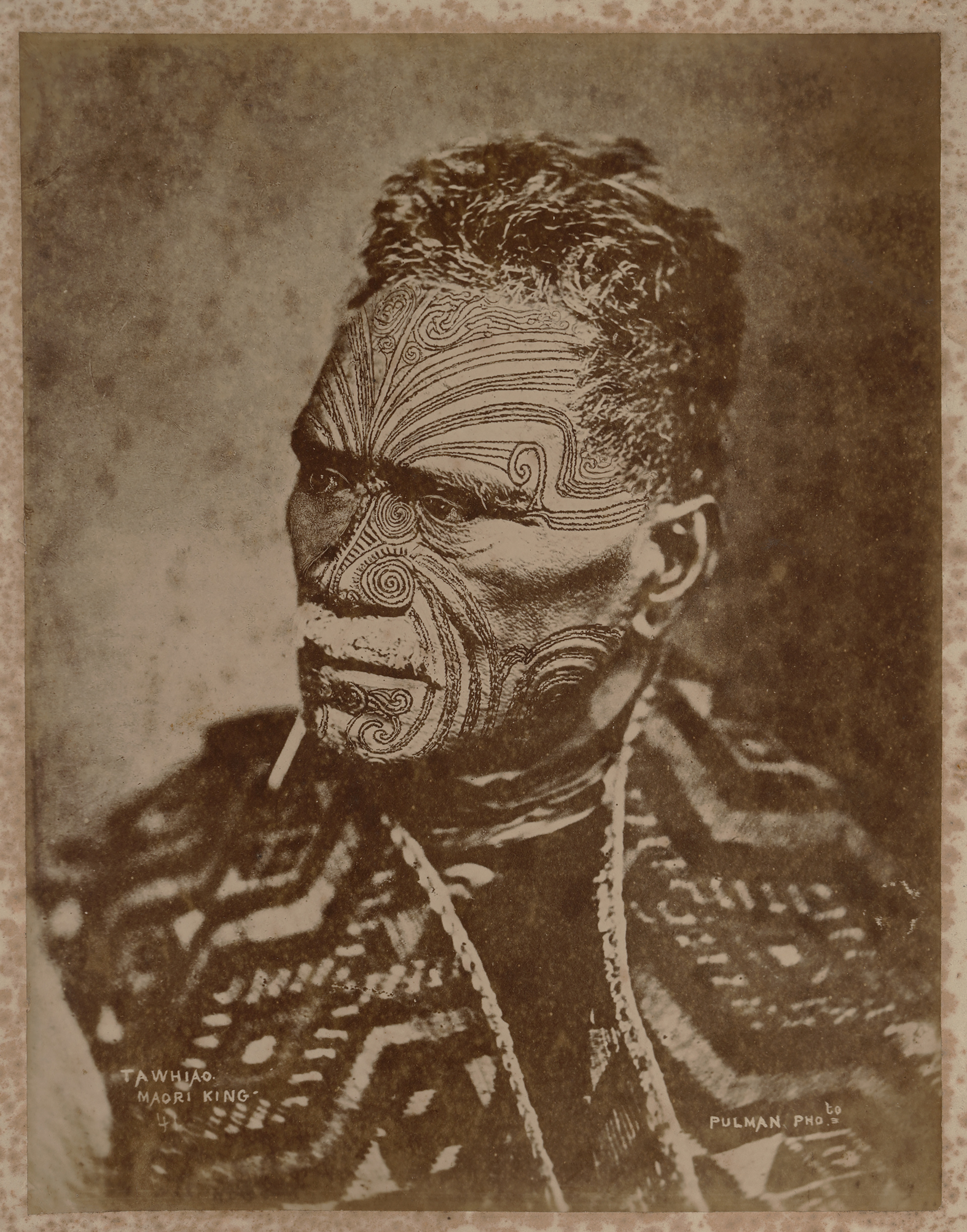 Elizabeth Pulman, King Tāwhiao, Tūkāroto Matutaera Pōtatau Te Wherowhero, Ngāti Mahuta, 1882, albumen silver print mounted on album page, (283 × 219 mm), Tāmaki Paenga Hira Auckland War Memorial Museum, PH-2015-10-p1-1.