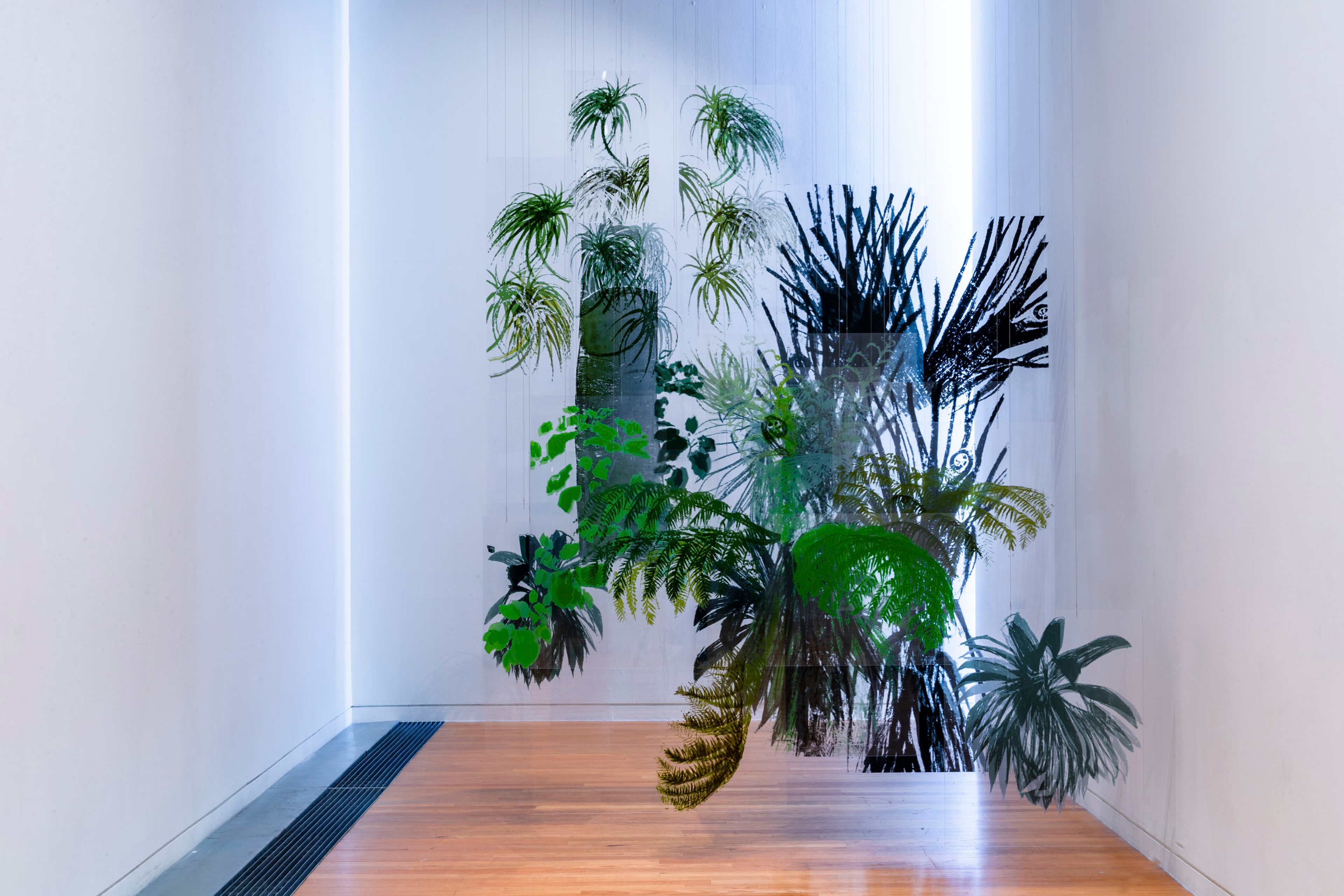 Susan Skerman, Bush Panels, 1981, 16 screenprinted perspex panels, Ngā Puhipuhi o Te Herenga Waka—Victoria University Art Collection, formerly the Wellington College of Education Art Collection, accessioned 2009. Installation view, Folded Memory, Te Pātaka Toi Adam Art Gallery, Te Herenga Waka—Victoria University of Wellington, 2023. Photo: Ted Whitaker.