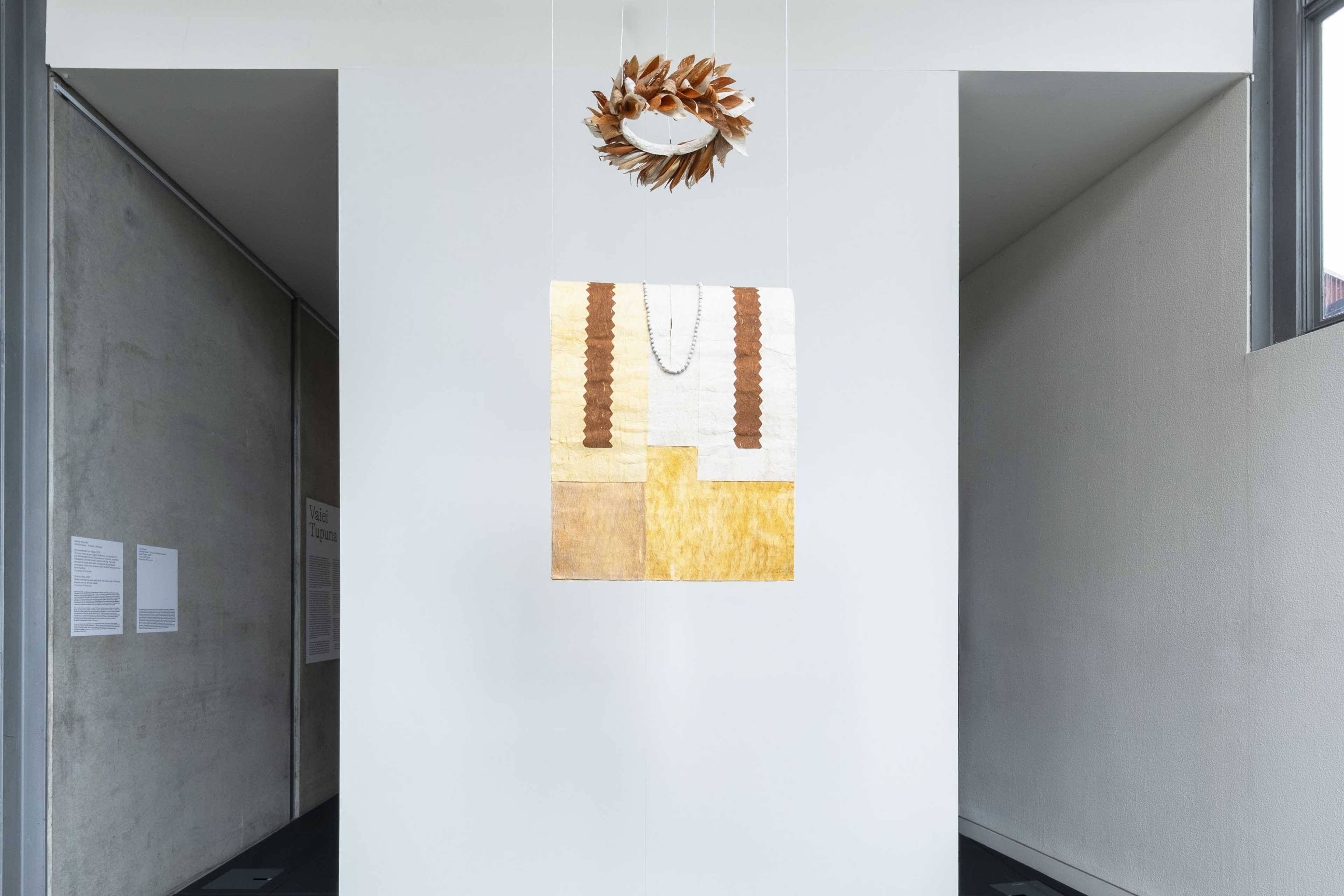 Pauline Reynolds, My Grandmother is a Tīputa, 2022, Ao of aute, ’uru, ’ōrā (banyan); and, Te hei no Hina, 2024, woven and plaited banyan tapa, both courtesy of the artist. Installation view Vaiei Tupuna, Te Pātaka Toi Adam Art Gallery, Te Herenga Waka—Victoria University of Wellington, 2024. Photo: Ted Whitaker.