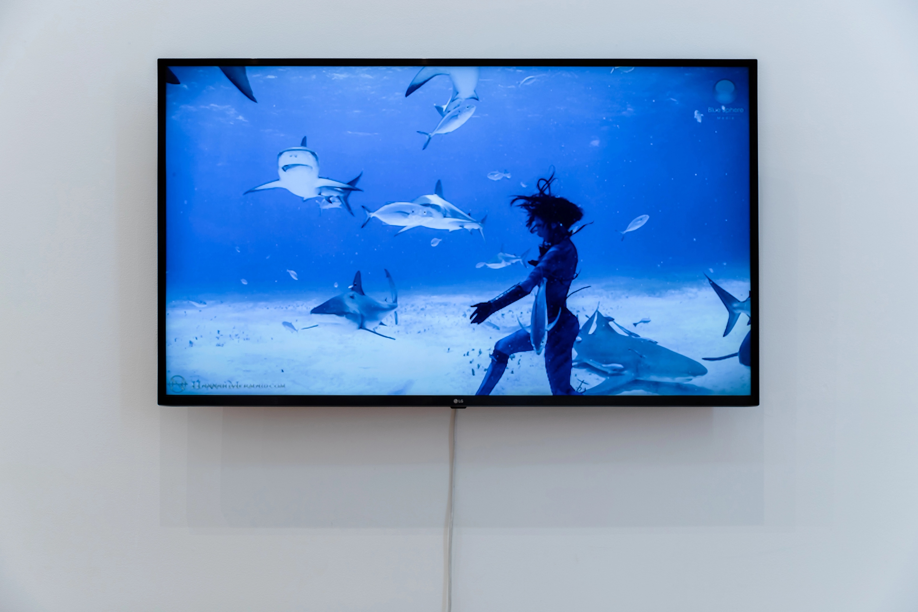 Hannah Mermaid, Showreel, 2017, video, colour, sound, 6 mins 21 secs. Courtesy of Hannah Fraser. Installation view, Megan Dunn: The Mermaid Chronicles, Te Pātaka Toi Adam Art Gallery, Te Herenga Waka Victoria University of Wellington, 2022. Photo: Ted Whitaker
