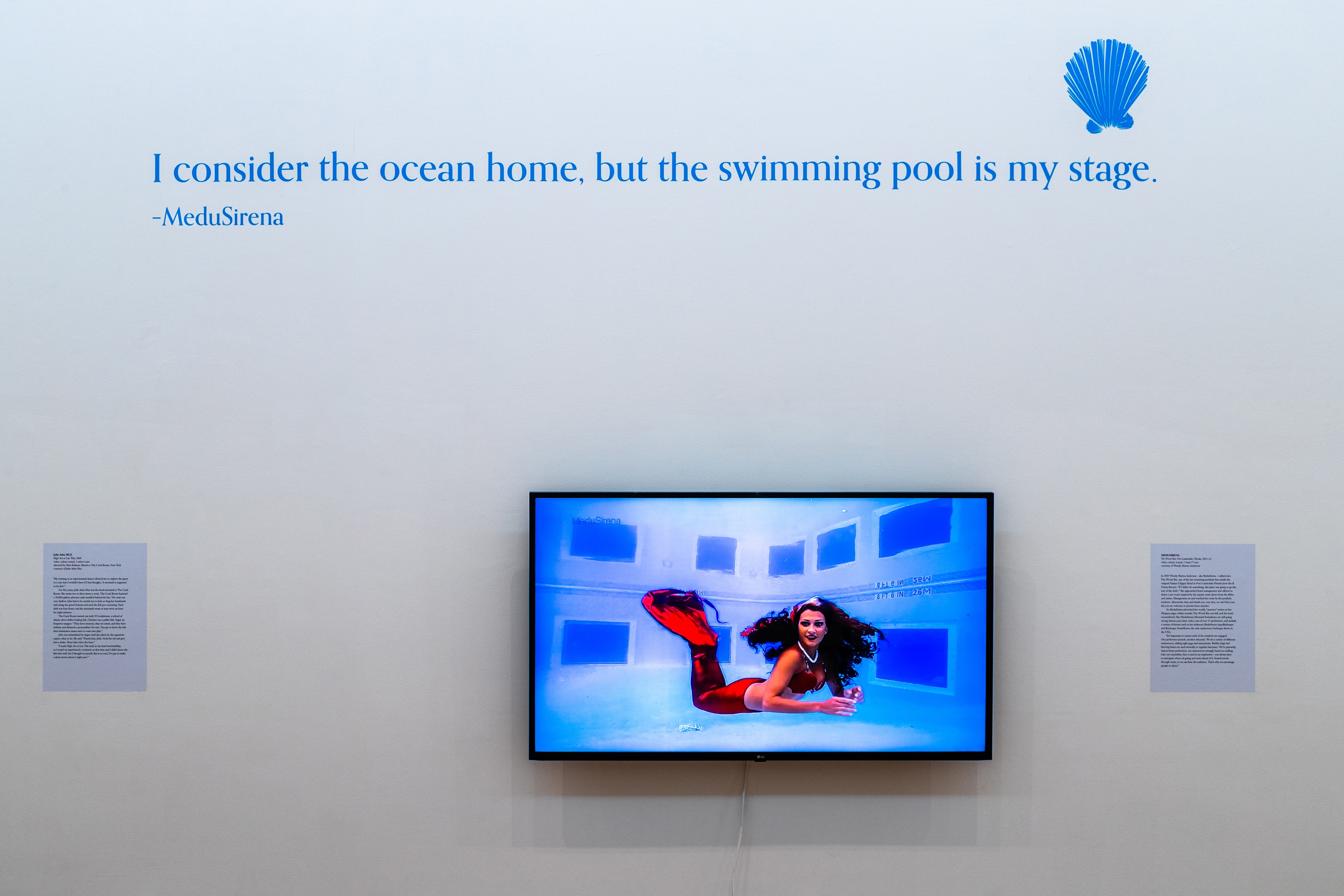 Julie Atlas Muz, High Art at Low Tide, 2004, video, colour, sound, 3 mins 6 secs, directed by Matt Kalman, filmed at The Coral Room, New York. Installation view, Megan Dunn: The Mermaid Chronicles, Te Pātaka Toi Adam Art Gallery, Te Herenga Waka Victoria University of Wellington, 2022. Photo: Ted Whitaker