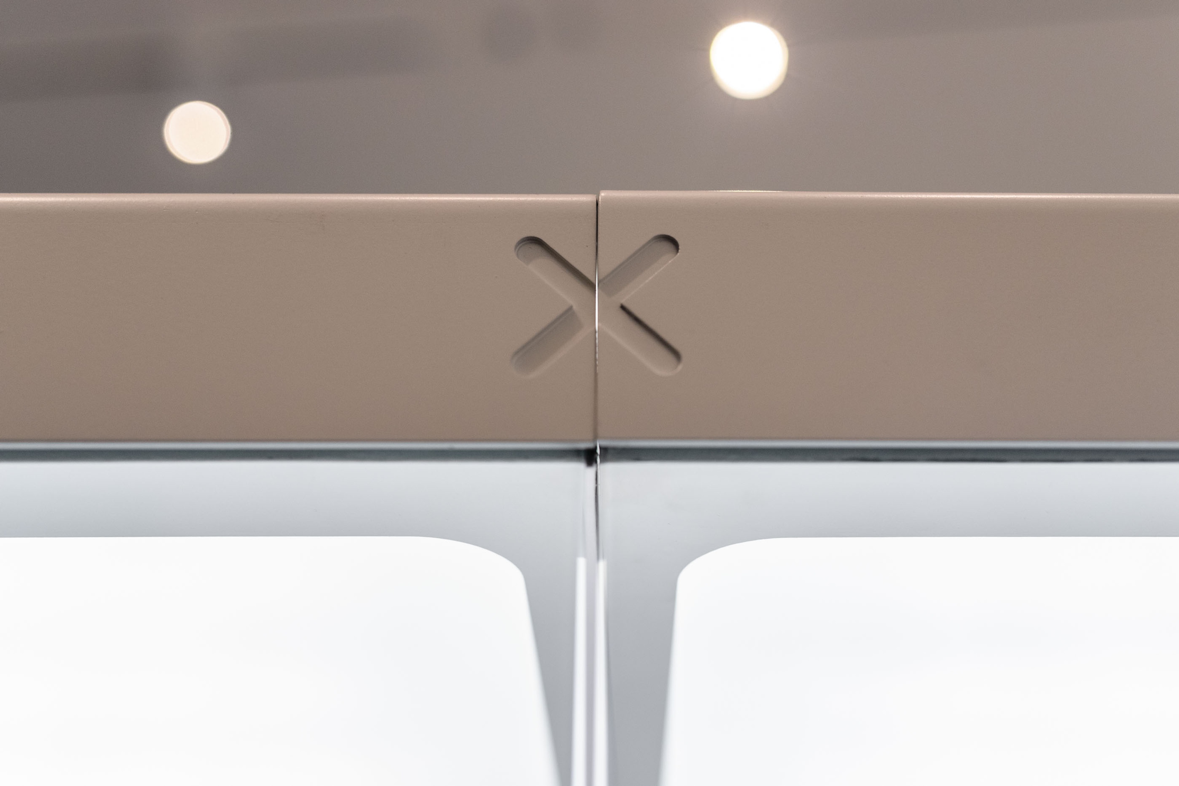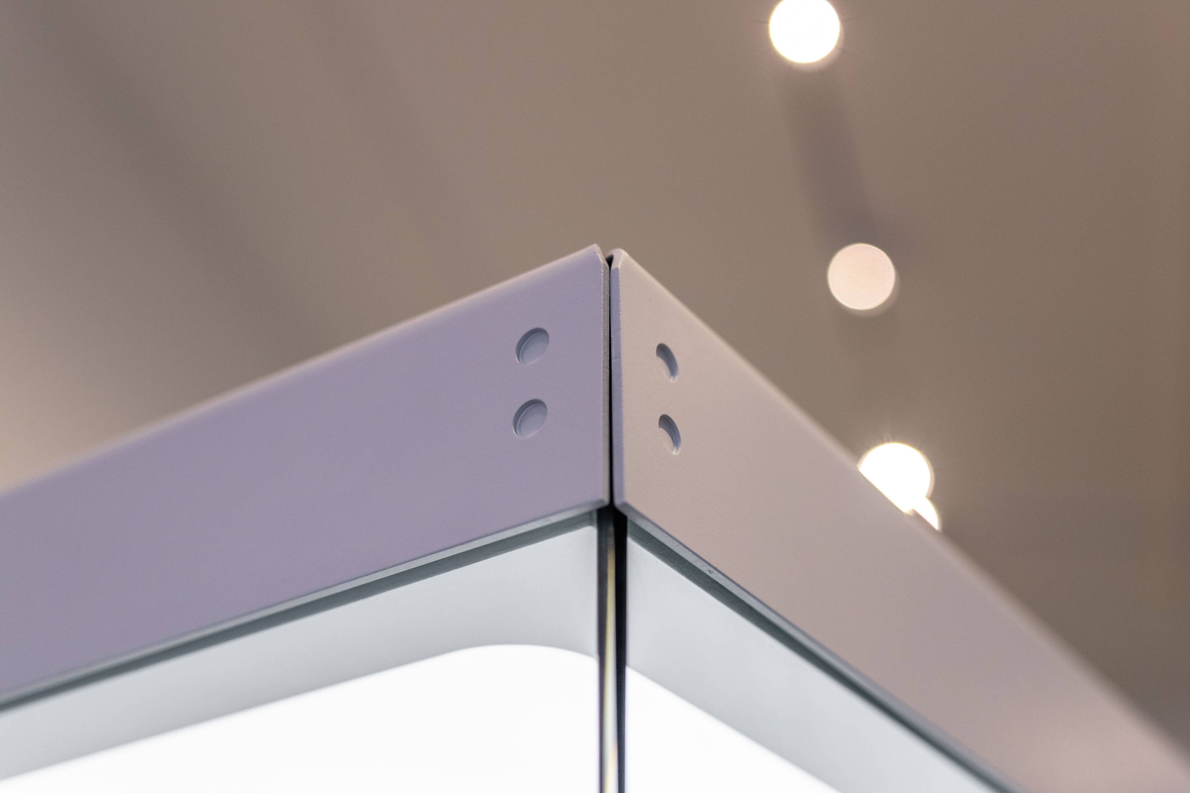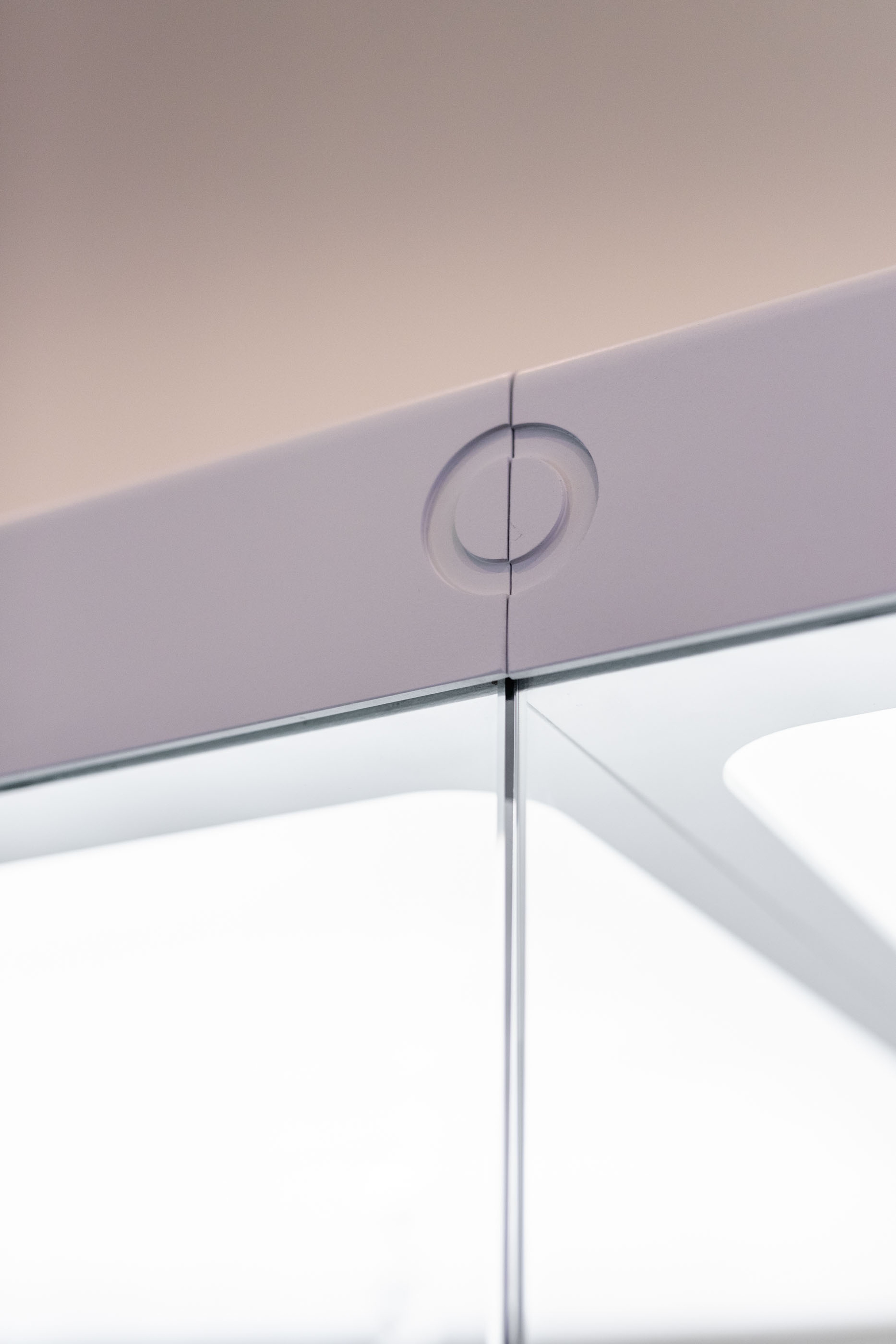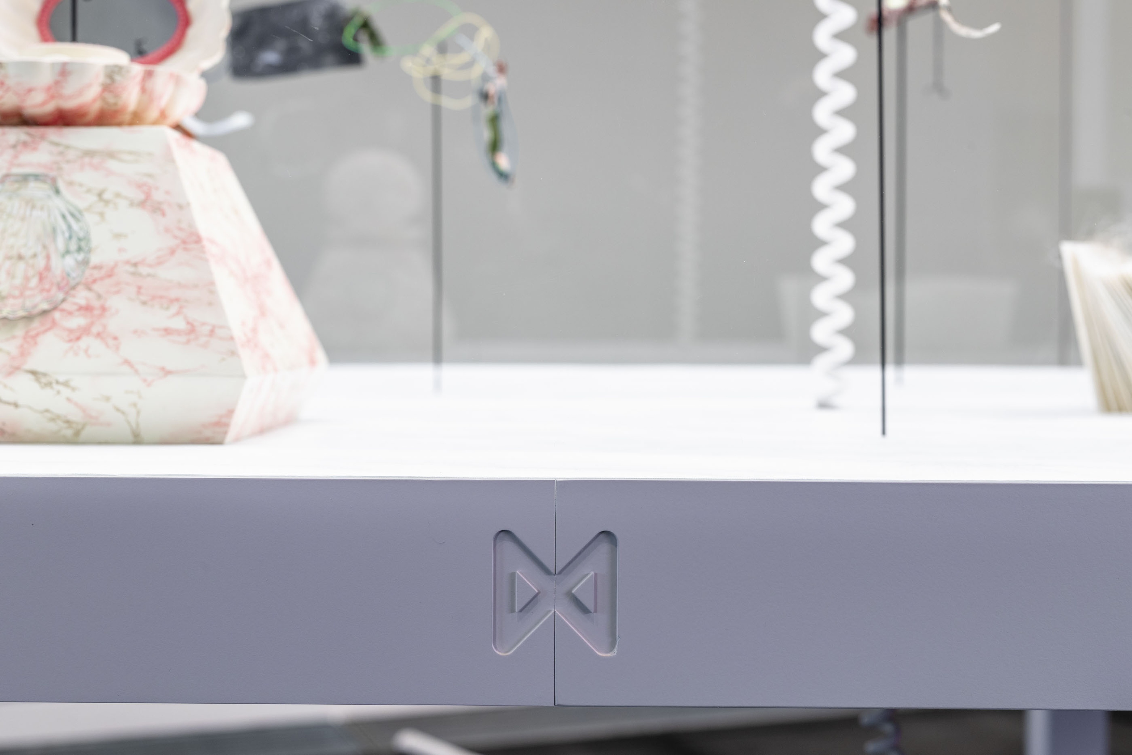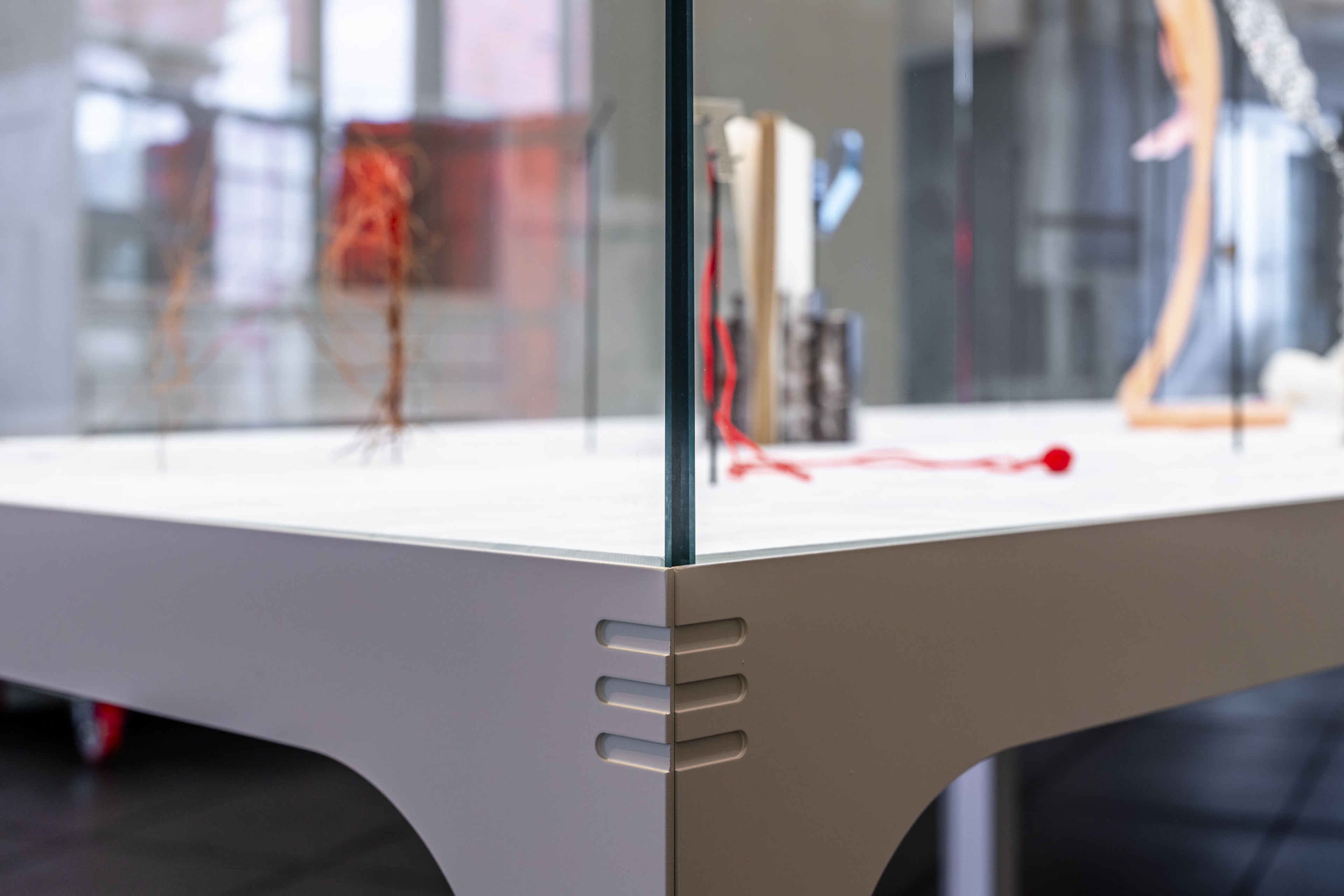 Sophia Smolenski, detail of vitrine, glass, acrylic, steel, paint, aluminium, MDF, Tyvek, 22 metal mounts, art works by 22 artists, 2023. Installation view, Sophia Smolenski: Offering It Up, in Back of House, Te Pātaka Toi Adam Art Gallery, Te Herenga Waka—Victoria University of Wellington, 2023. Photo: Ted Whitaker