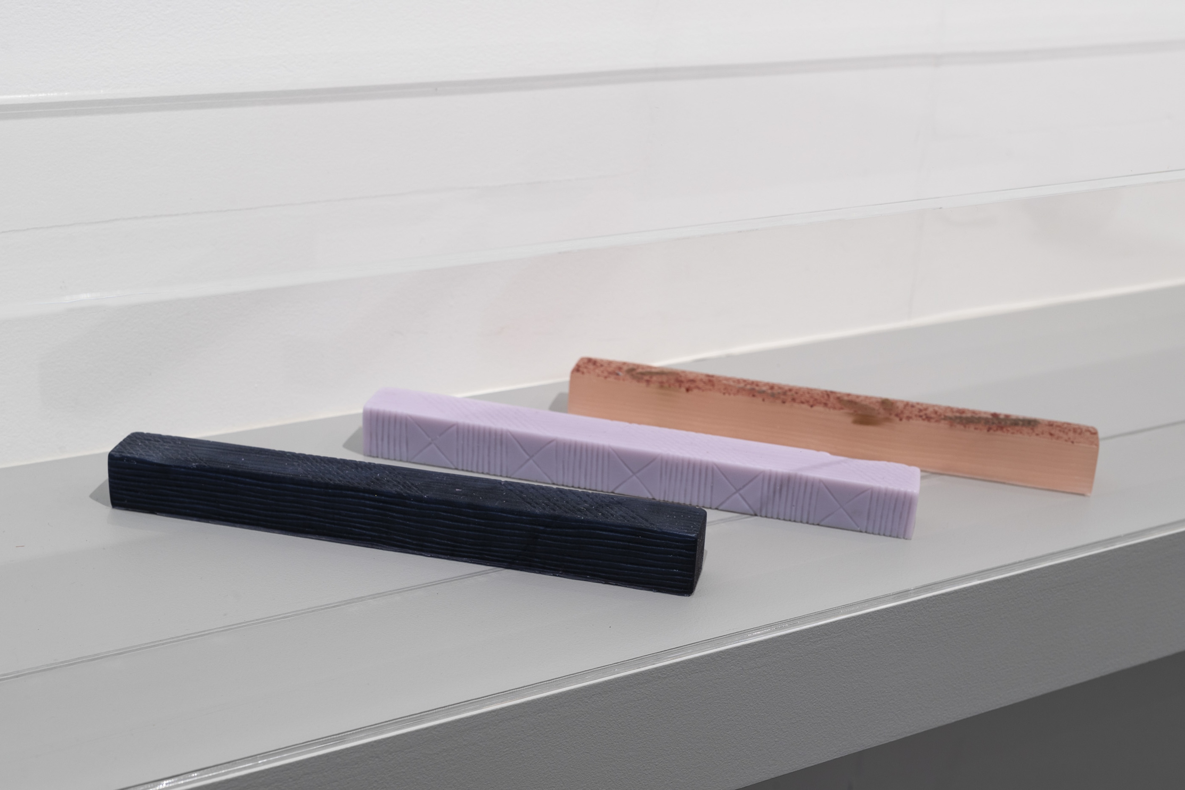 Cora-Allan, Ike, left to right, resin with black pigment and lilac pearl; resin with white pigment and lilac pearl; and resin with Māwhero pigment and faux leaves, courtesy of the artist. Installation view, Aro Toi / Art Collection in Focus: A Gift, A Celebration, An Invitation, in Back of House, Te Pātaka Toi Adam Art Gallery, Te Herenga Waka—Victoria University of Wellington, 2023. Photo: Ted Whitaker