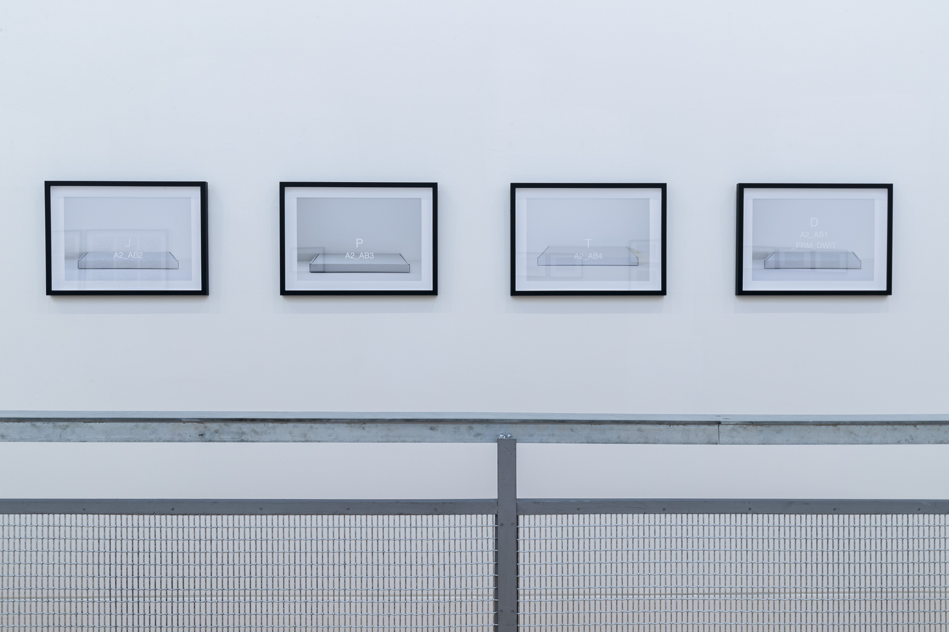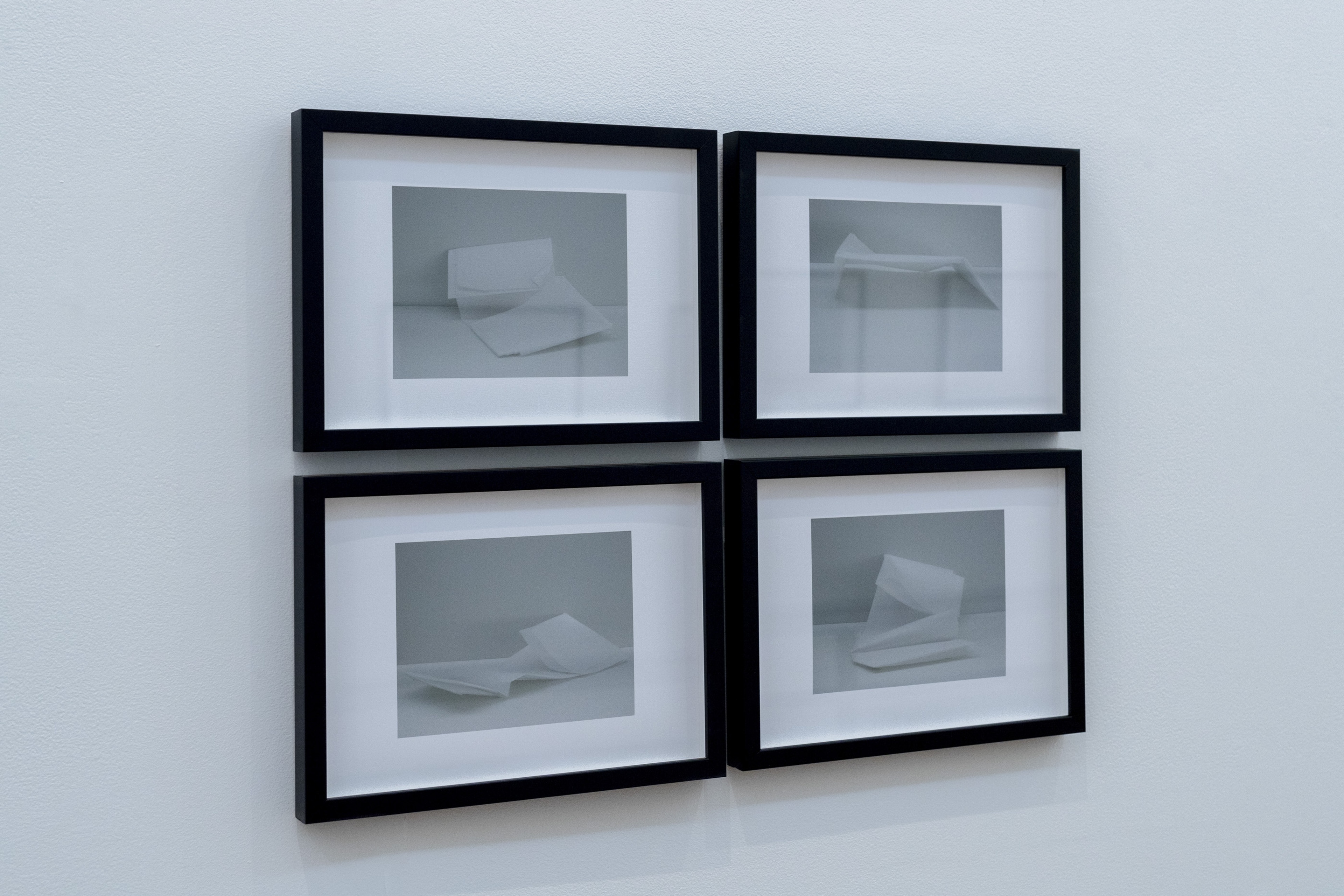Wendy Bornholdt, from series ERASURE, 2021, framed archival prints on Ilford Photo Rag, 4x 640 mm wide. Installation view, Wendy Bornholdt: Studioland, in Back of House, Te Pātaka Toi Adam Art Gallery, Te Herenga Waka—Victoria University of Wellington, 2023. Photo: Ted Whitaker