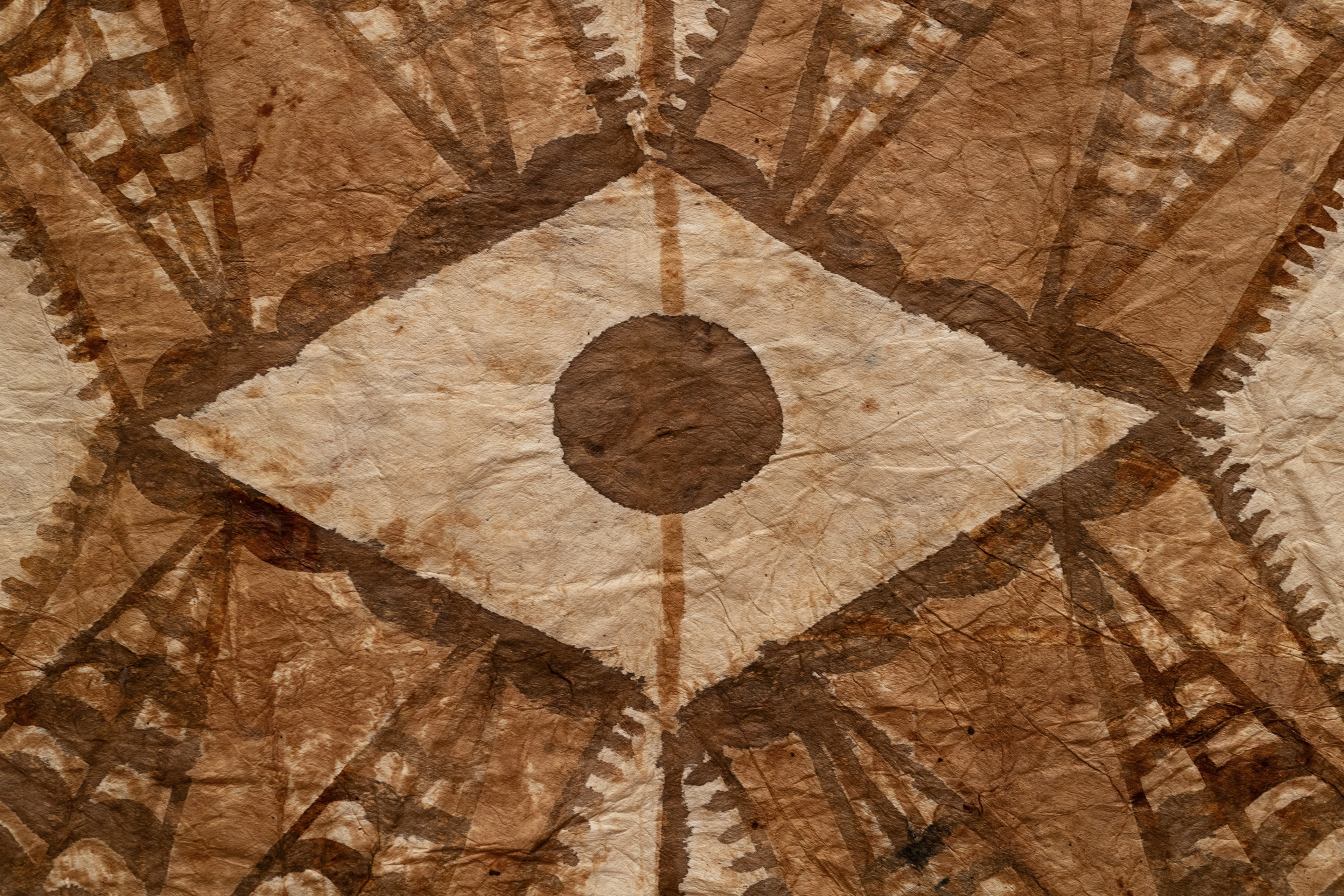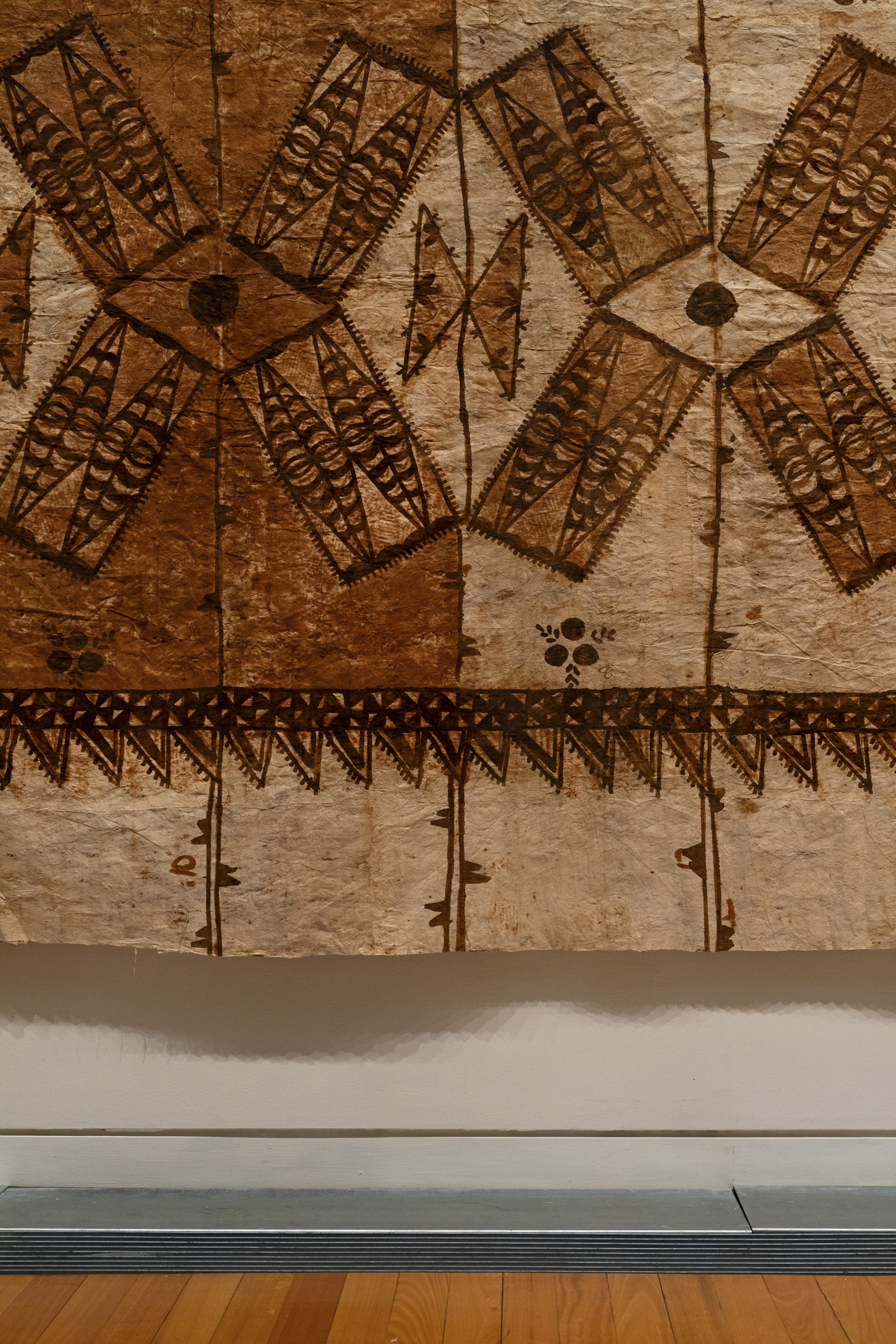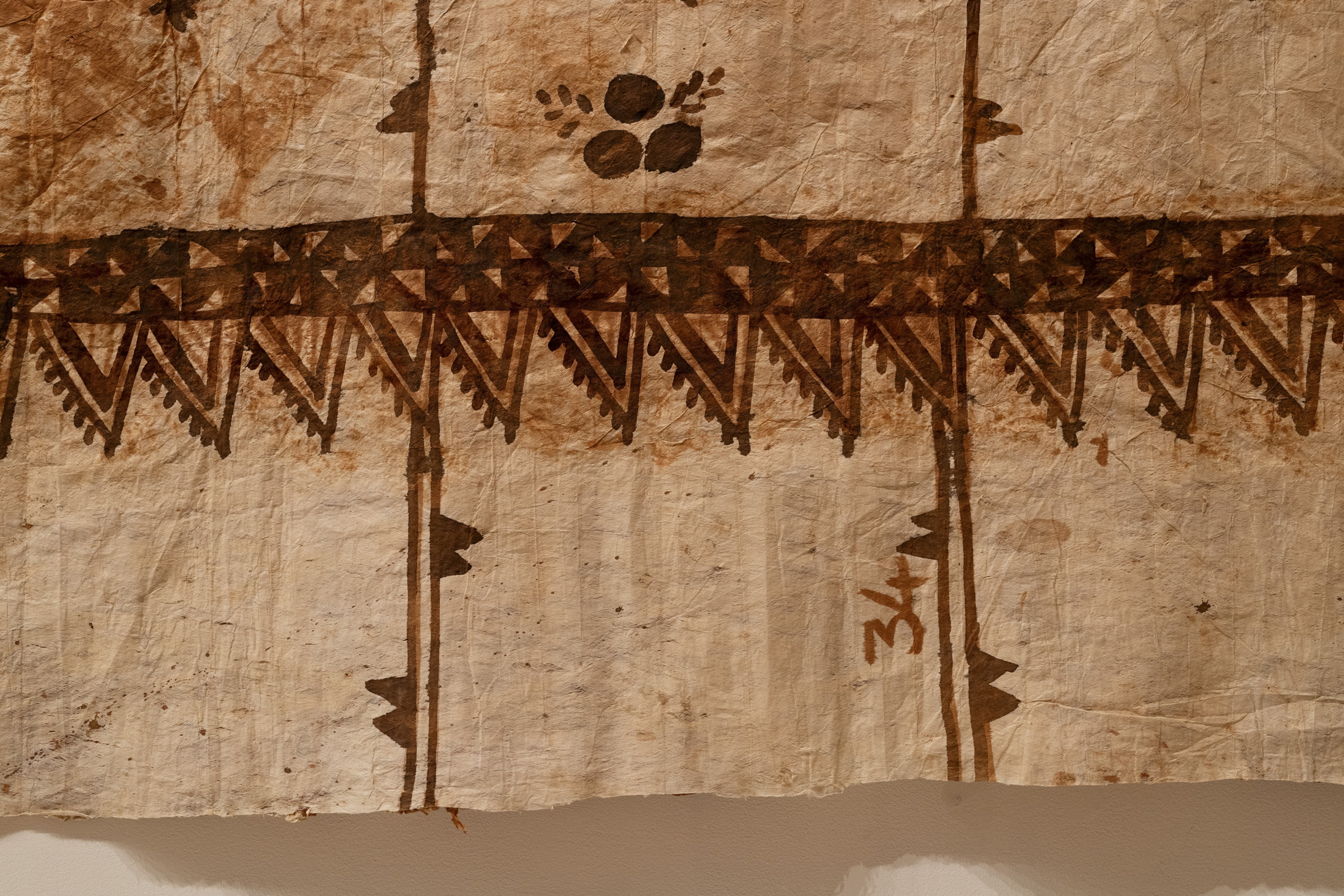 Kautaha Koka‘Anga, Tongan Village Collective, detail of Ngatu tāhina, launima, date unknown, Ngā Puhipuhi o Te Herenga Waka—Victoria University of Wellington Art Collection, gift of the University of the South Pacific, 1999. Installation view, Aro Toi / Art Collection in Focus: A Gift, A Celebration, An Invitation, in Back of House, Te Pātaka Toi Adam Art Gallery, Te Herenga Waka—Victoria University of Wellington, 2023. Photo: Ted Whitaker