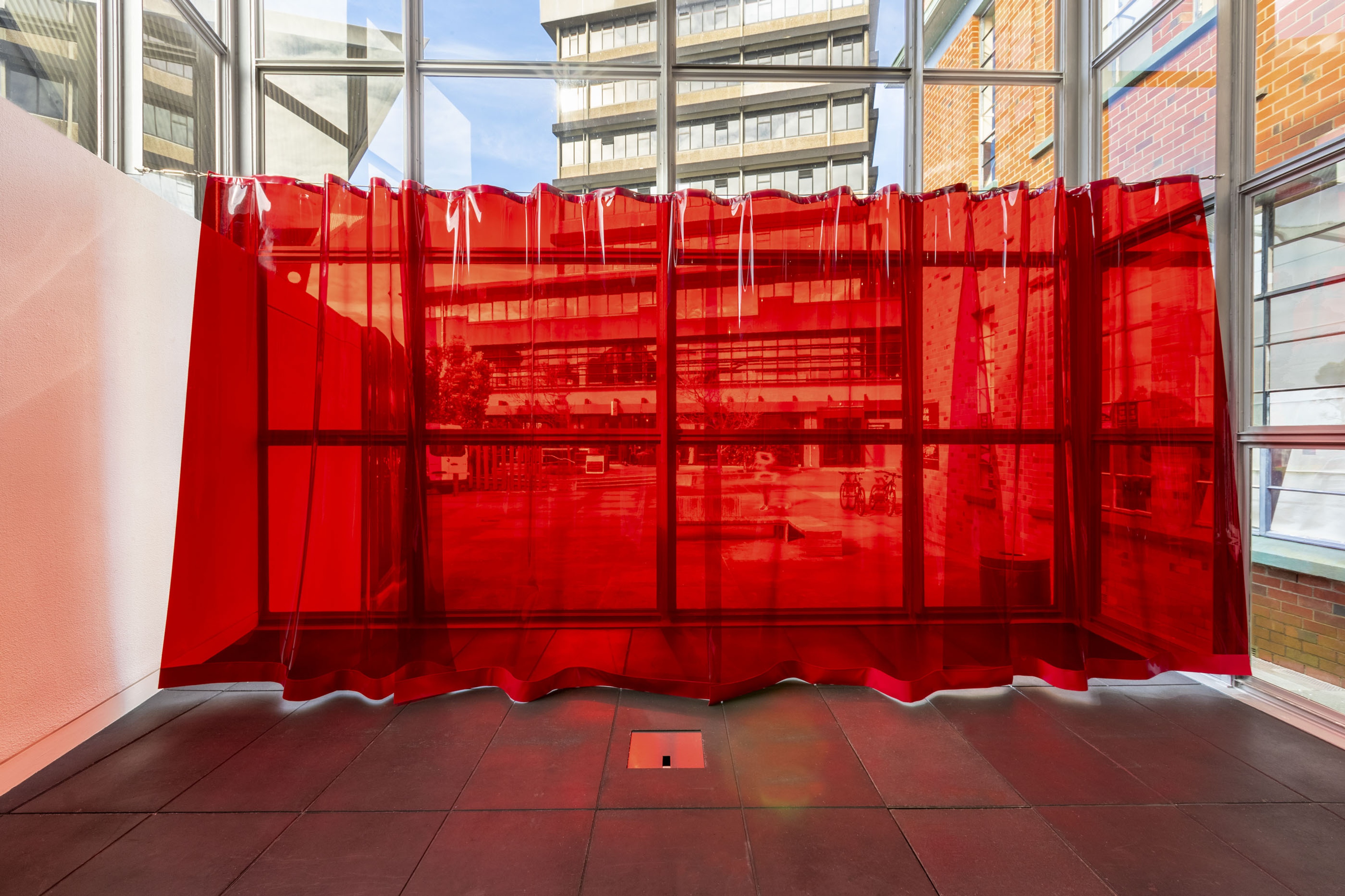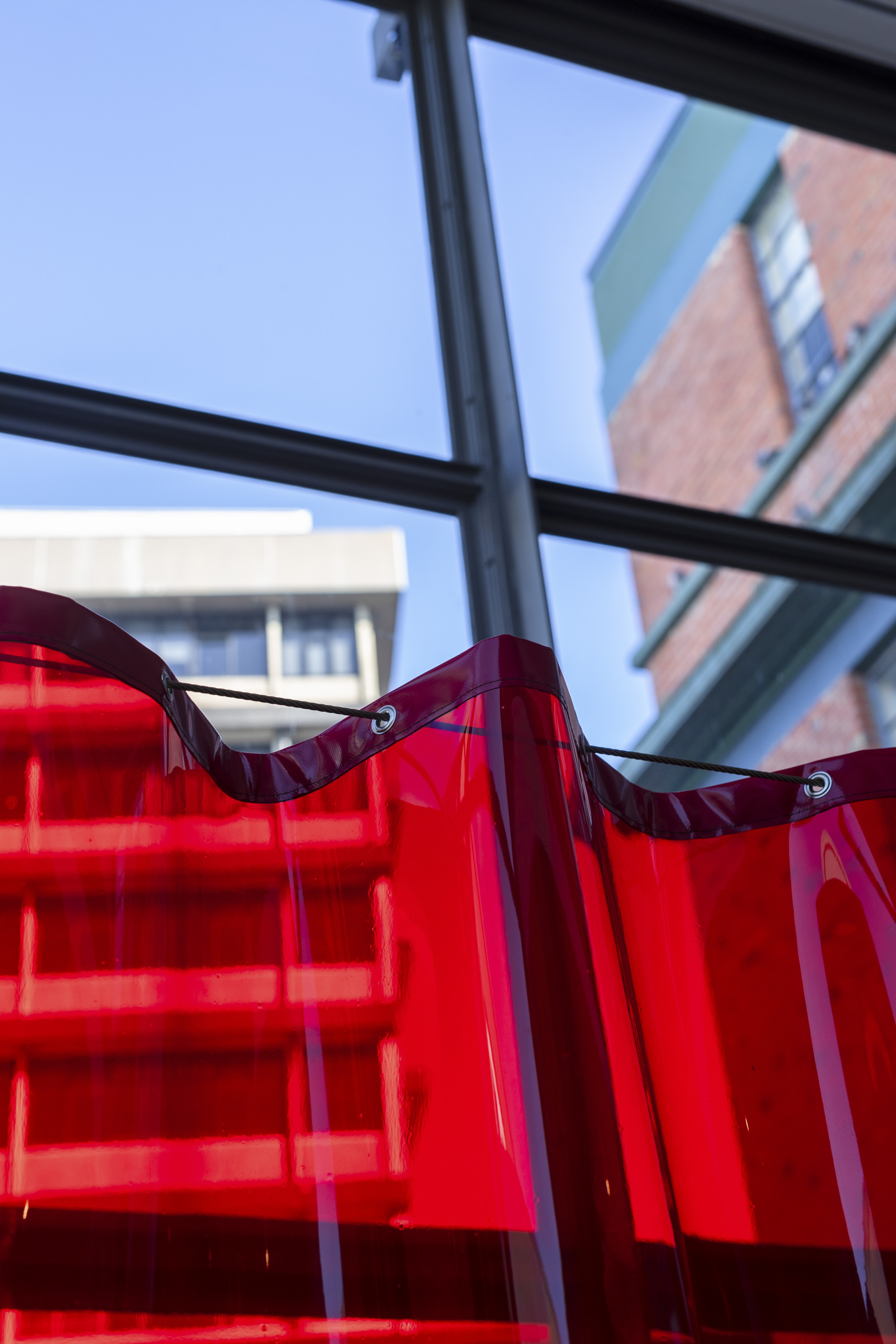 Sophia Smolenski, welder’s screen, fire resistant plastic, steel wire & eye bolts, 2023. Installation view, Sophia Smolenski: Offering It Up, in Back of House, Te Pātaka Toi Adam Art Gallery, Te Herenga Waka—Victoria University of Wellington, 2023. Photo: Ted Whitaker