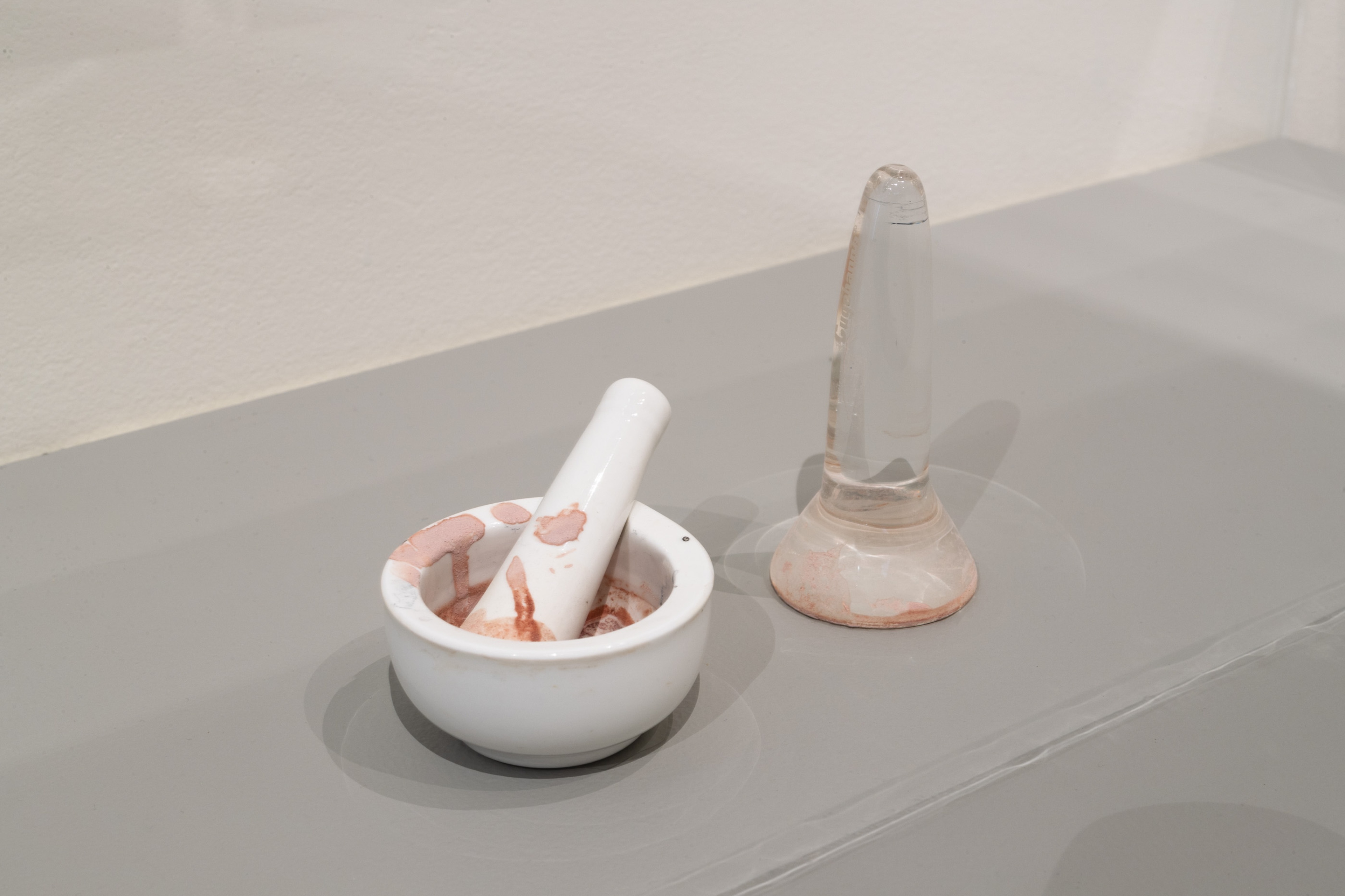 Cora-Allan, Glass Muller and Pestle & Mortar, courtesy of the artist. Installation view, Aro Toi / Art Collection in Focus: A Gift, A Celebration, An Invitation, in Back of House, Te Pātaka Toi Adam Art Gallery, Te Herenga Waka—Victoria University of Wellington, 2023. Photo: Ted Whitaker