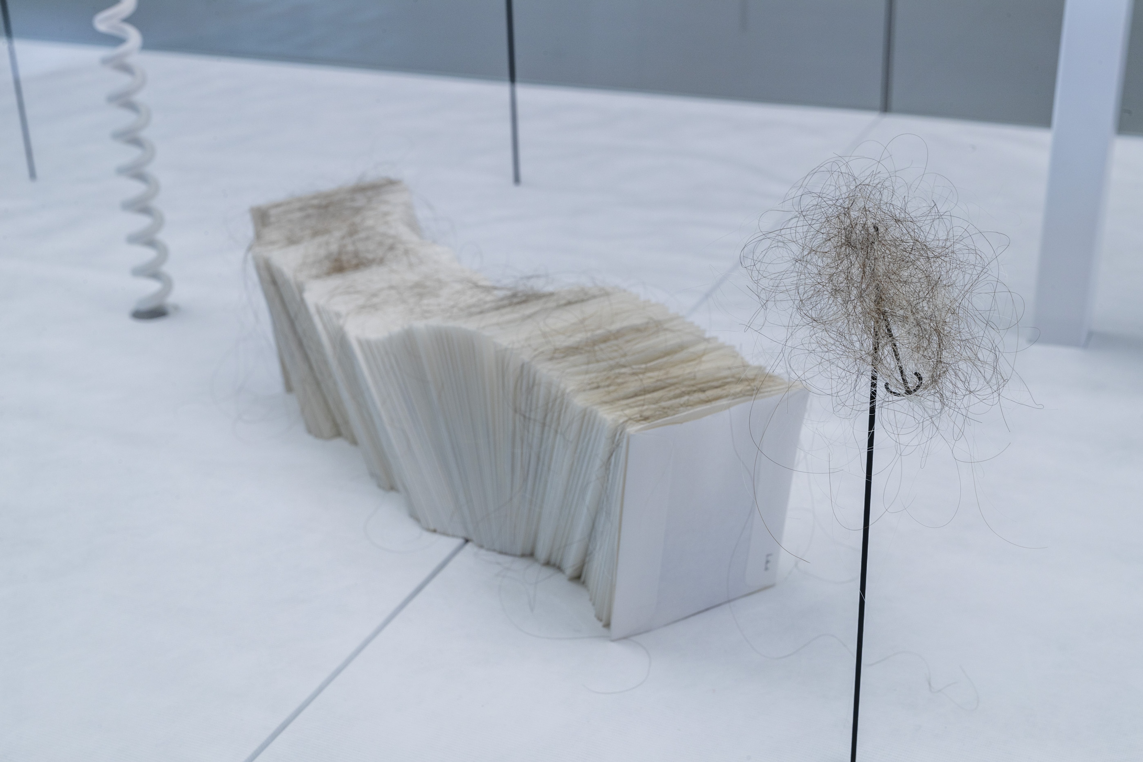 Catherine Griffiths, Self-preservation #108, 2022, human hair, archive #001-142, acid-free unbuffered paper packets, courtesy of the artist. Installation view, Sophia Smolenski: Offering It Up, in Back of House, Te Pātaka Toi Adam Art Gallery, Te Herenga Waka—Victoria University of Wellington, 2023. Photo: Ted Whitaker