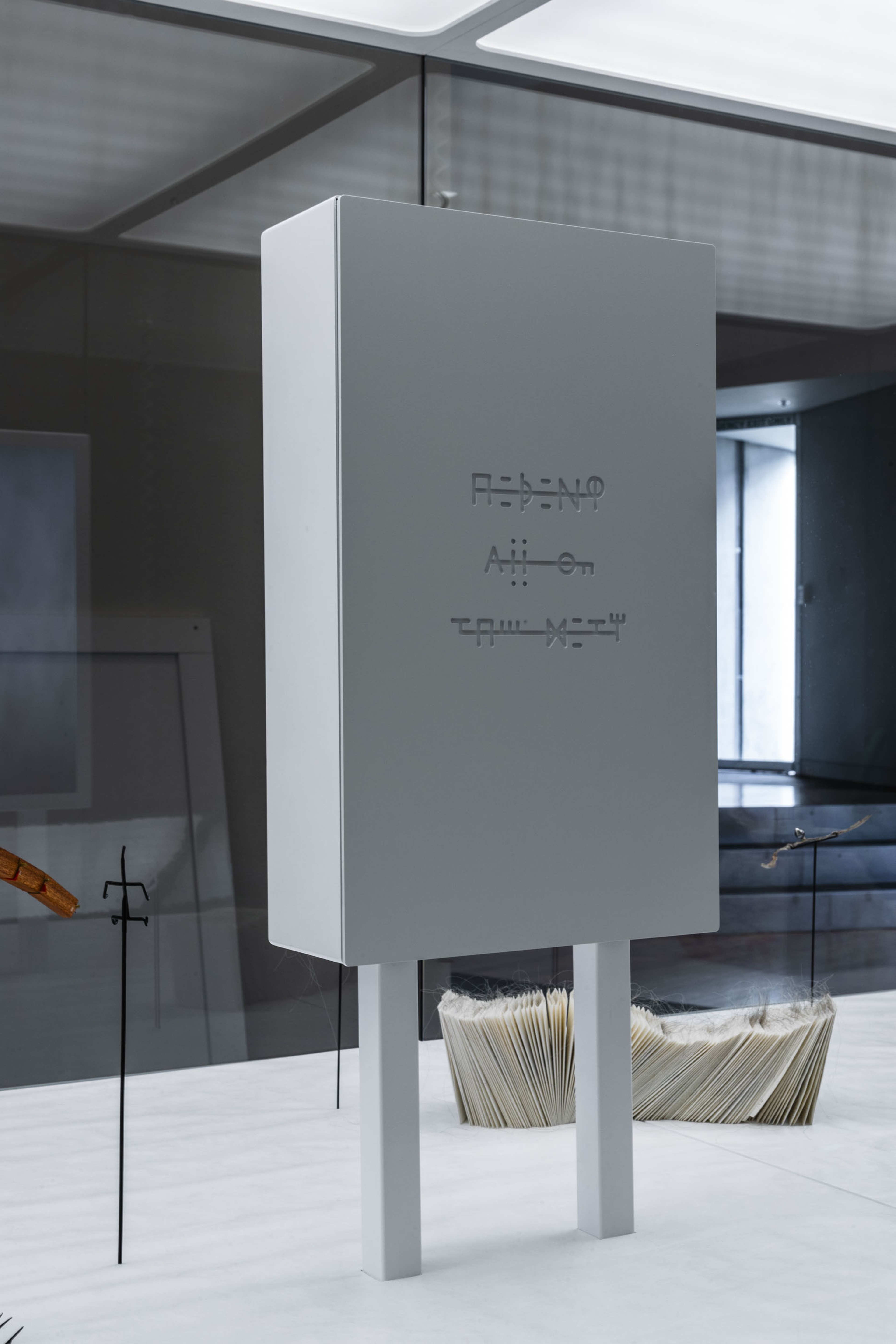 Sophia Smolenski, custom crate, stainless steel, paint, Tyvek, core-flute, PVC, personal items belonging to the artist, 2023. Installation view, Sophia Smolenski: Offering It Up, in Back of House, Te Pātaka Toi Adam Art Gallery, Te Herenga Waka—Victoria University of Wellington, 2023. Photo: Ted Whitaker