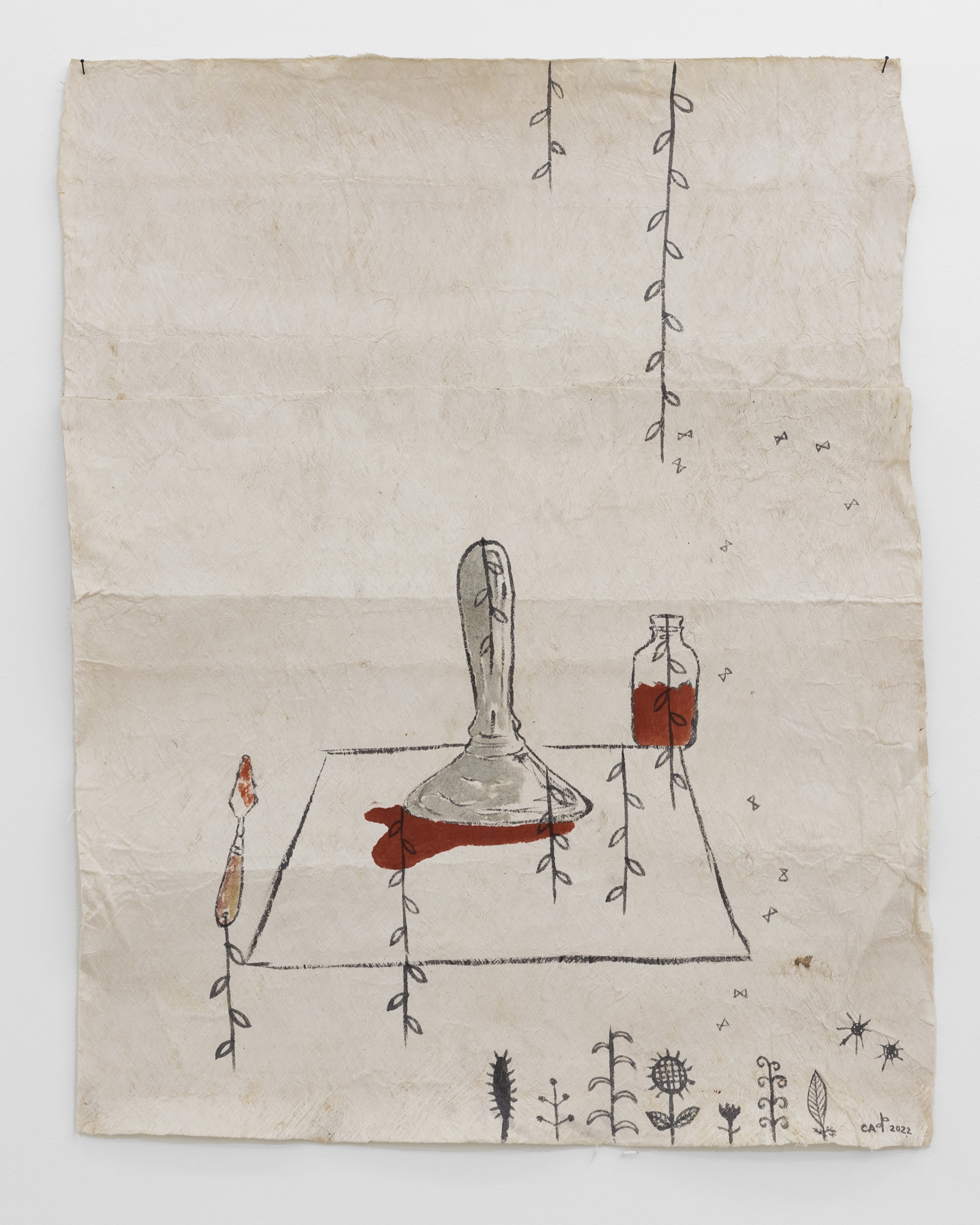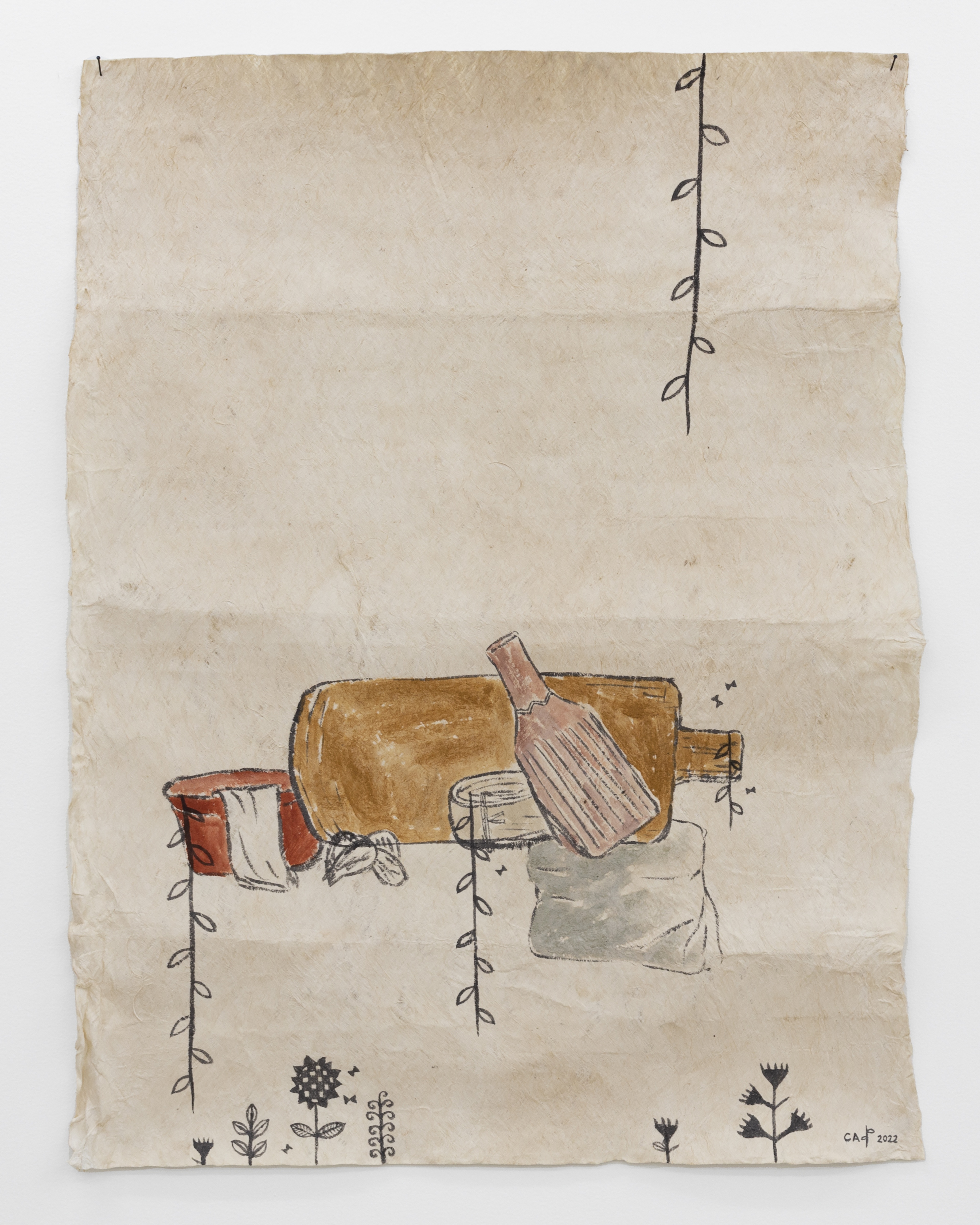 Cora-Allan, Whenua paint tools, 2022, whenua paint and kāpia ink on Hiapo, 760 x 600 mm, Ngā Puhipuhi o Te Herenga Waka—Victoria University of Wellington Art Collection, purchased as part of the 125 Celebrations 2022.