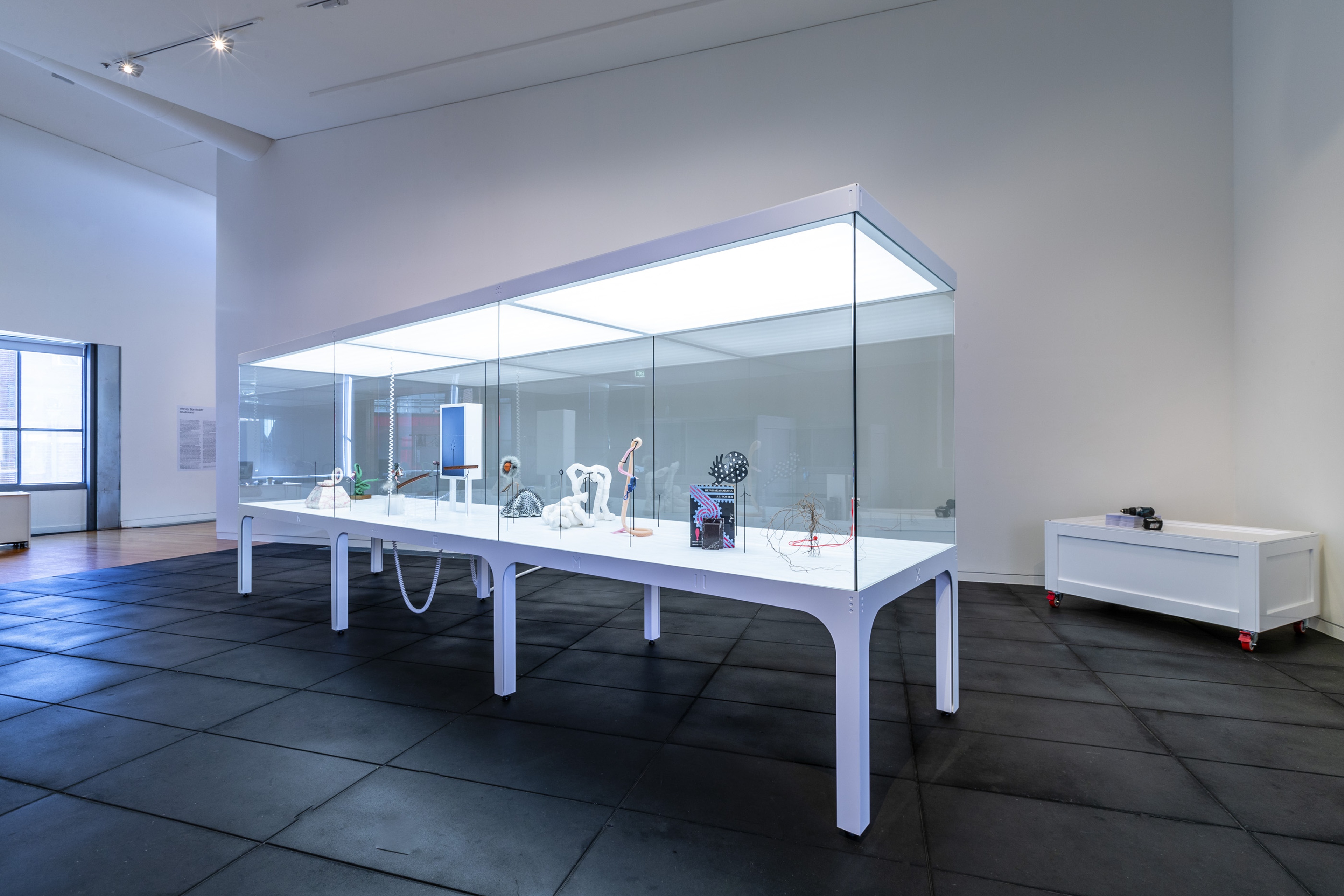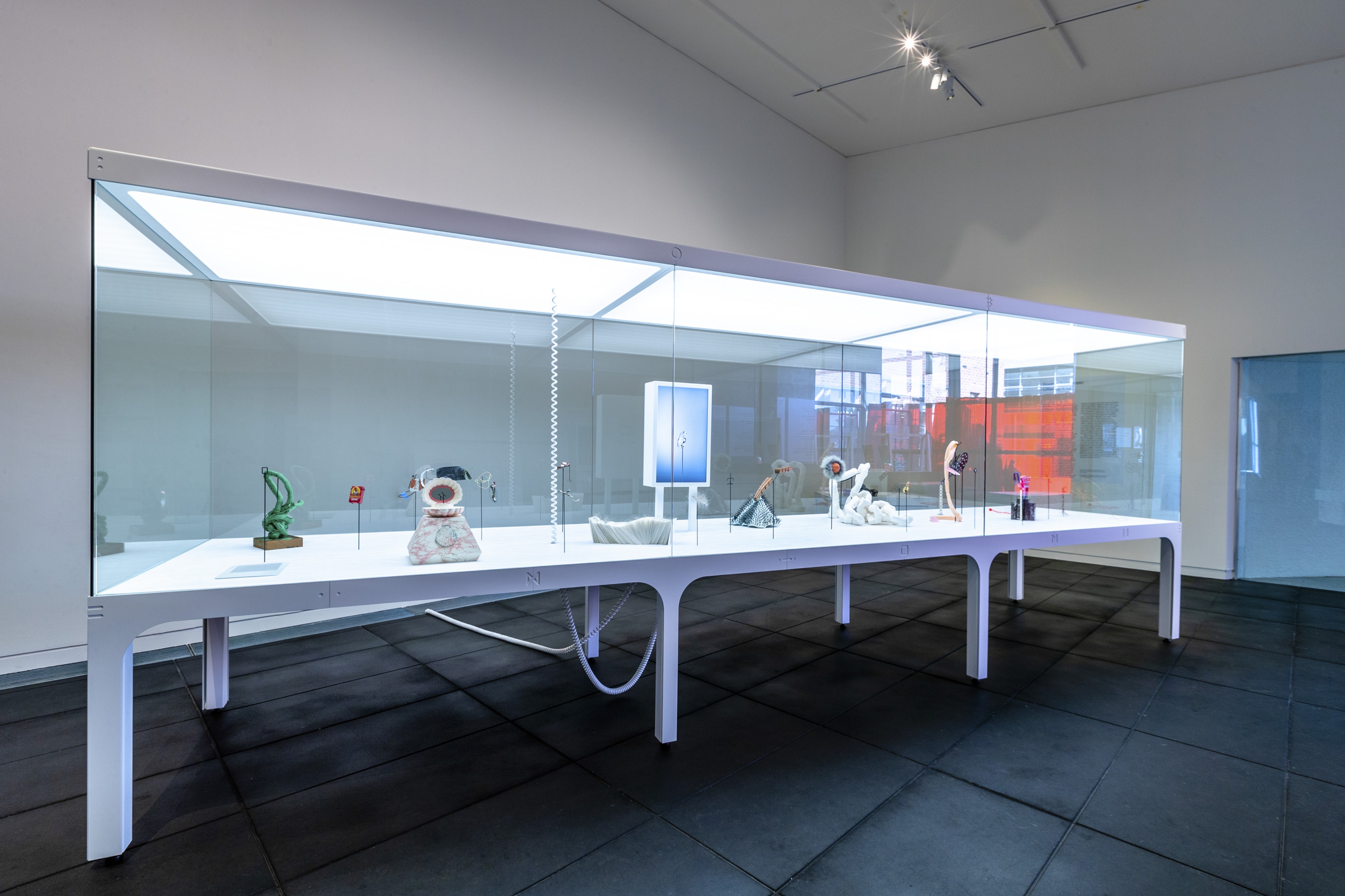 Sophia Smolenski, vitrine, glass, acrylic, steel, paint, aluminium, MDF, Tyvek, 22 metal mounts, art works by 22 artists, 2023. Installation view, Sophia Smolenski: Offering It Up, in Back of House, Te Pātaka Toi Adam Art Gallery, Te Herenga Waka—Victoria University of Wellington, 2023. Photo: Ted Whitaker
