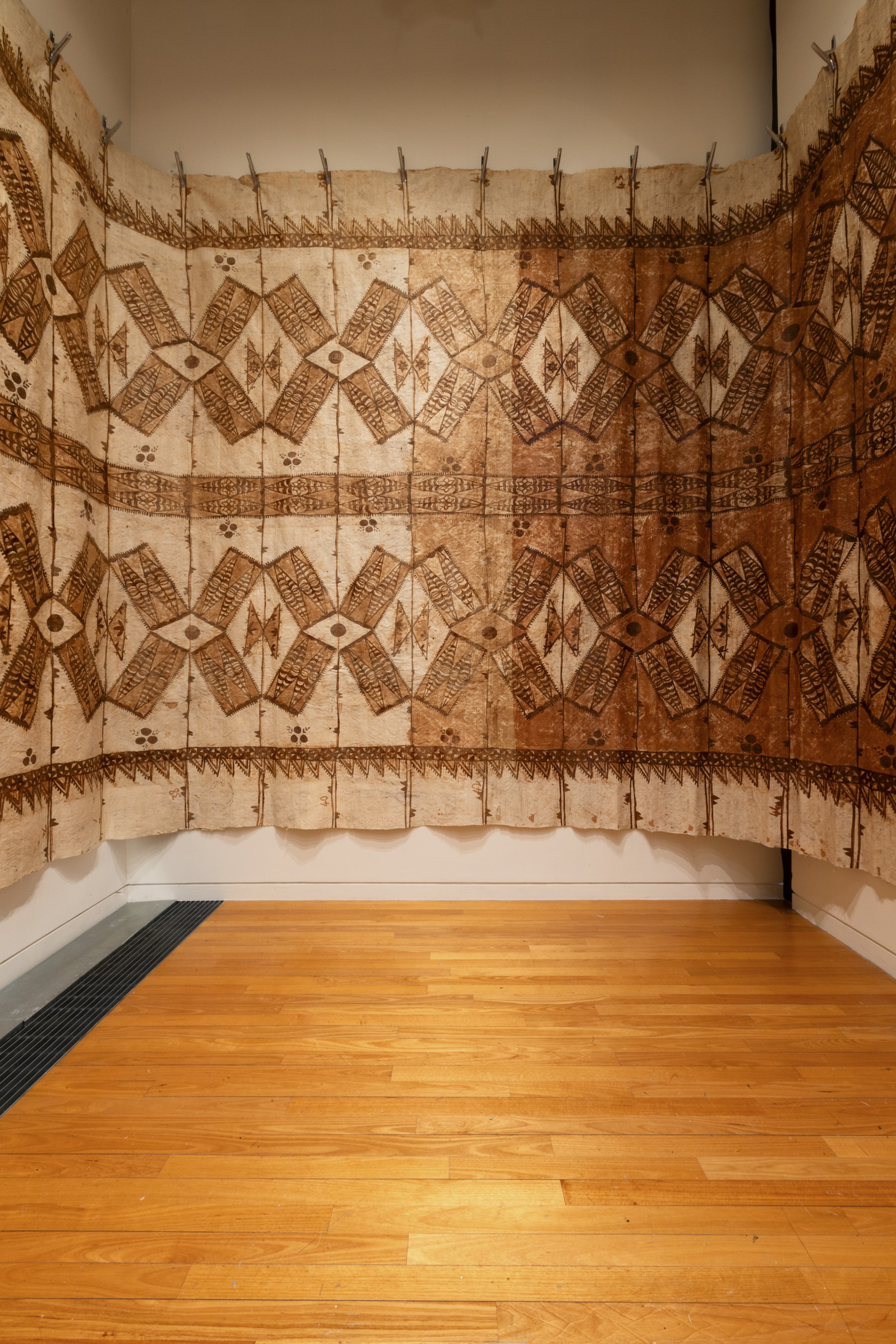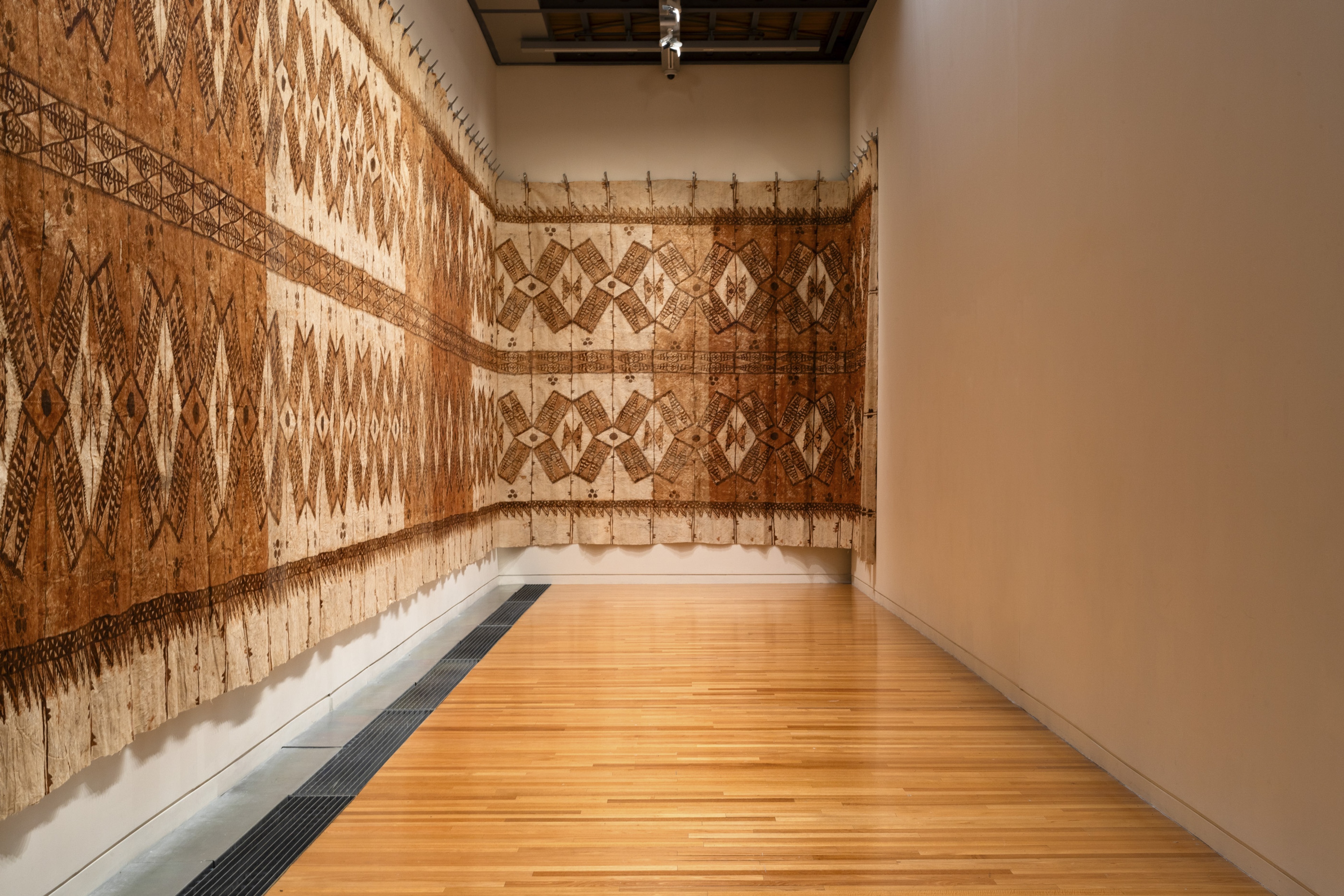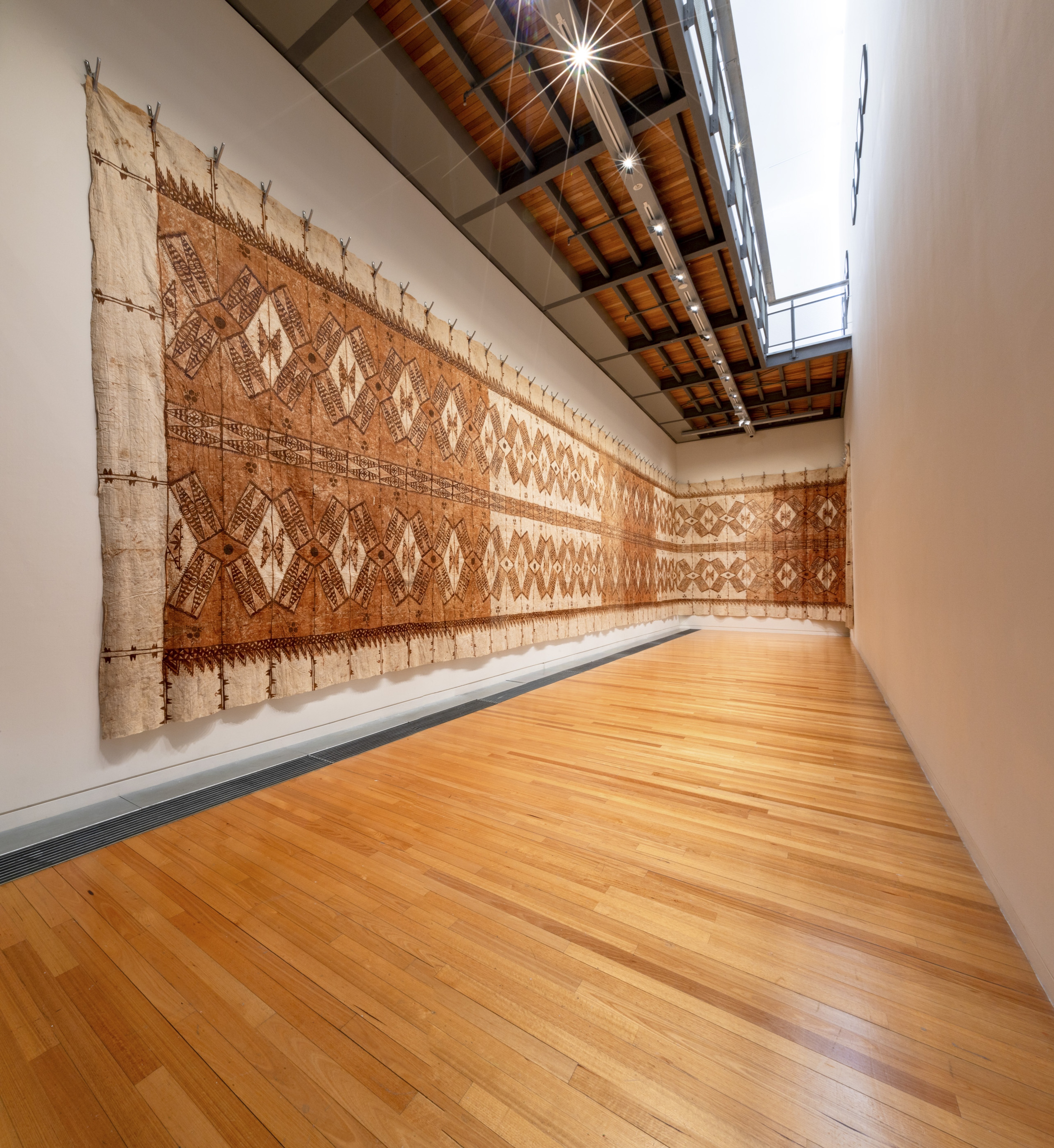 This is the second of two presentations in the Aro Toi / Art Collection in Focus series in the Gallery in 2023. It features three works on hiapo by Cora-Allan purchased in 2022 as part of the 125 celebrations at the University and a large Tongan ngatu gifted to the University as part of the centenary celebrations in 1999 by the University of the South Pacific. Situated in the Stairwell Gallery, Cora-Allan’s hiapo are accompanied by items borrowed from the artist for the occasion: shells, ike (tapa beaters) which she has been casting from resin, whenua pigment and videos of the artist’s technique for gathering kāpia ink. Wrapping the Lower Chartwell Gallery, the complete 50 langanga launima ngatu is on display for the first time since going into storage in 2008. The occasion serves as an opportunity to find out more about the ngatu and the ‘unknown Tongan village collective’ listed as the object’s makers. In addition, an invitation to New Zealand-born Tongan artist, 'Uhila Moe Langi Nai has been extended to develop a response to the ngatu that will be integrated into the Gallery’s future programme.