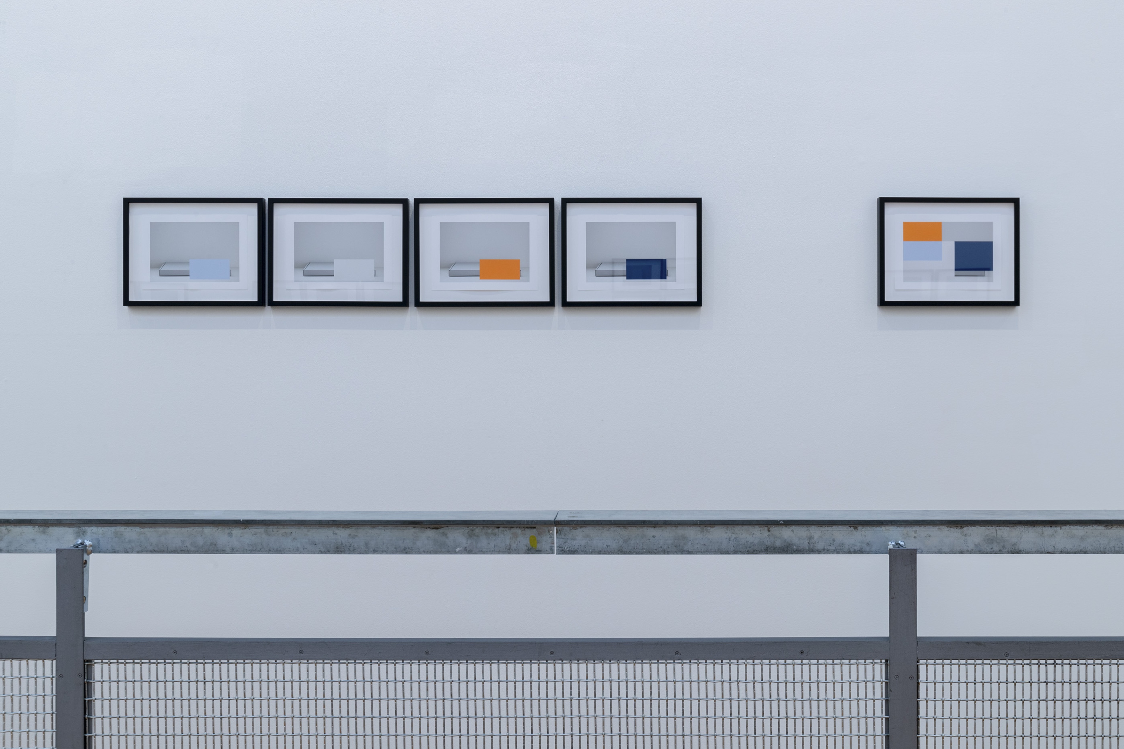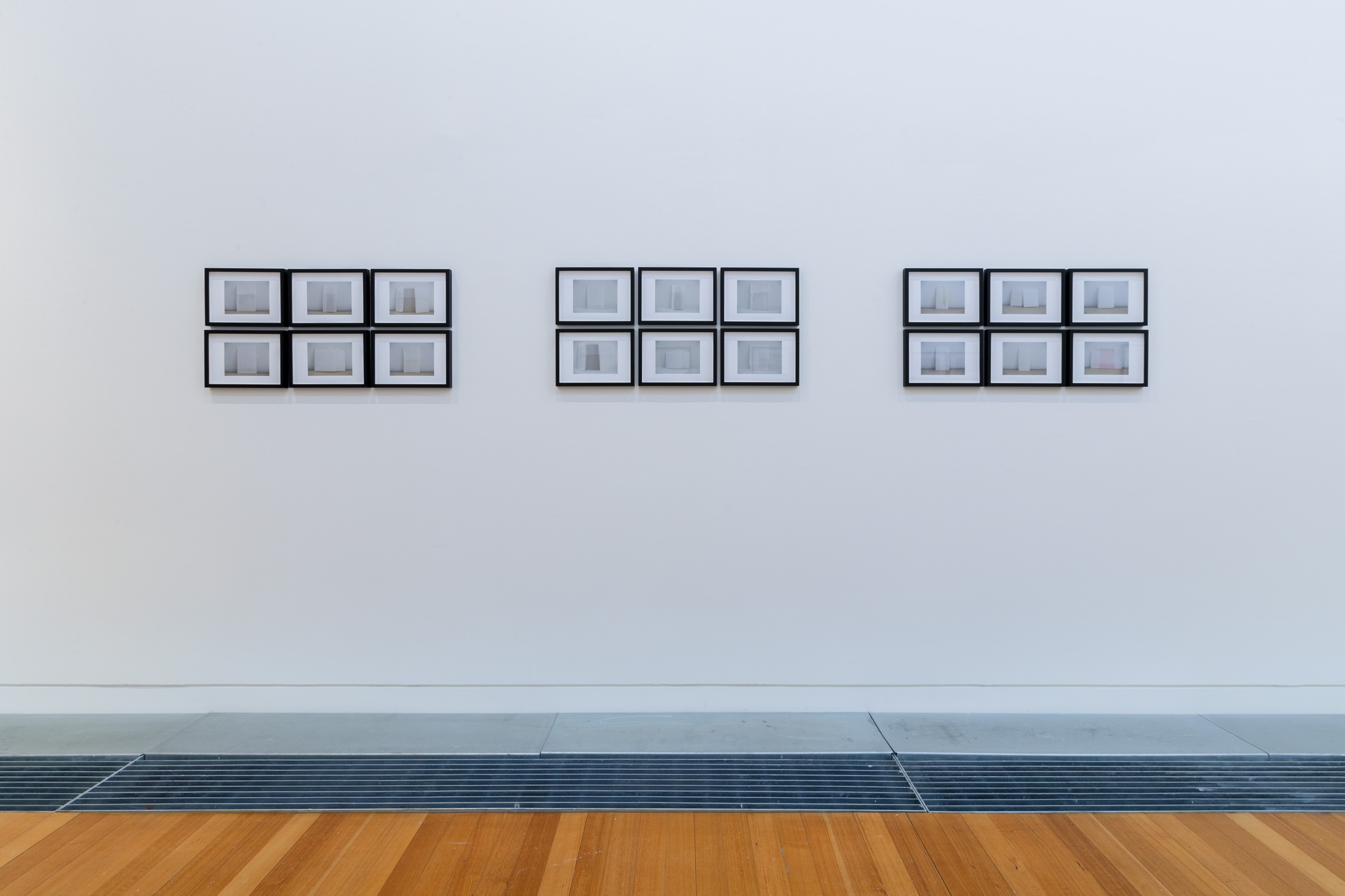 Wendy Bornholdt, from series DWiT_Action, 2017-18, framed archival prints on Ilford Photo Rag, various widths. Installation view, Wendy Bornholdt: Studioland, in Back of House, Te Pātaka Toi Adam Art Gallery, Te Herenga Waka—Victoria University of Wellington, 2023. Photo: Ted Whitaker