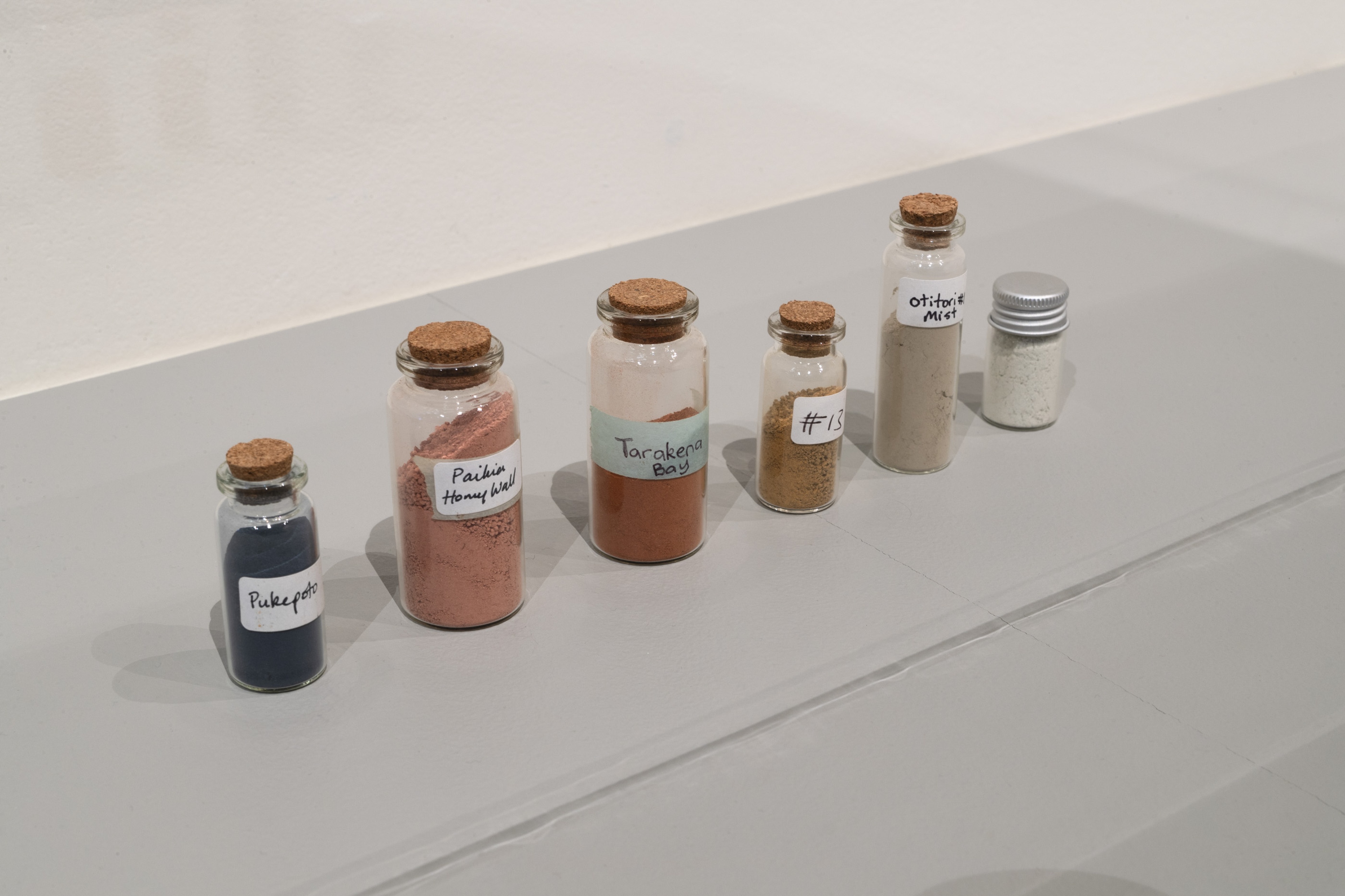 Cora-Allan, Whenua Pigments: Pukepoto; Paikia – Honey Wall; Tarakena Bay; #13; Otitori #1 Mist, courtesy of the artist. Installation view, Aro Toi / Art Collection in Focus: A Gift, A Celebration, An Invitation, in Back of House, Te Pātaka Toi Adam Art Gallery, Te Herenga Waka—Victoria University of Wellington, 2023. Photo: Ted Whitaker