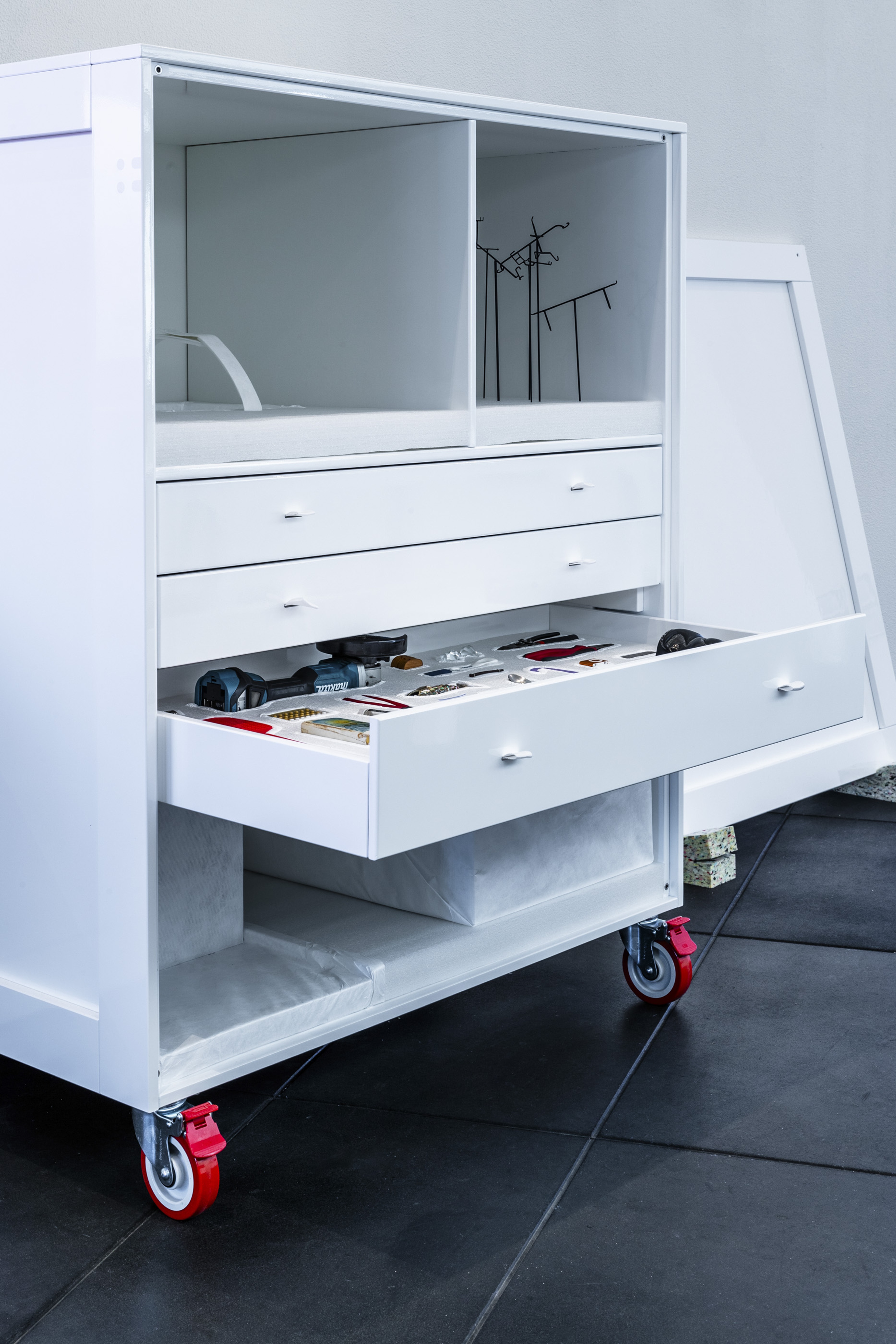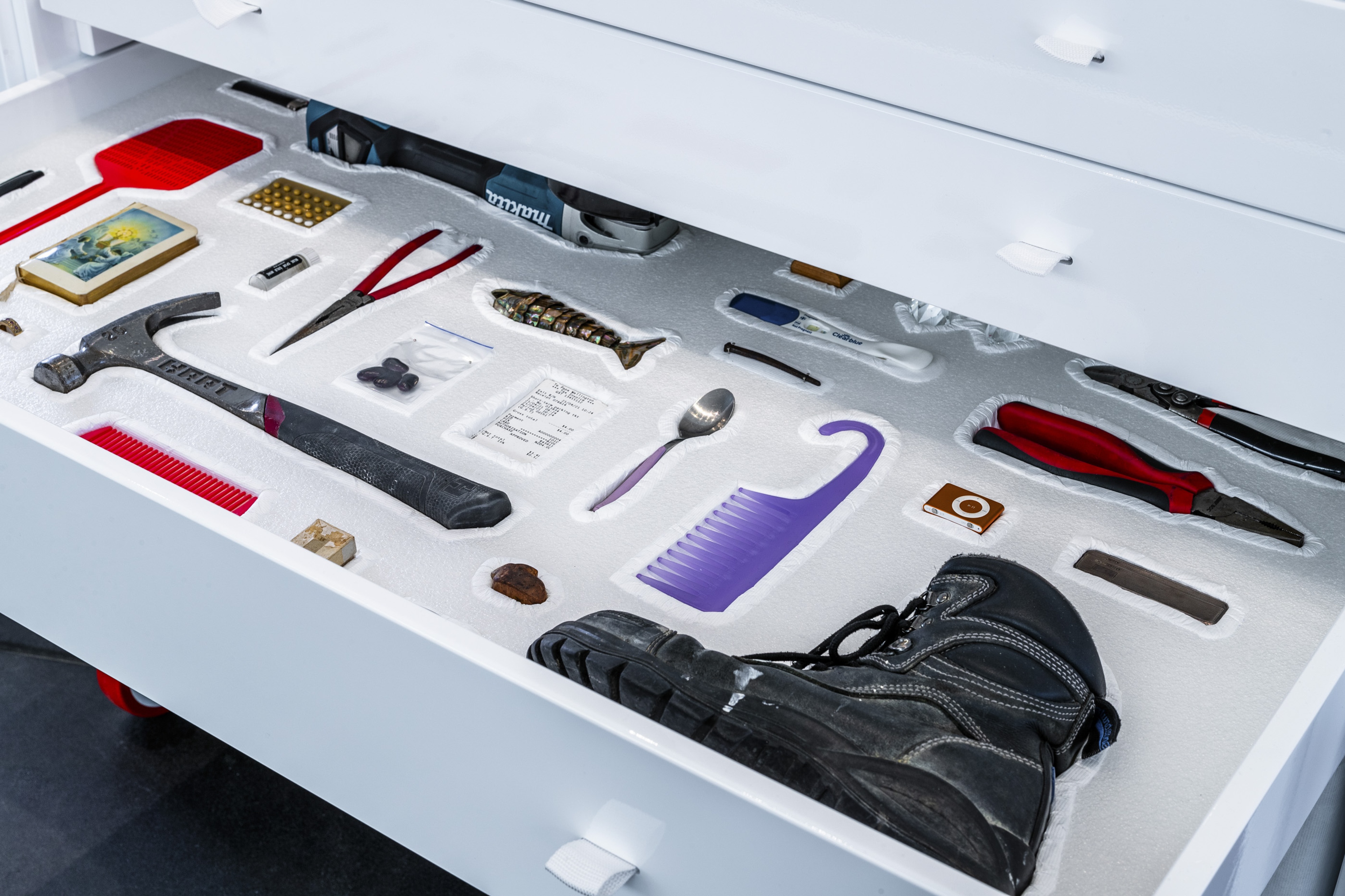 Sophia Smolenski, detail of custom crate, stainless steel, paint, Tyvek, core-flute, PVC, personal items belonging to the artist, 2023. Installation view, Sophia Smolenski: Offering It Up, in Back of House, Te Pātaka Toi Adam Art Gallery, Te Herenga Waka—Victoria University of Wellington, 2023. Photo: Ted Whitaker