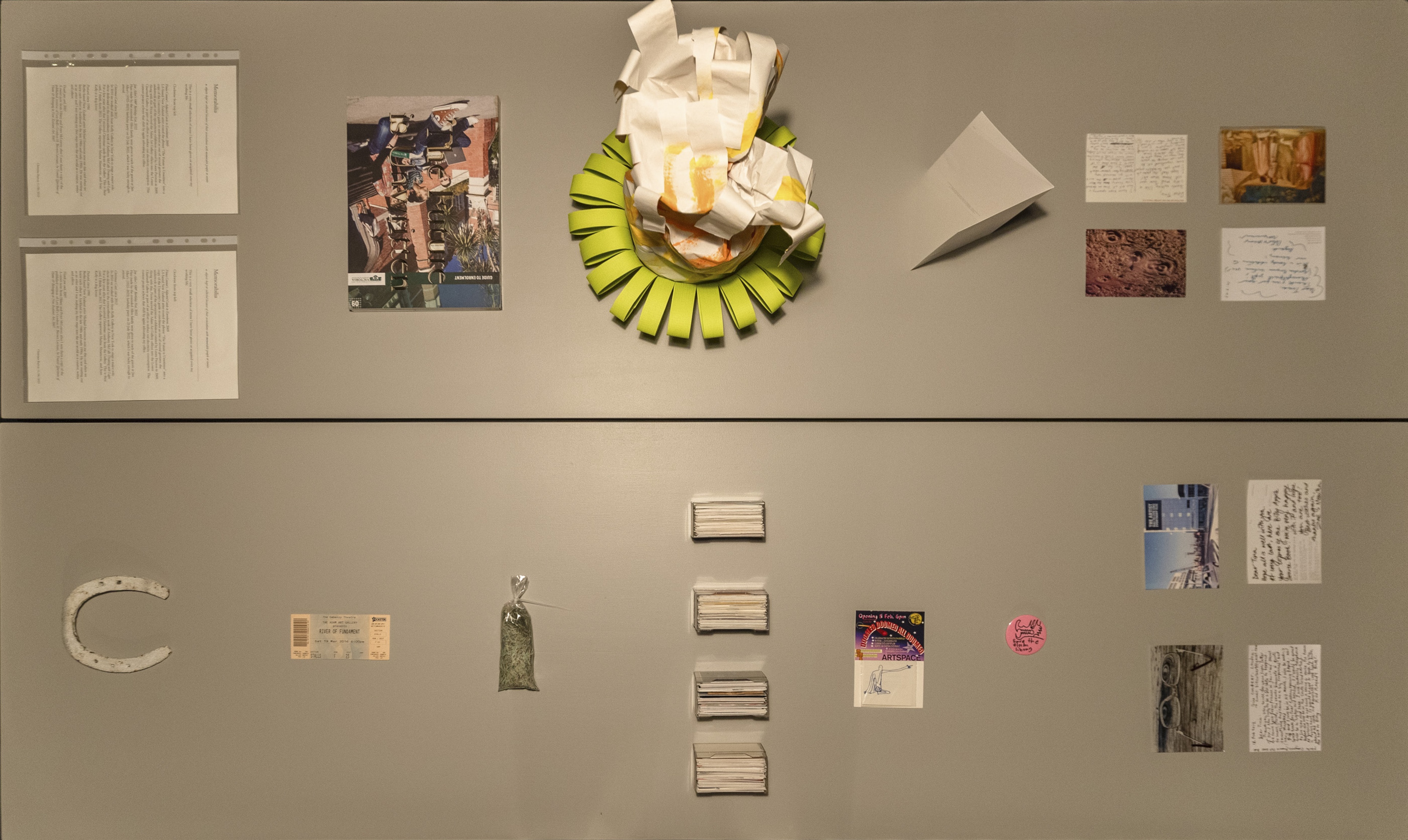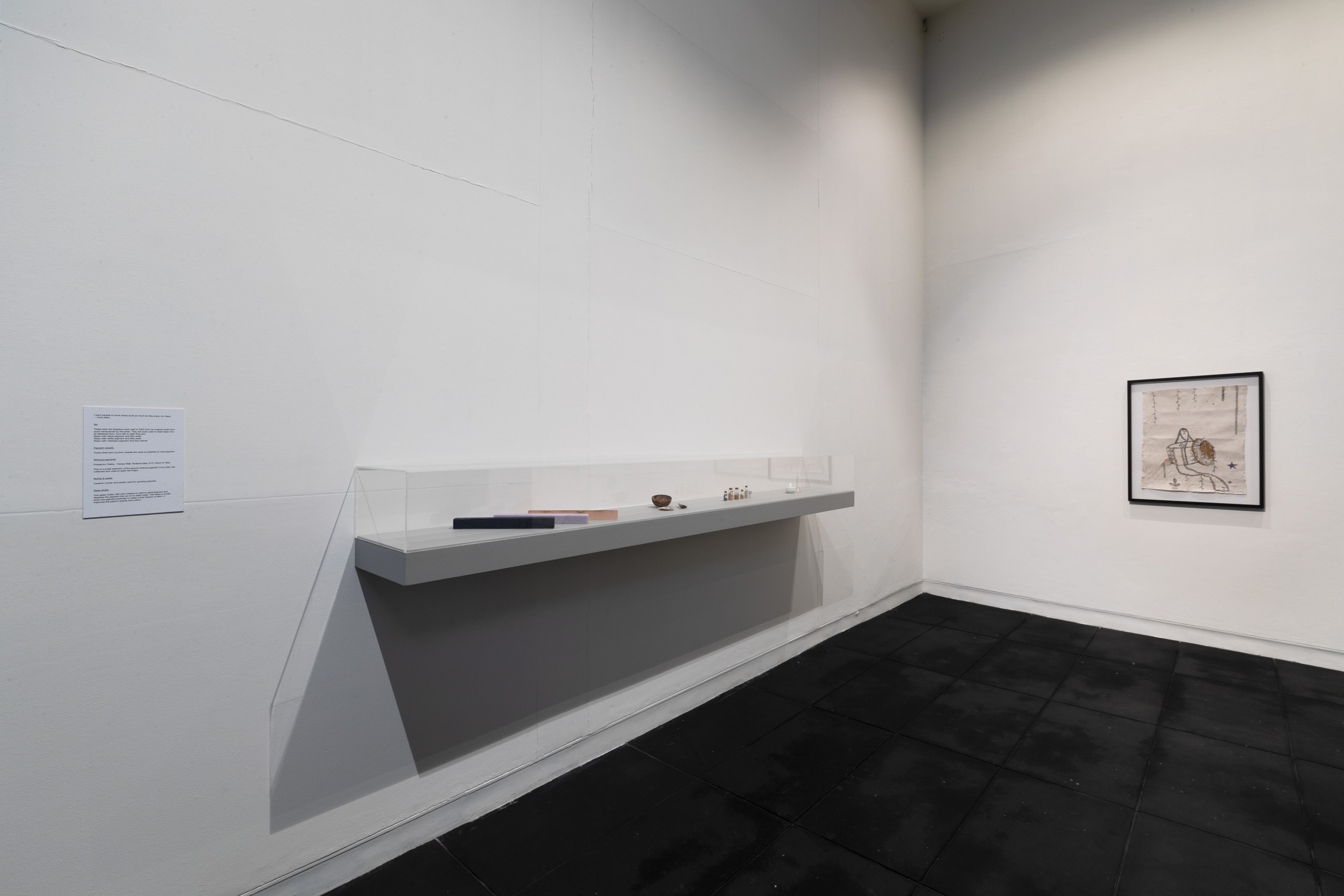 Detail of archival items, installation view, Work in Progress, in Back of House, Te Pātaka Toi Adam Art Gallery, Te Herenga Waka—Victoria University of Wellington, 2023. Photo: Ted Whitaker