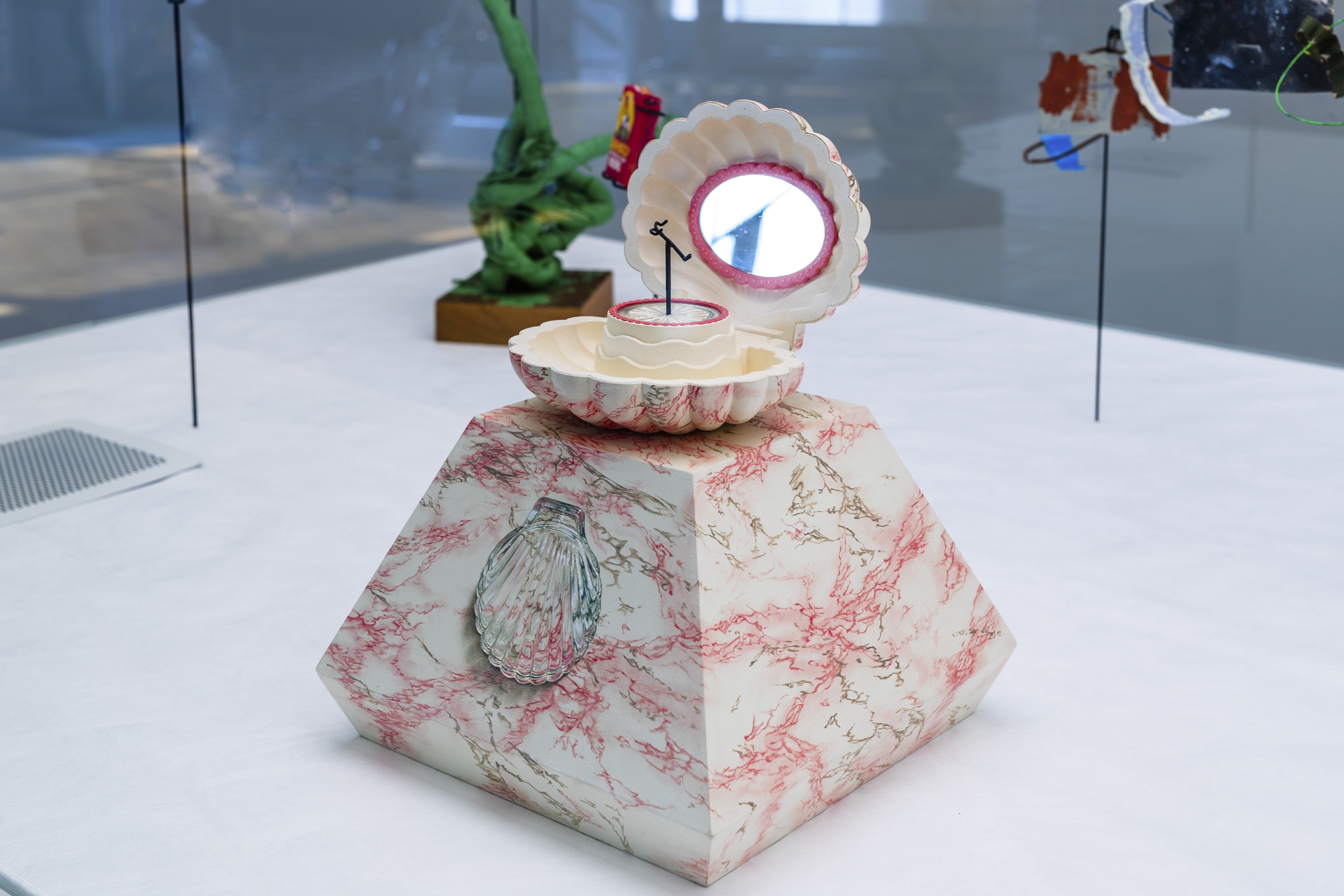 Emily Hartley-Skudder, Birth of Venus, 2022, oil on board, plastic, electric motor, courtesy of the artist. Installation view, Sophia Smolenski: Offering It Up, in Back of House, Te Pātaka Toi Adam Art Gallery, Te Herenga Waka—Victoria University of Wellington, 2023. Photo: Ted Whitaker