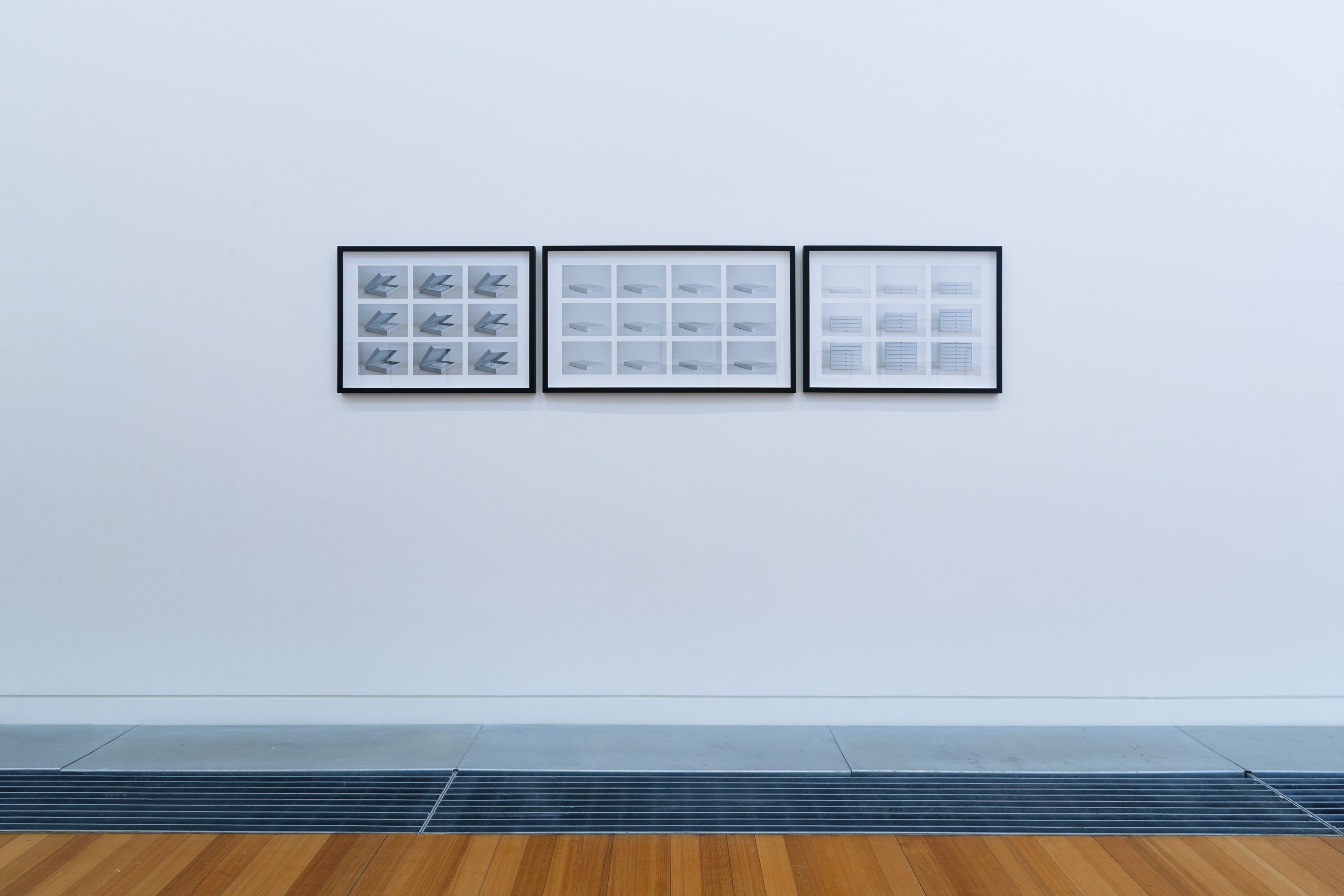 Wendy Bornholdt, Drawings wrapped in Tissue I, II, III, 2014, framed archival pigment print on Canson Rag, Photographique, 3 x 1000 mm width overall. Installation view, Wendy Bornholdt: Studioland, in Back of House, Te Pātaka Toi Adam Art Gallery, Te Herenga Waka—Victoria University of Wellington, 2023. Photo: Ted Whitaker
