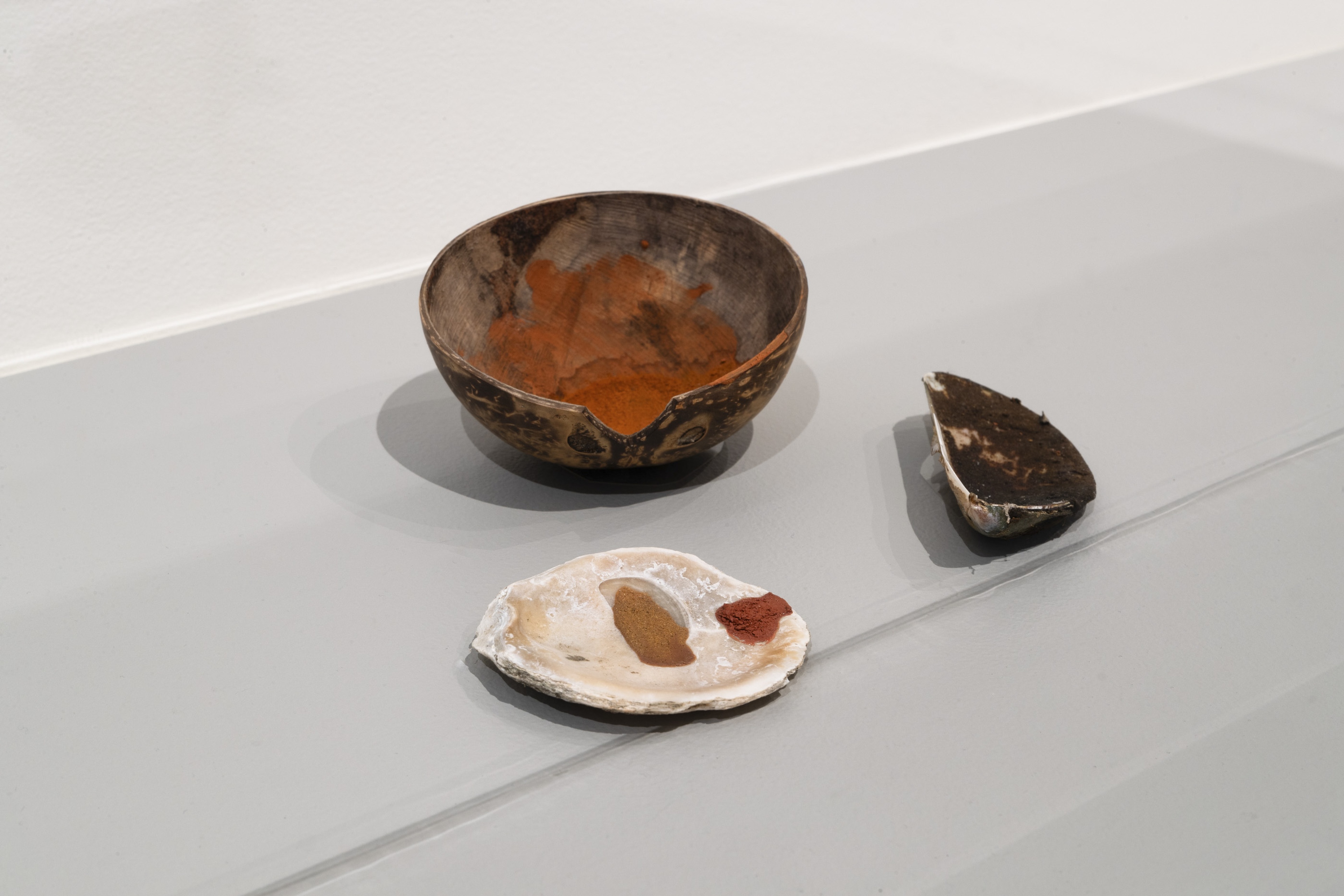 Cora-Allan, Pigment vessels, kai moana shells, coconut shell, courtesy of the artist. Installation view, Aro Toi / Art Collection in Focus: A Gift, A Celebration, An Invitation, in Back of House, Te Pātaka Toi Adam Art Gallery, Te Herenga Waka—Victoria University of Wellington, 2023. Photo: Ted Whitaker
