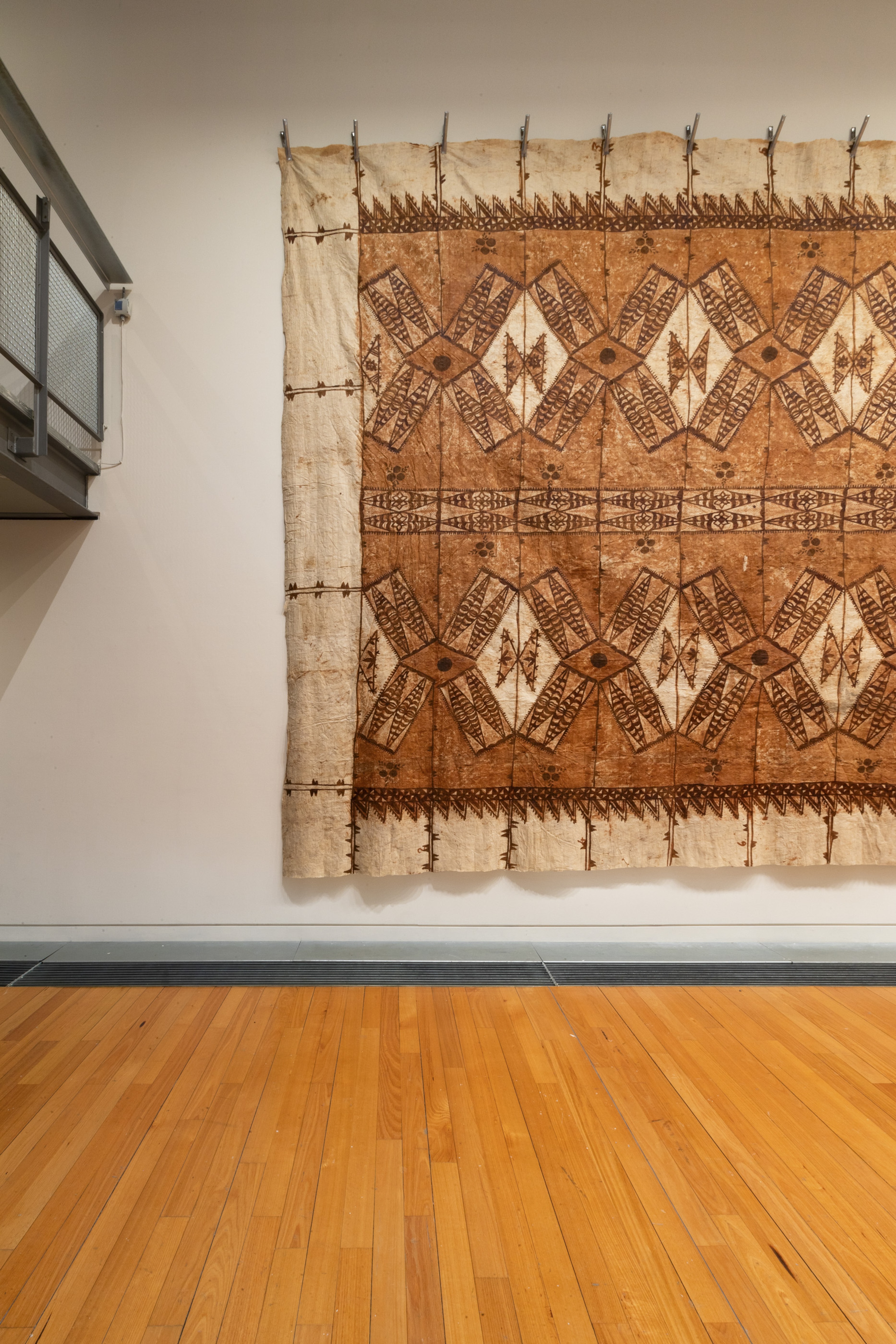 Kautaha Koka‘Anga, Tongan Village Collective, Ngatu tāhina, launima, date unknown, Ngā Puhipuhi o Te Herenga Waka—Victoria University of Wellington Art Collection, gift of the University of the South Pacific, 1999. Installation view, Aro Toi / Art Collection in Focus: A Gift, A Celebration, An Invitation, in Back of House, Te Pātaka Toi Adam Art Gallery, Te Herenga Waka—Victoria University of Wellington, 2023. Photo: Ted Whitaker