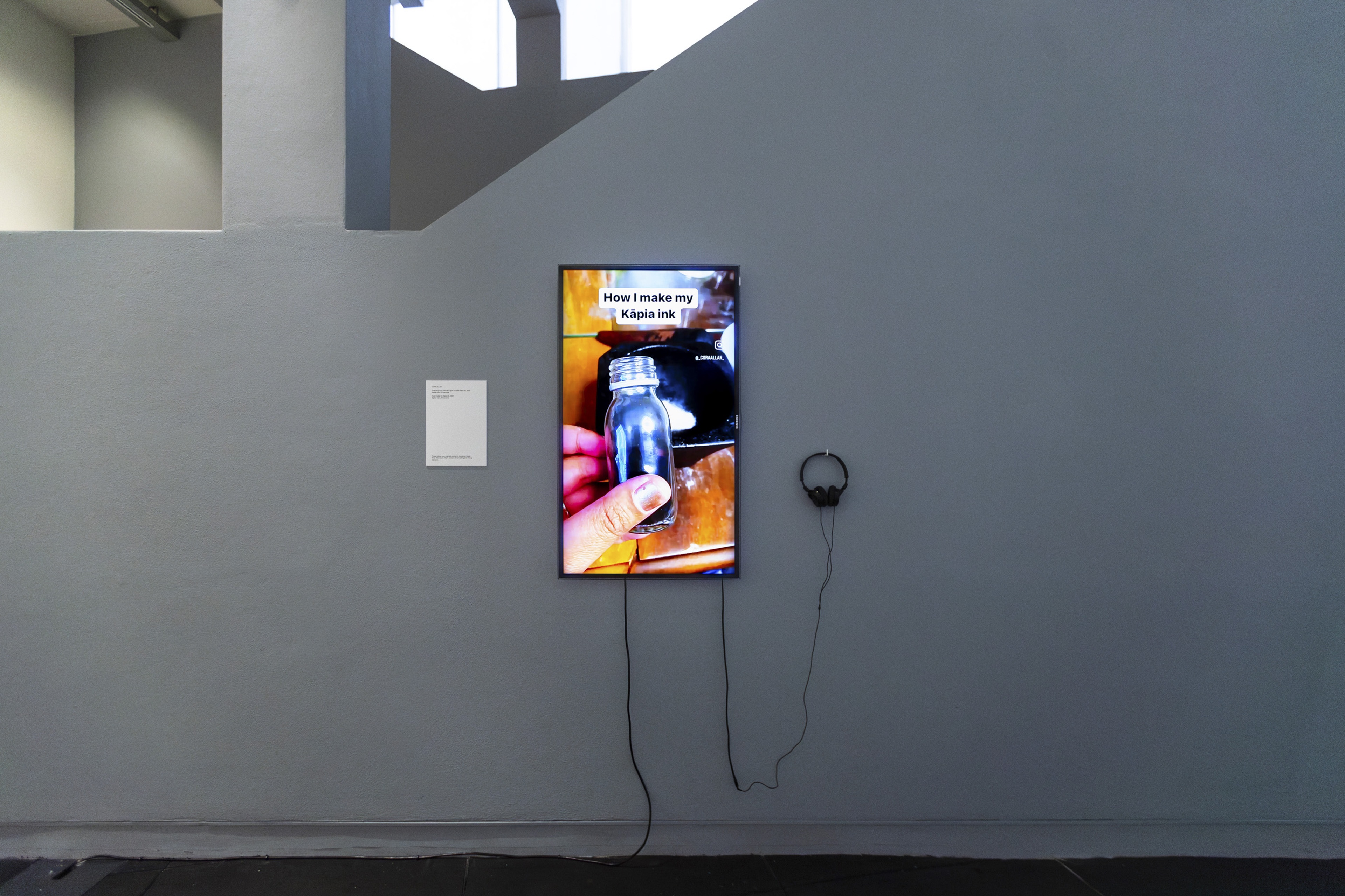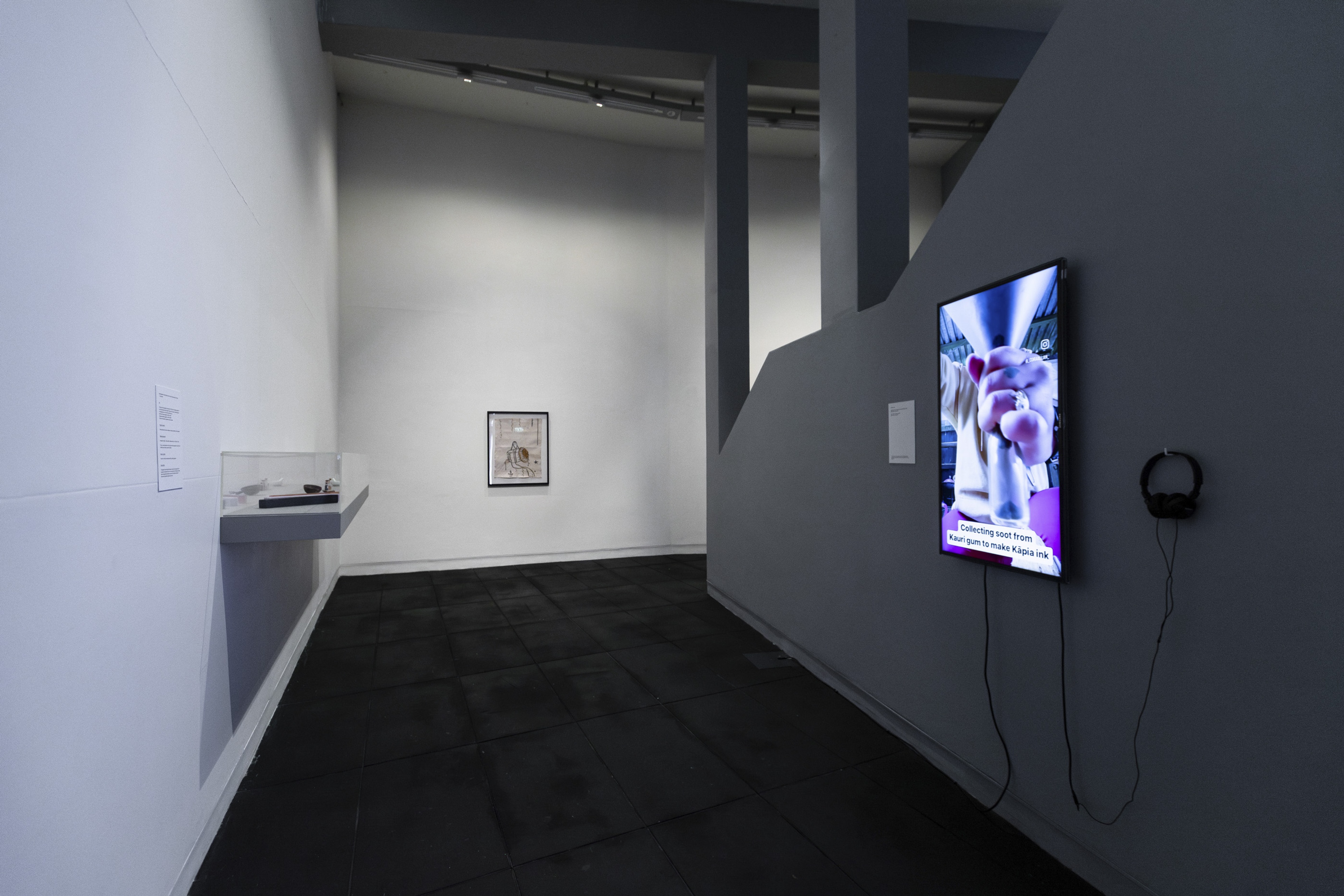 CORA-ALLAN, Collecting soot from kauri gum to make Kāpia ink, 2022, digital video, 25 seconds; and, How I make my Kāpia ink, 2022, digital video, 30 seconds, courtesy of the artist. Installation view, Aro Toi / Art Collection in Focus: A Gift, A Celebration, An Invitation, in Back of House, Te Pātaka Toi Adam Art Gallery, Te Herenga Waka—Victoria University of Wellington, 2023. Photo: Ted Whitaker