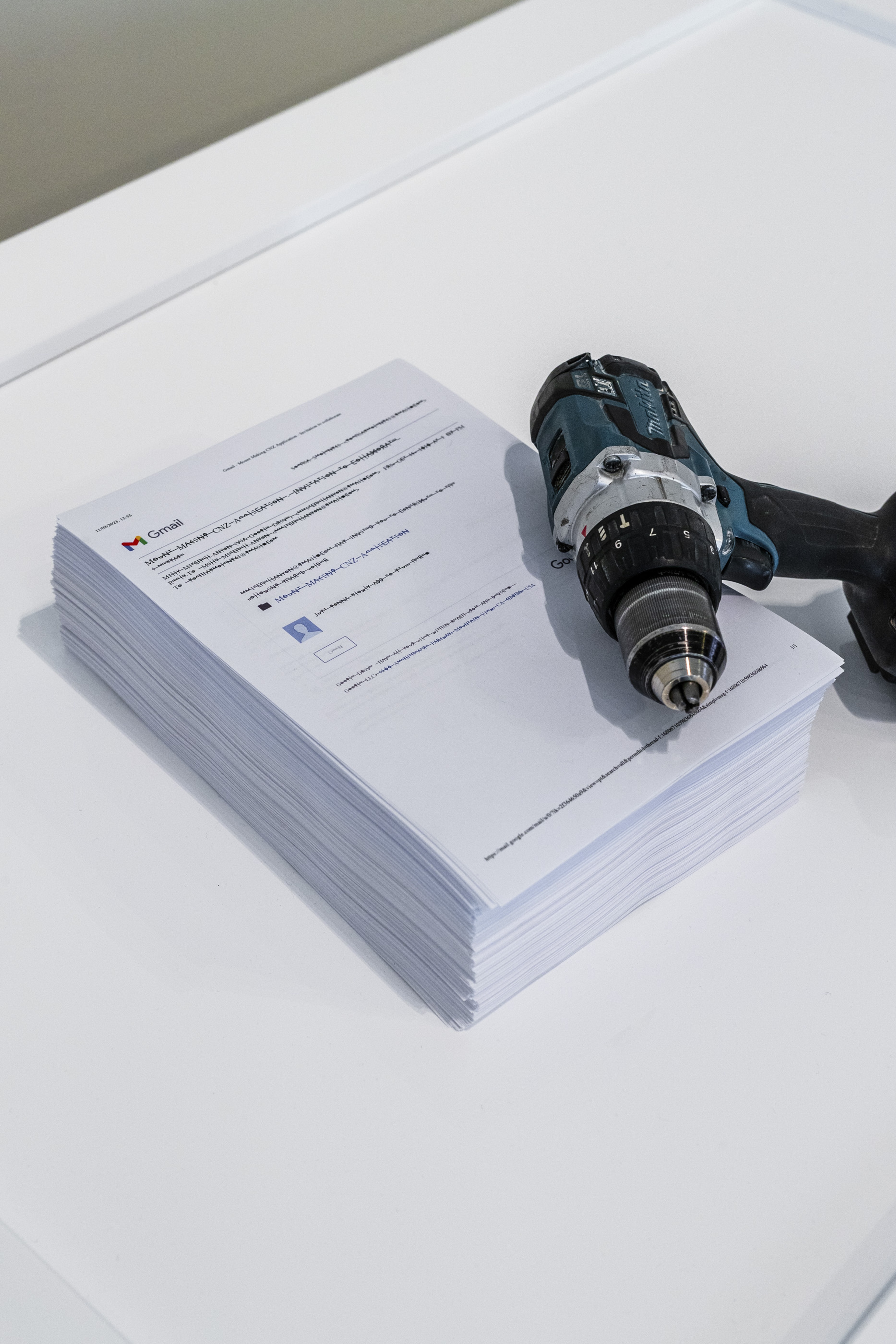 Sophia Smolenski, printed emails & power drill belonging to the artist, 2023. Installation view, Sophia Smolenski: Offering It Up, in Back of House, Te Pātaka Toi Adam Art Gallery, Te Herenga Waka—Victoria University of Wellington, 2023. Photo: Ted Whitaker