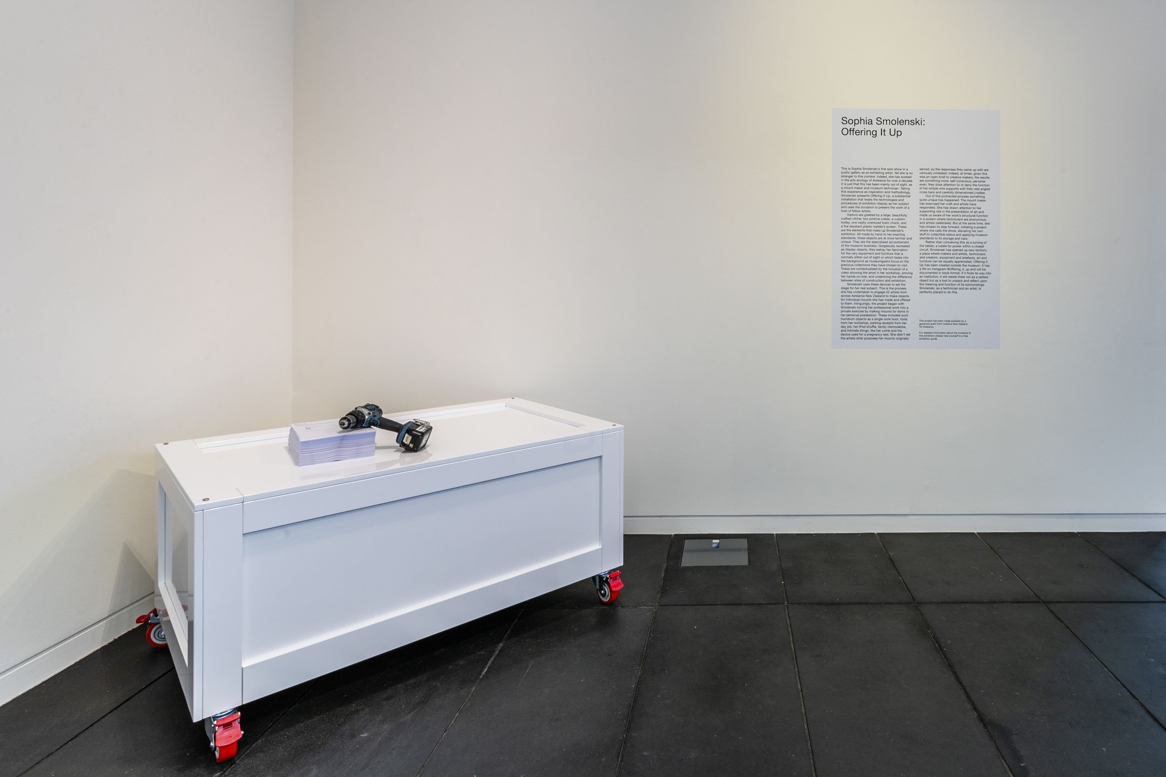 Sophia Smolenski, custom crate, printed emails & power drill belonging to the artist, 2023, 2023. Installation view, Sophia Smolenski: Offering It Up, in Back of House, Te Pātaka Toi Adam Art Gallery, Te Herenga Waka—Victoria University of Wellington, 2023. Photo: Ted Whitaker