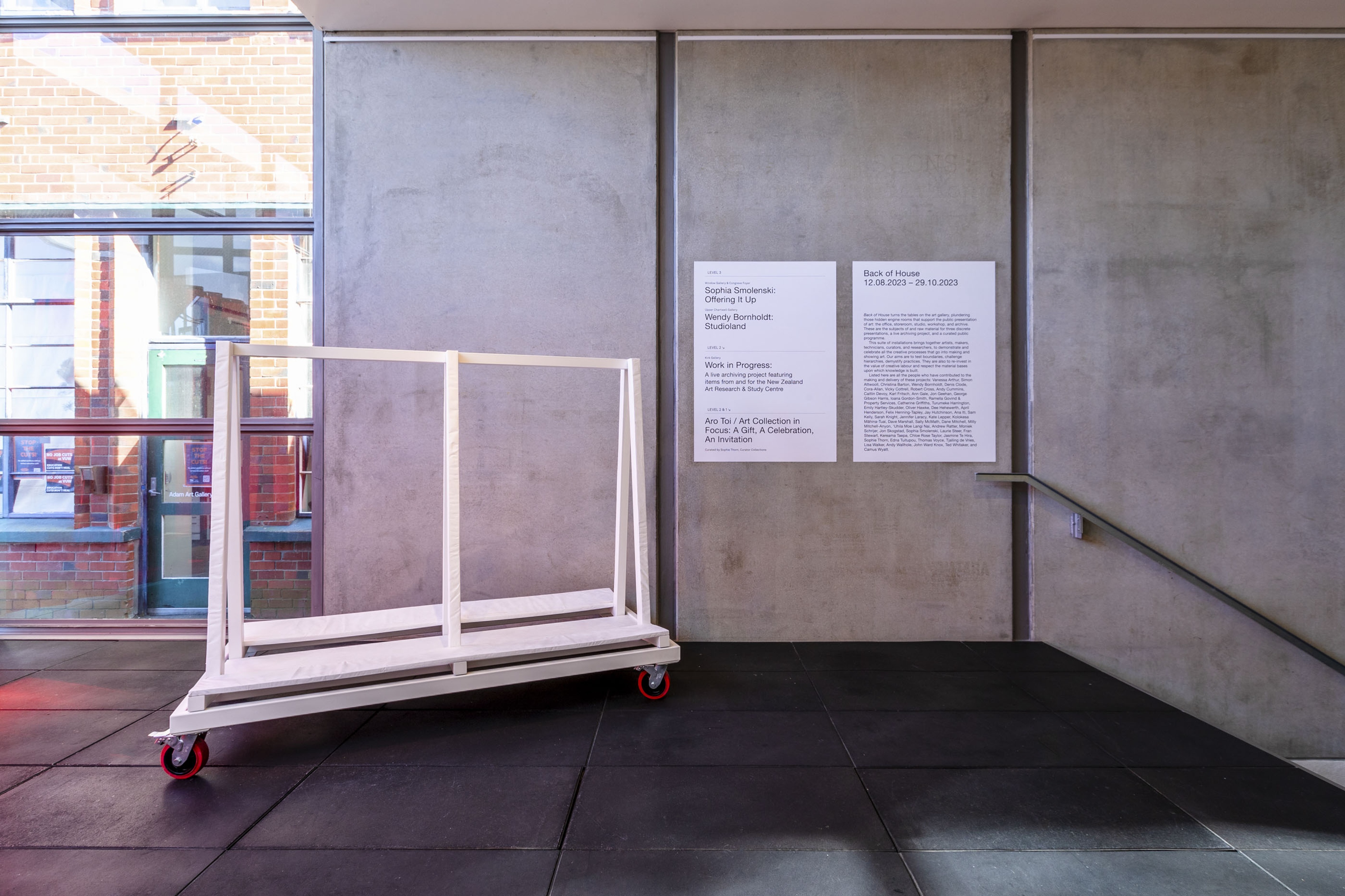 Installation view, Work in Progress, in Back of House, Te Pātaka Toi Adam Art Gallery, Te Herenga Waka—Victoria University of Wellington, 2023. Photo: Ted Whitaker