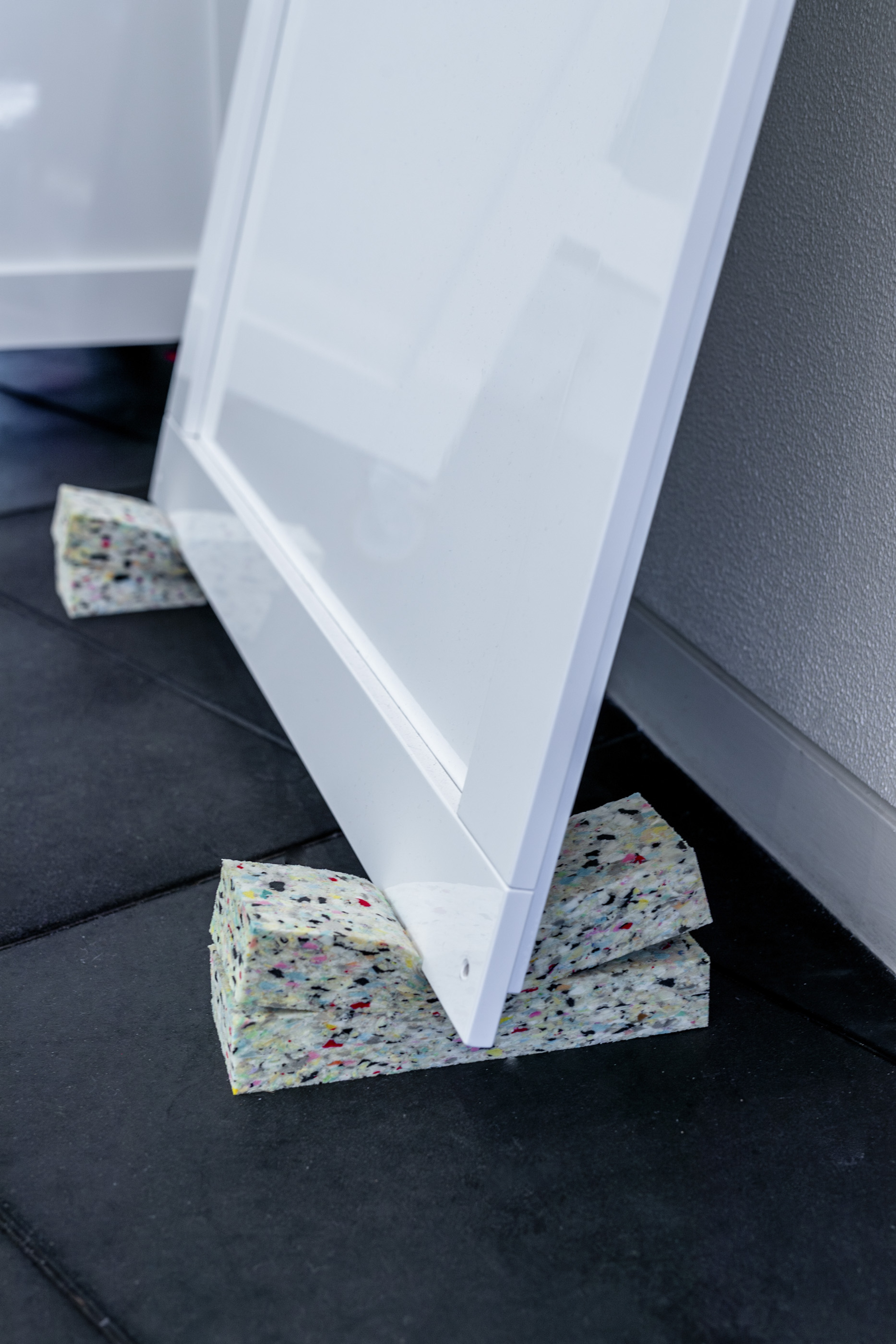 Sophia Smolenski, detail of custom crate lid on chocks, 2023. Installation view, Sophia Smolenski: Offering It Up, in Back of House, Te Pātaka Toi Adam Art Gallery, Te Herenga Waka—Victoria University of Wellington, 2023. Photo: Ted Whitaker