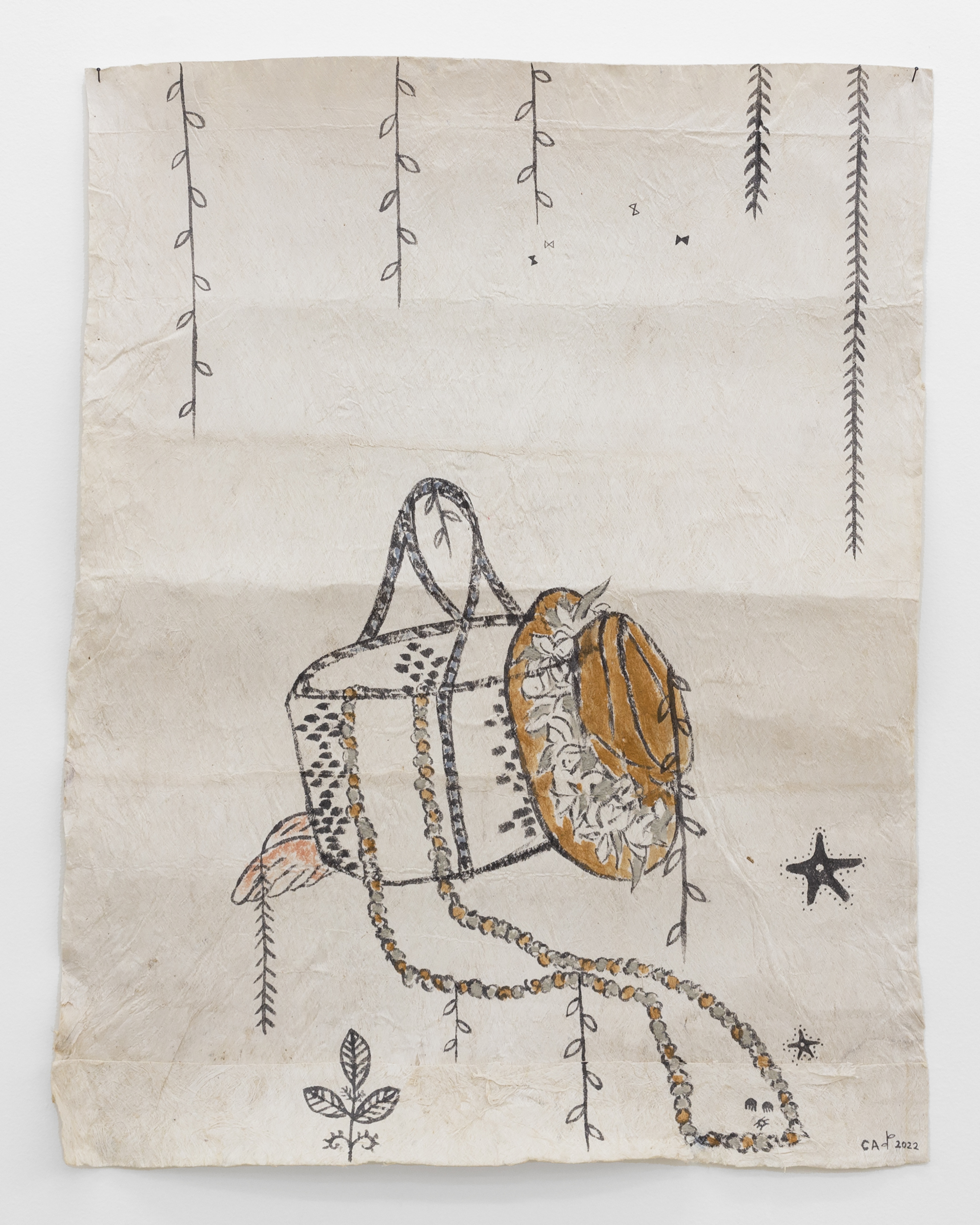 Cora-Allan, Gifts from Niue, 2022, whenua paint and kāpia ink on Hiapo, 765 x 570 mm, Ngā Puhipuhi o Te Herenga Waka—Victoria University of Wellington Art Collection, purchased as part of the 125 Celebrations 2022.