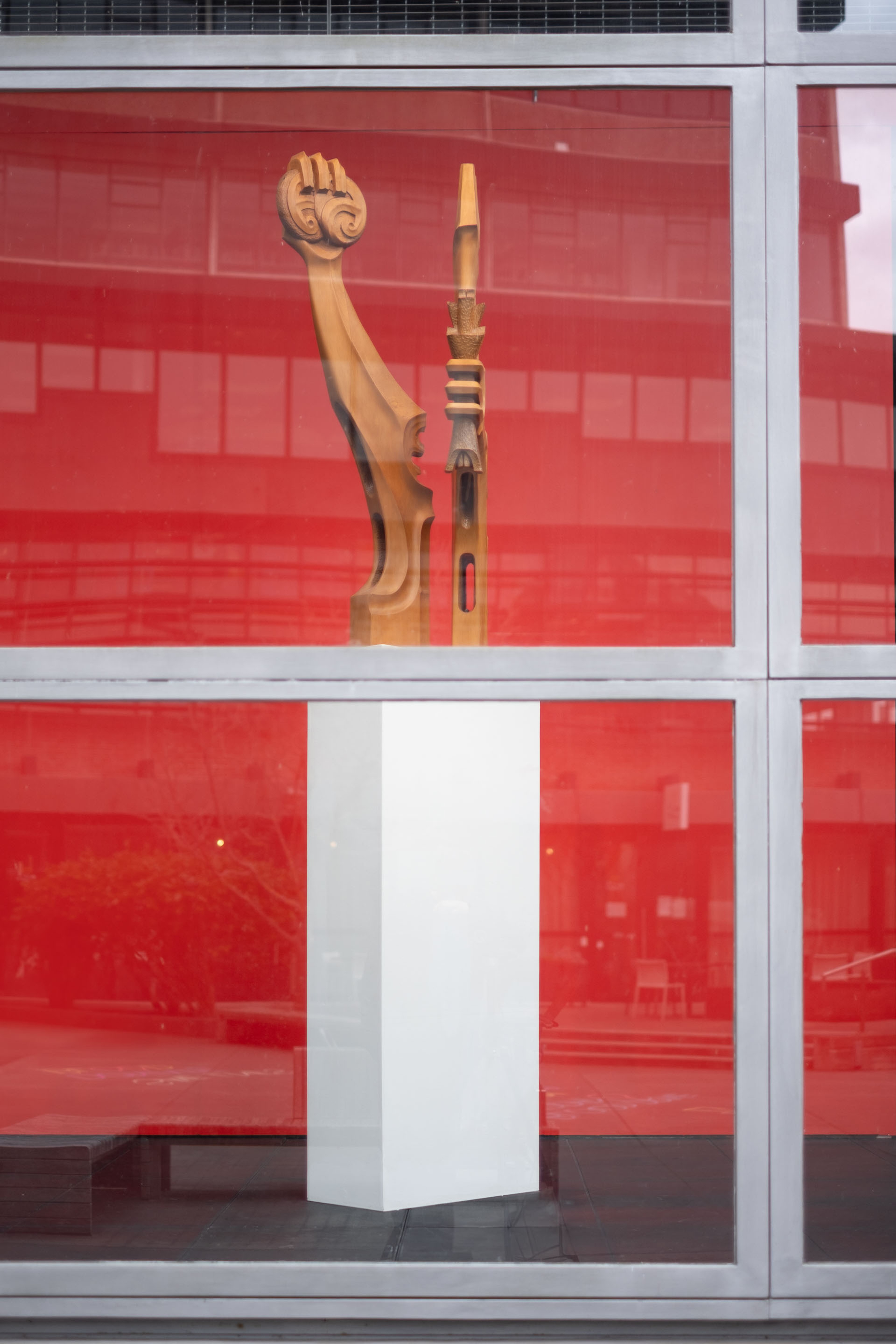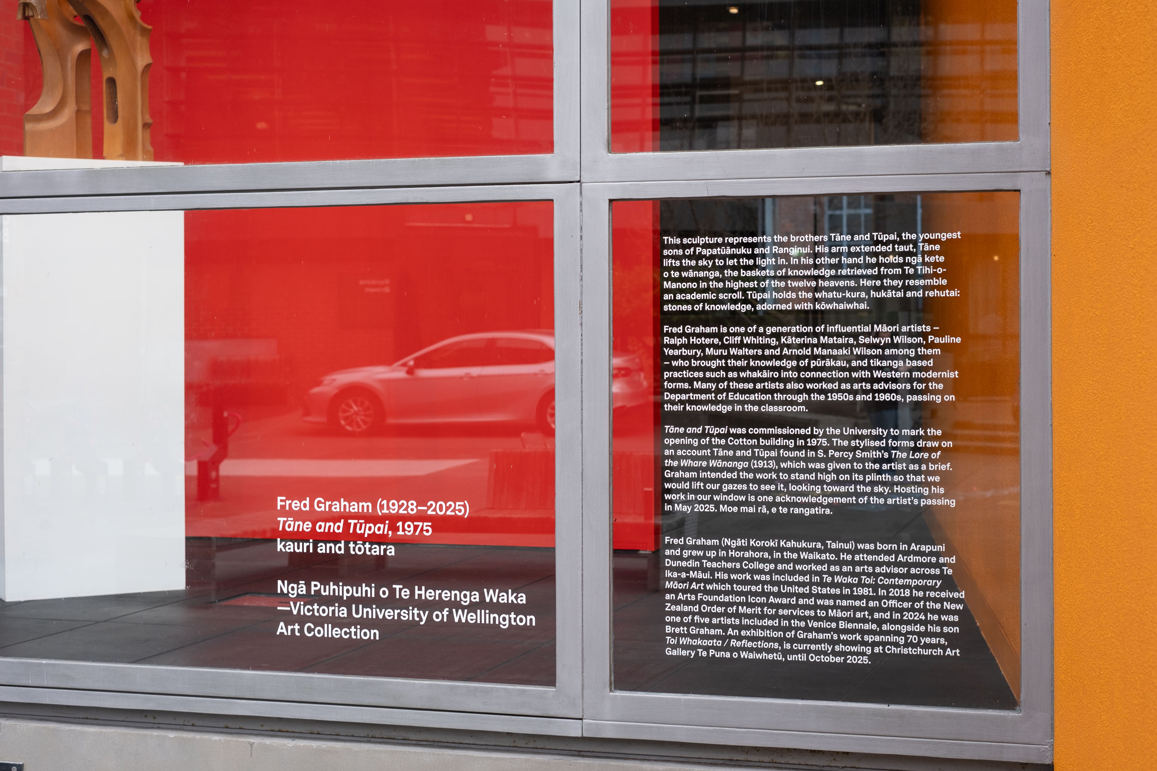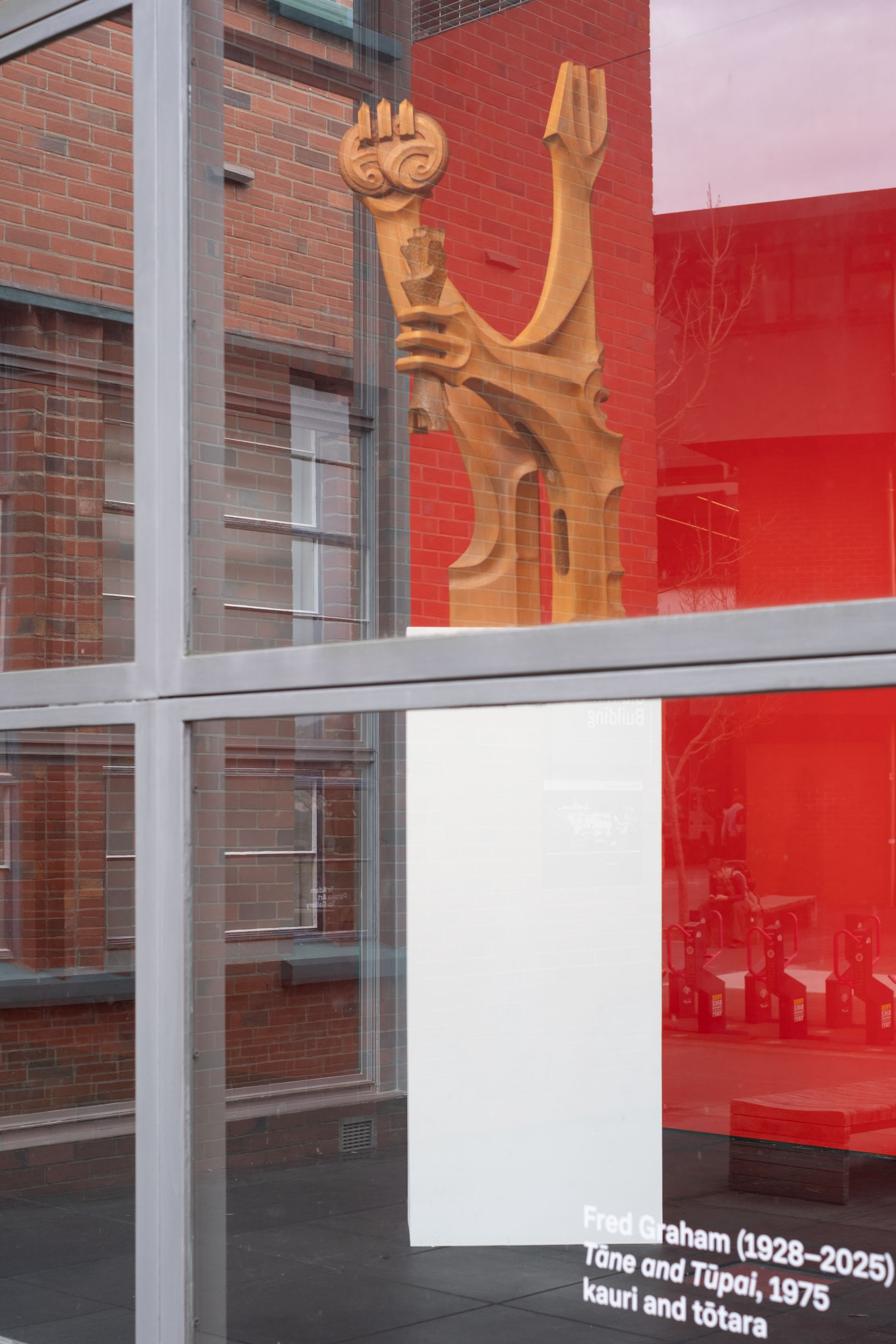 Tāne and Tūpai was commissioned by the University to mark the opening of the Cotton science building in 1975. Carved in kauri and tōtara, the stylised forms draw on an account of Tāne and Tūpai found in S. Percy Smith’s The Lore of the Whare Wānanga (1913), which was given to the artist as a brief for the commission. Graham intended the work to stand high on its plinth so that we would have to lift our gaze to see it: standing on the ground and looking toward the sky. The positioning of this work in our window is one acknowledgement of the artist’s passing in May 2025. Moe mai rā, e te rangatira.