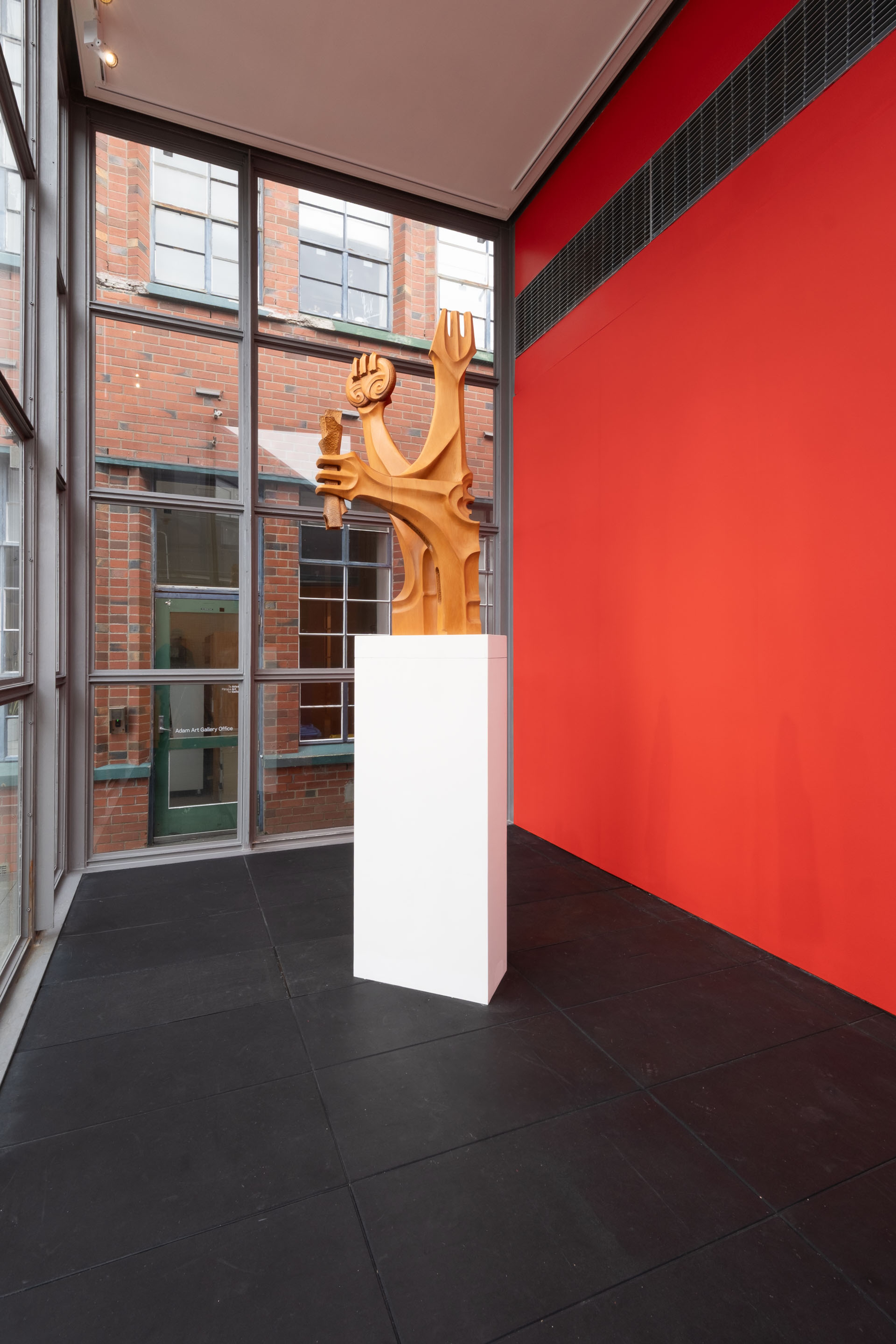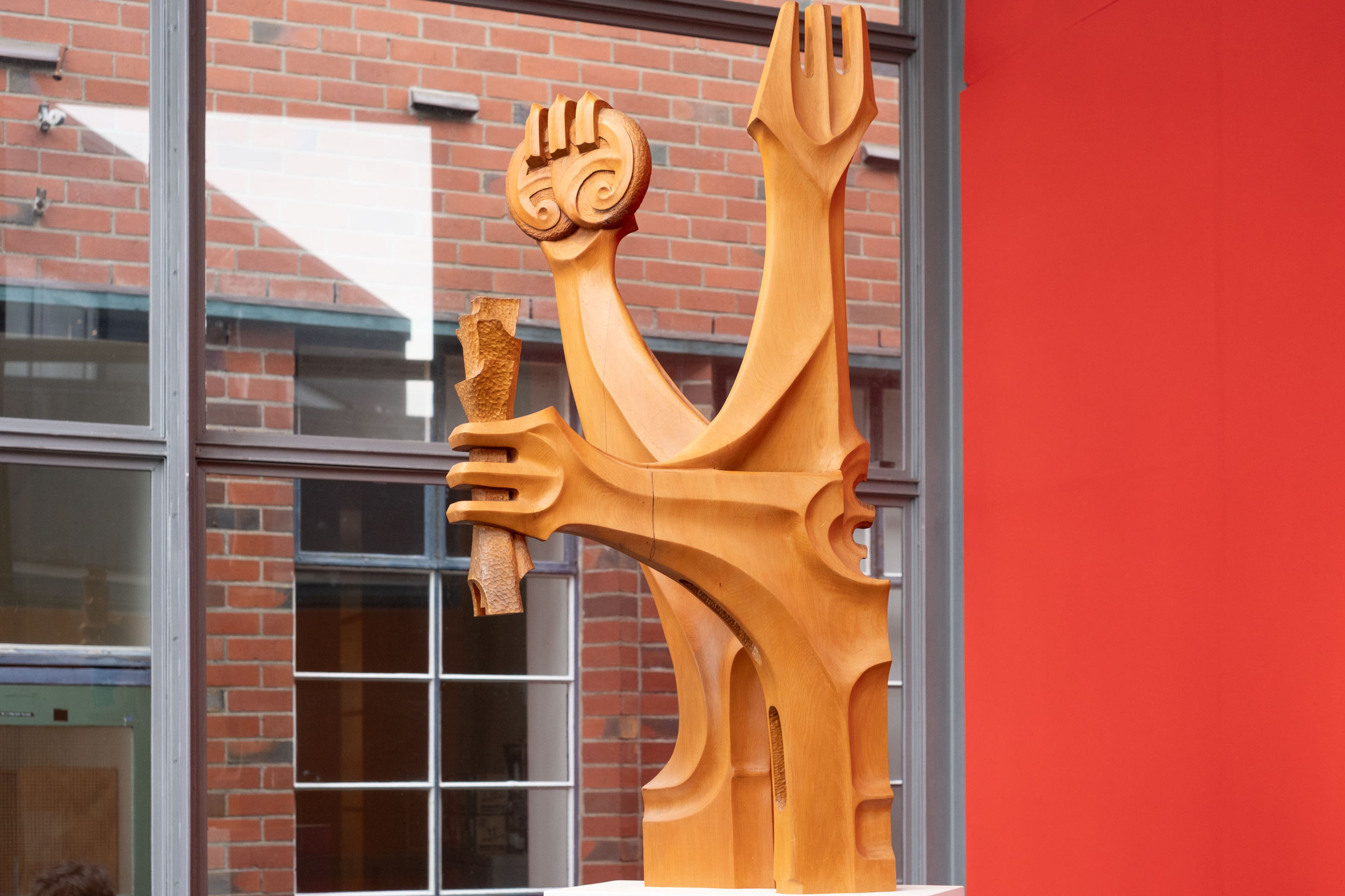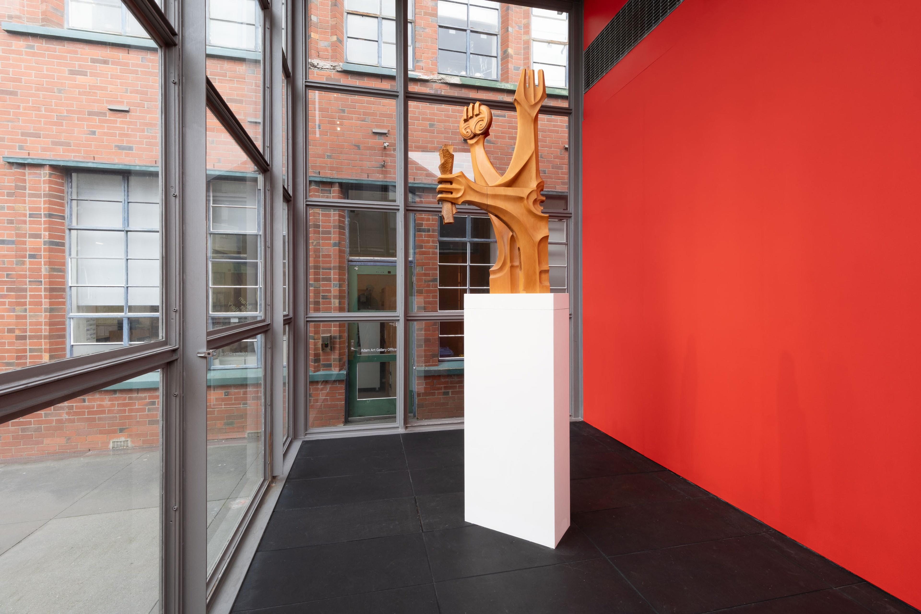 Tāne and Tūpai was commissioned by the University to mark the opening of the Cotton science building in 1975. Carved in kauri and tōtara, the stylised forms draw on an account of Tāne and Tūpai found in S. Percy Smith’s The Lore of the Whare Wānanga (1913), which was given to the artist as a brief for the commission. Graham intended the work to stand high on its plinth so that we would have to lift our gaze to see it: standing on the ground and looking toward the sky. The positioning of this work in our window is one acknowledgement of the artist’s passing in May 2025. Moe mai rā, e te rangatira.