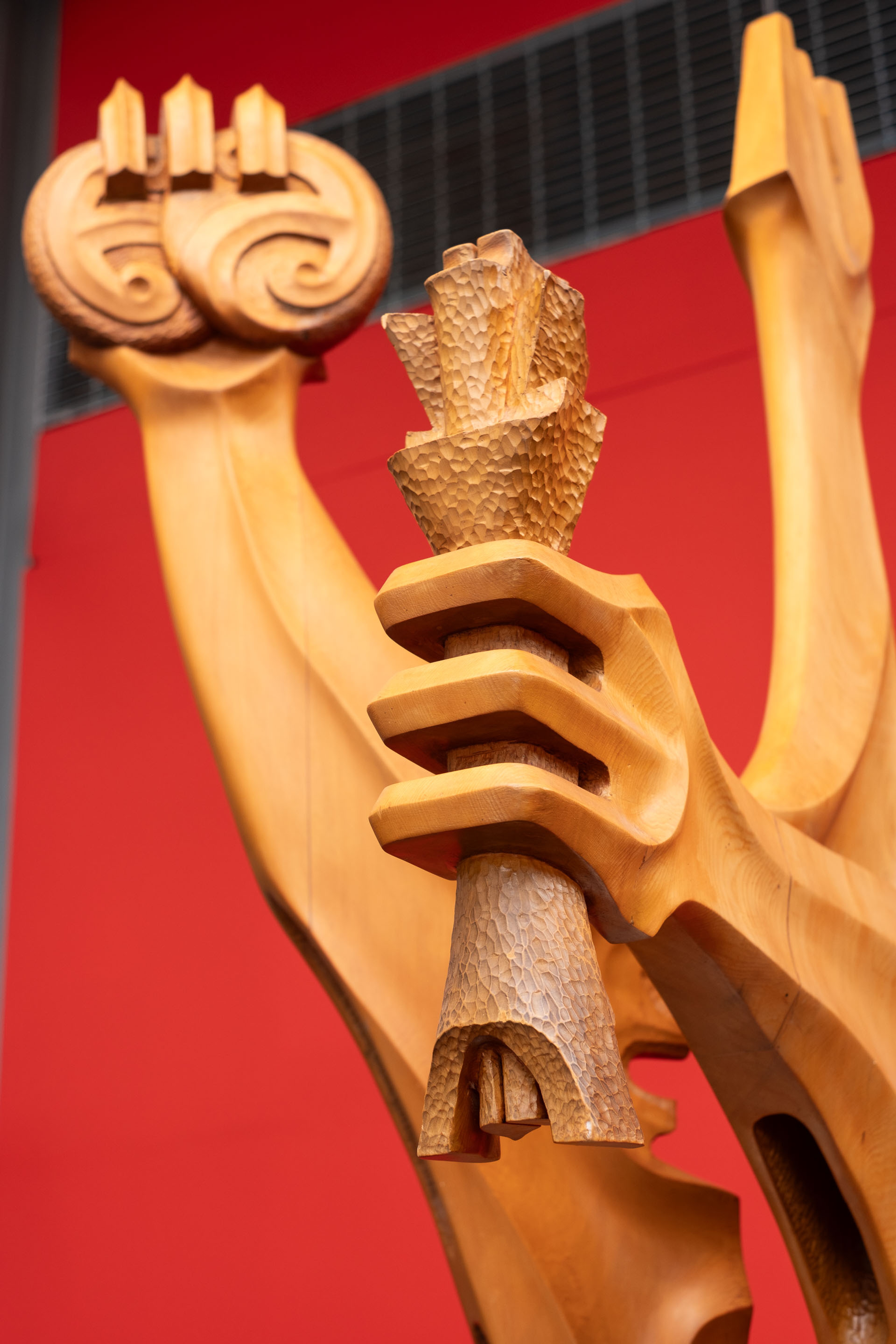 This sculpture represents the brothers Tāne and Tūpai, the youngest sons of Papatūānuku and Ranginui. His arm extended taut, Tāne uplifts the sky to let the light in. In his other hand he holds ngā kete o te wānanga, the baskets of knowledge retrieved from Te Tihi-o-Manono, the highest of the twelve heavens. Here they resemble an academic scroll. Tūpai holds the whatu-kura, hukātai and rehutai: stones of learning and knowledge, adorned with kōwhaiwhai.