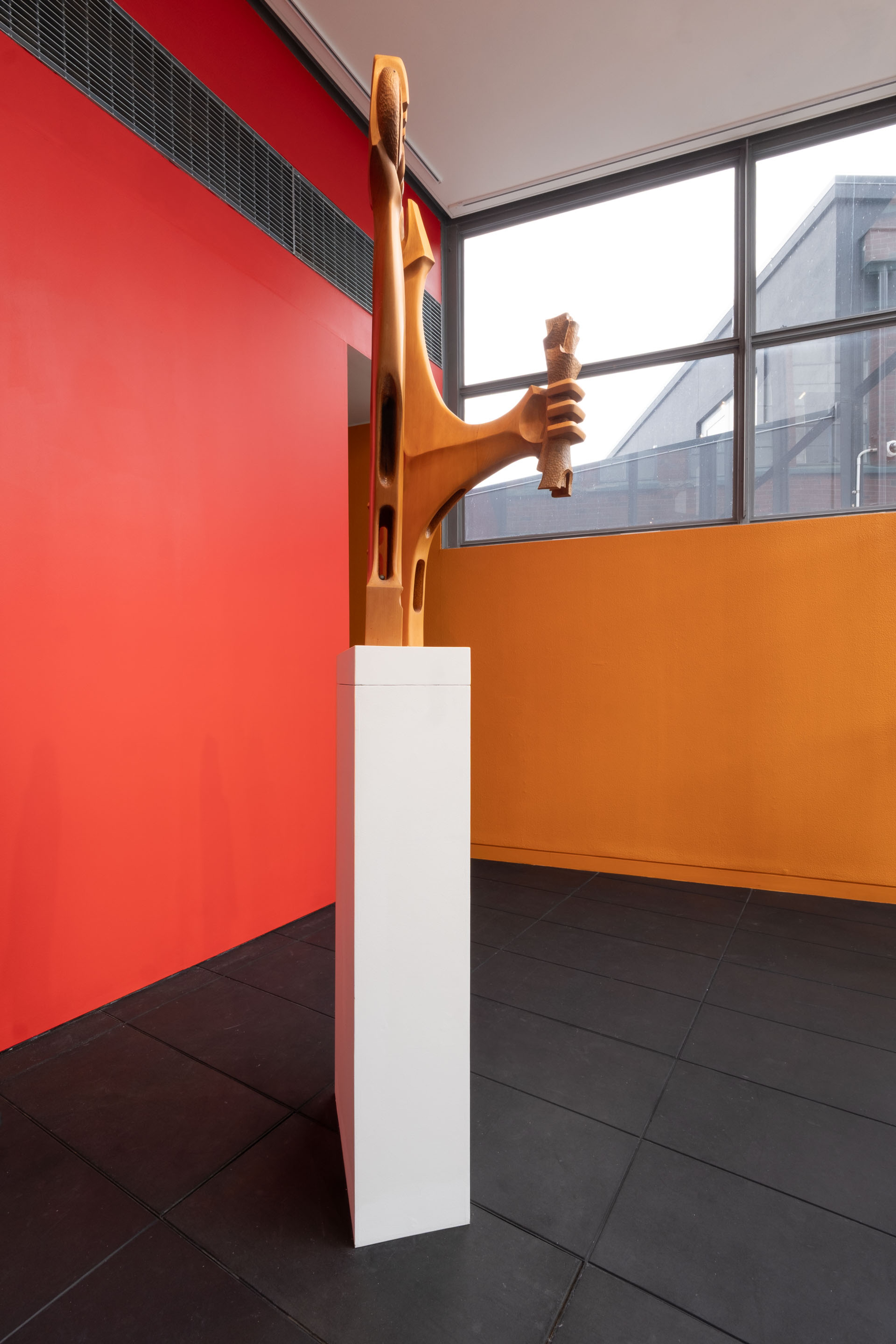 Fred Graham (1928–2025), Tāne and Tūpai, 1975, kauri and tōtara, Ngā Puhipuhi o Te Herenga Waka—Victoria University of Wellington Art Collection, commissioned 1975. Installation view, Te Pātaka Toi Adam Art Gallery, Te Herenga Waka—Victoria University of Wellington 2025. Photo: Ted Whitaker.