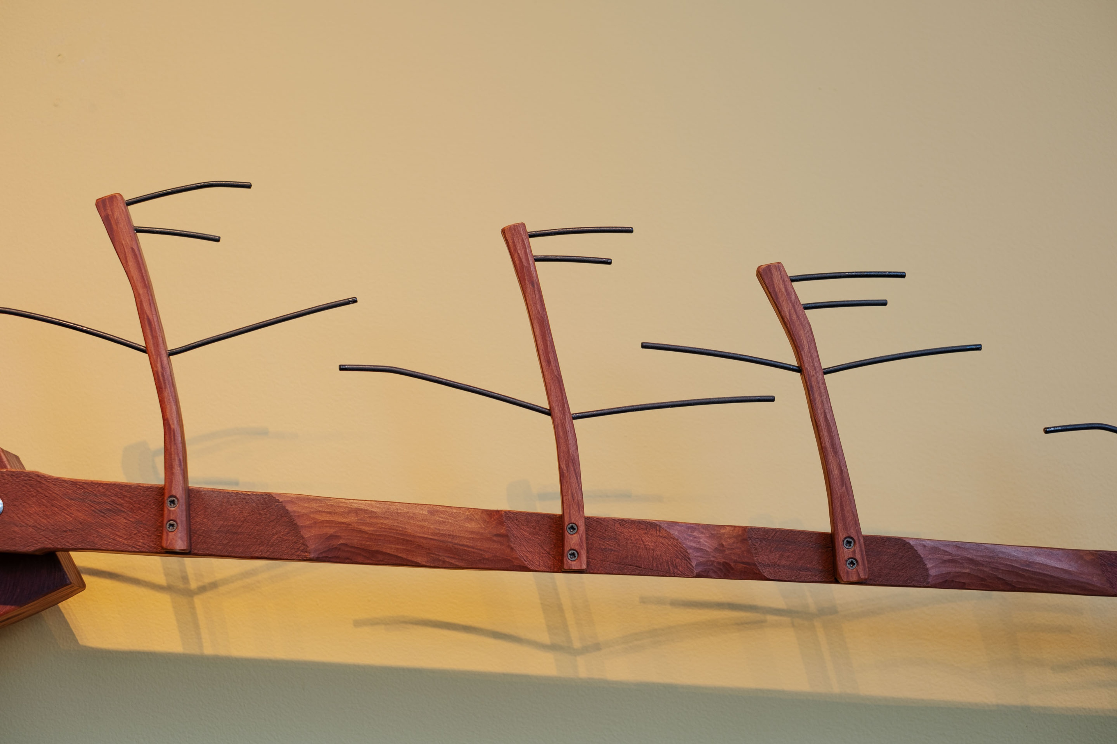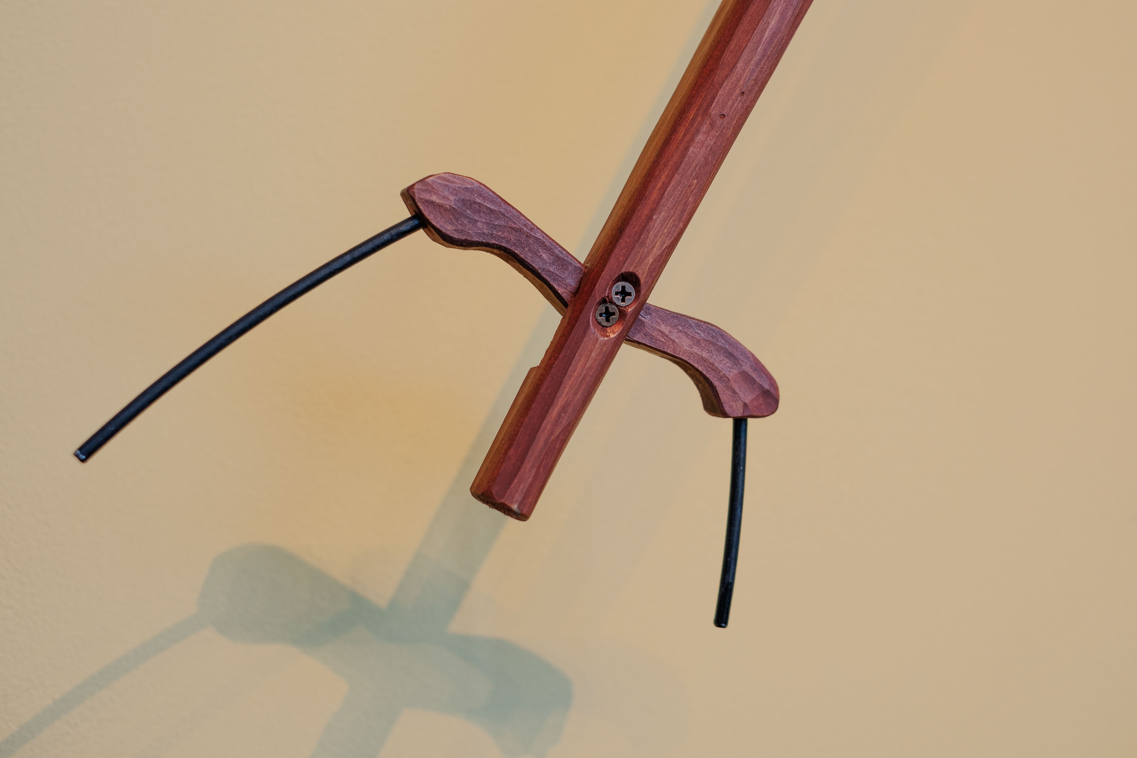 Ross Hemera, Tahito: A Bird for the Future (detail), 1995, Tōtara, no.8 wire and galvanised steel bolts, Ngā Puhipuhi o Te Herenga Waka—Victoria University of Wellington Art Collection, formerly Wellington College of Education Art Collection, accessioned 2009. Installation view Te Pātaka Toi Adam Art Gallery, 2025. Photo: Ted Whitaker.