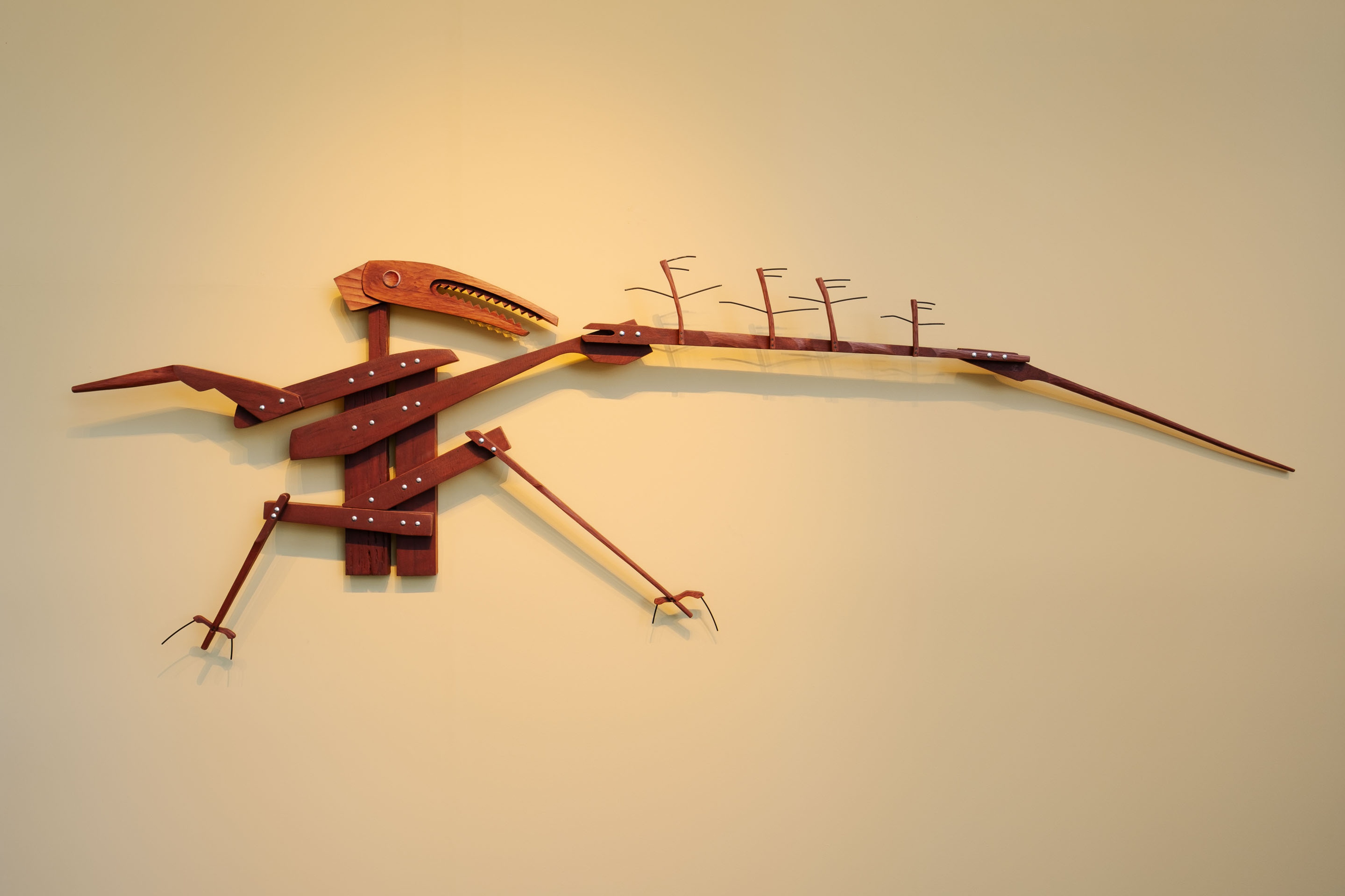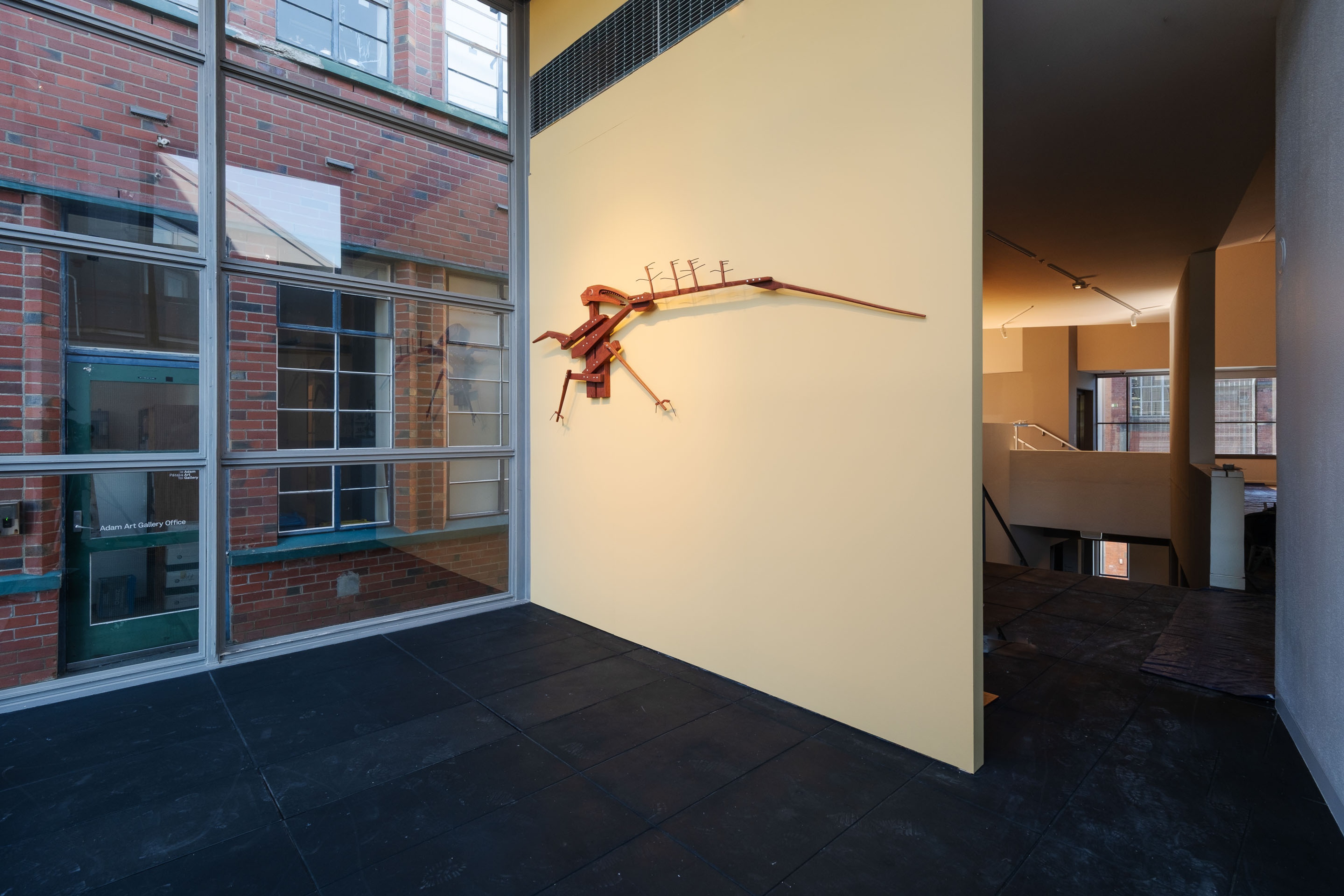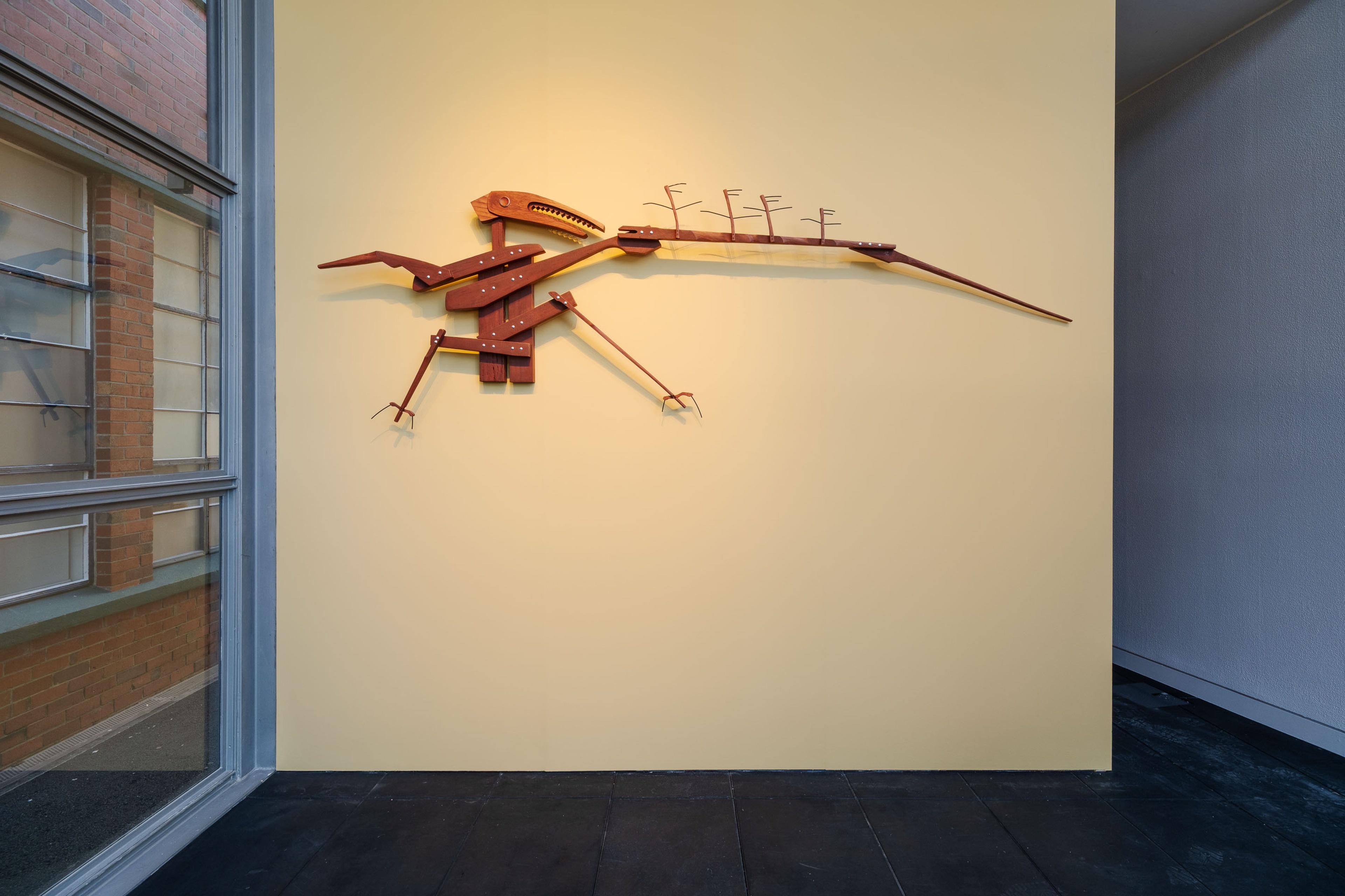 Ross Hemera, Tahito: A Bird for the Future, 1995, Tōtara, no.8 wire and galvanised steel bolts, Ngā Puhipuhi o Te Herenga Waka—Victoria University of Wellington Art Collection, formerly Wellington College of Education Art Collection, accessioned 2009. Installation view Te Pātaka Toi Adam Art Gallery, 2025. Photo: Ted Whitaker.
