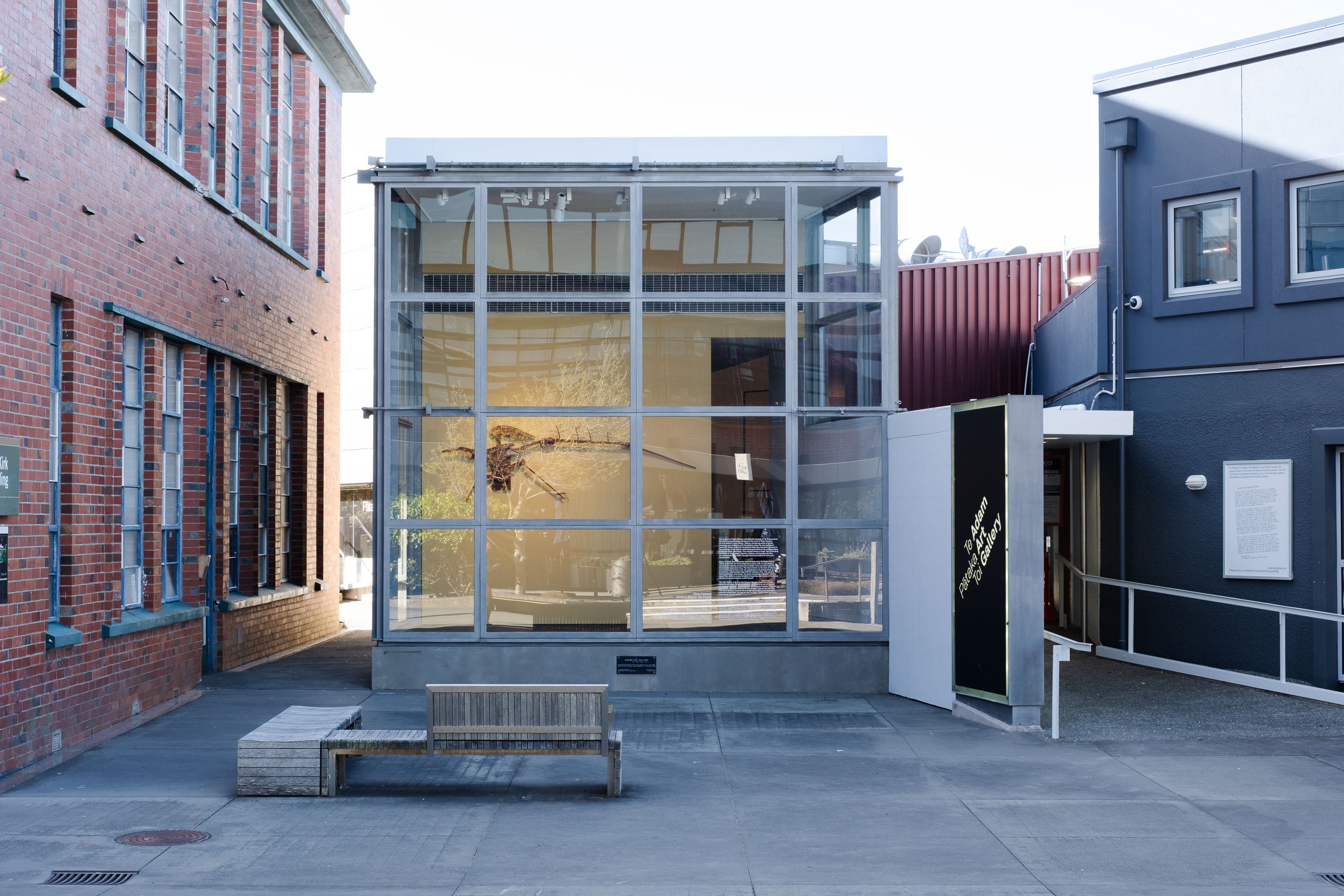 Exterior installation view, Ross Hemera, Tahito: A Bird for the Future, 1995, Tōtara, no.8 wire and galvanised steel bolts, Ngā Puhipuhi o Te Herenga Waka—Victoria University of Wellington Art Collection, formerly Wellington College of Education Art Collection, accessioned 2009, Te Pātaka Toi Adam Art Gallery, 2025. Photo: Ted Whitaker.