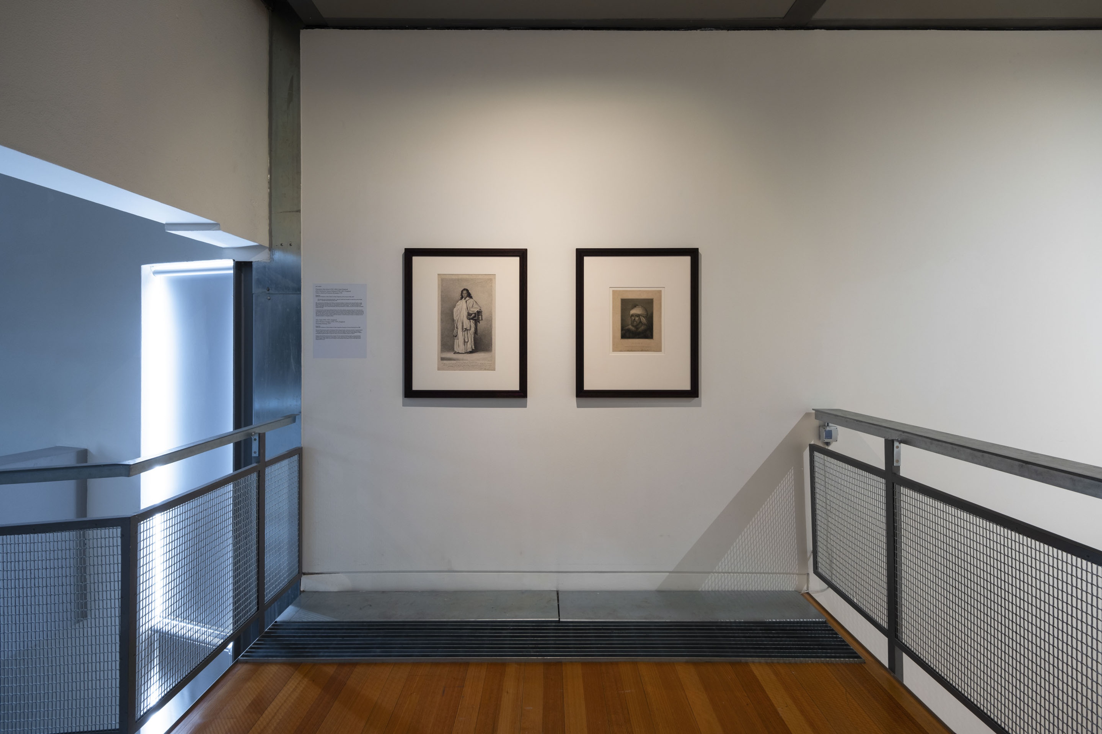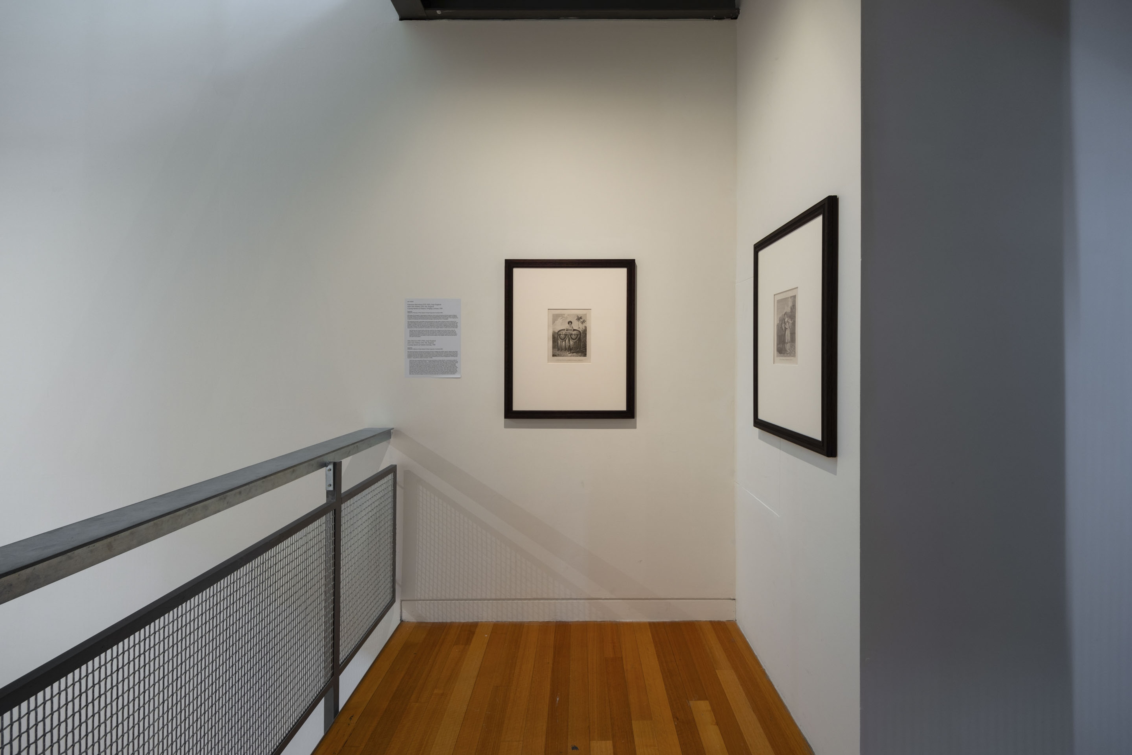 Francesco Bartolozzi after Nathaniel Dance-Holland, Omai a Native of Ulaietea [Ra‘iatea], 1774, engraving, 292 × 465mm, gift of Horace Fildes, 1937; and John Hall after William Hodges, Potatow [Potatau], 1777, engraving, 187 × 233mm, bequest of Charles Rooking Carter, 1896. Collection of Museum of New Zealand Te Papa Tongarewa. Installation view, Vaiei Tupuna, Te Pātaka Toi Adam Art Gallery, Te Herenga Waka—Victoria University of Wellington, 2024. Photo: Ted Whitaker.