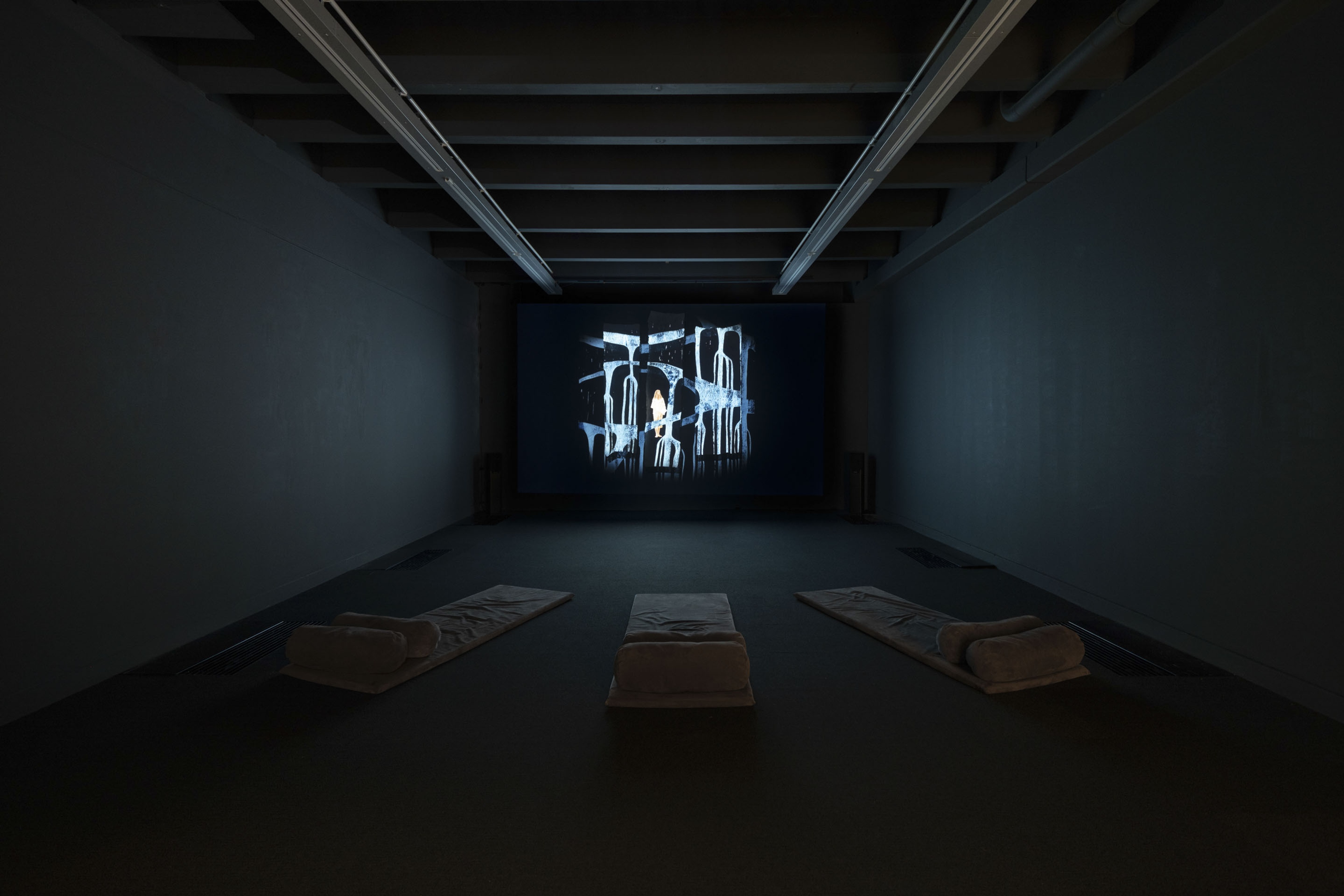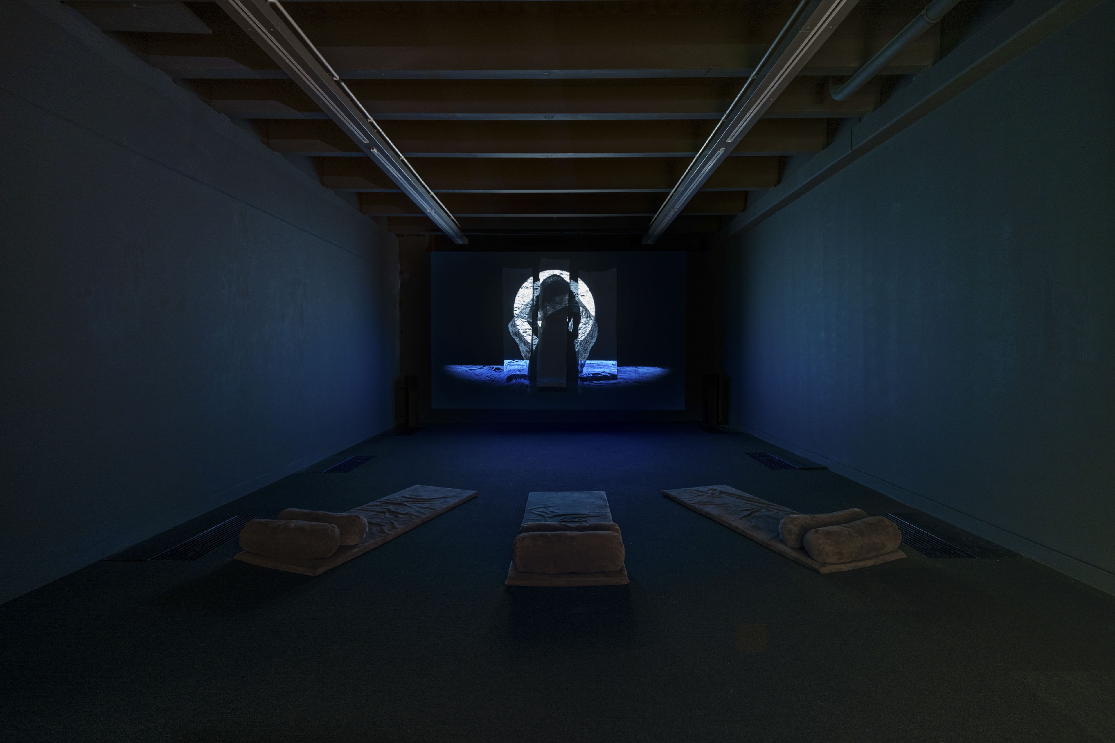 Pauline Reynolds and Sue Pearson, Hina’s Granddaughters, 2022, HD video with audio projected onto tapa cloth, 10 minutes, looped. Courtesy of the artists. Installation view, Hina Sings, Vaiei Tupuna, Te Pātaka Toi Adam Art Gallery, Te Herenga Waka—Victoria University of Wellington, 2024. Photo: Ted Whitaker.