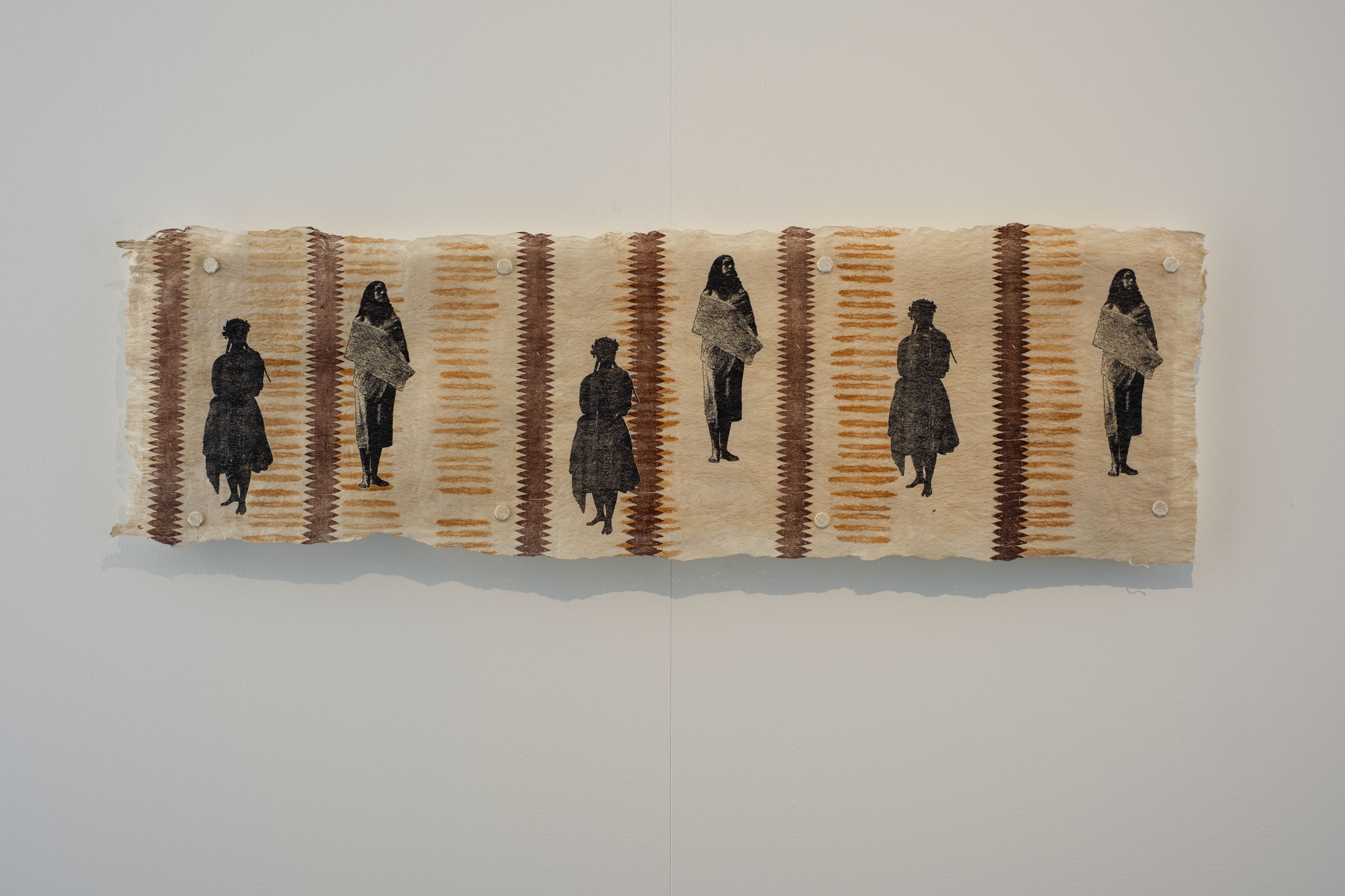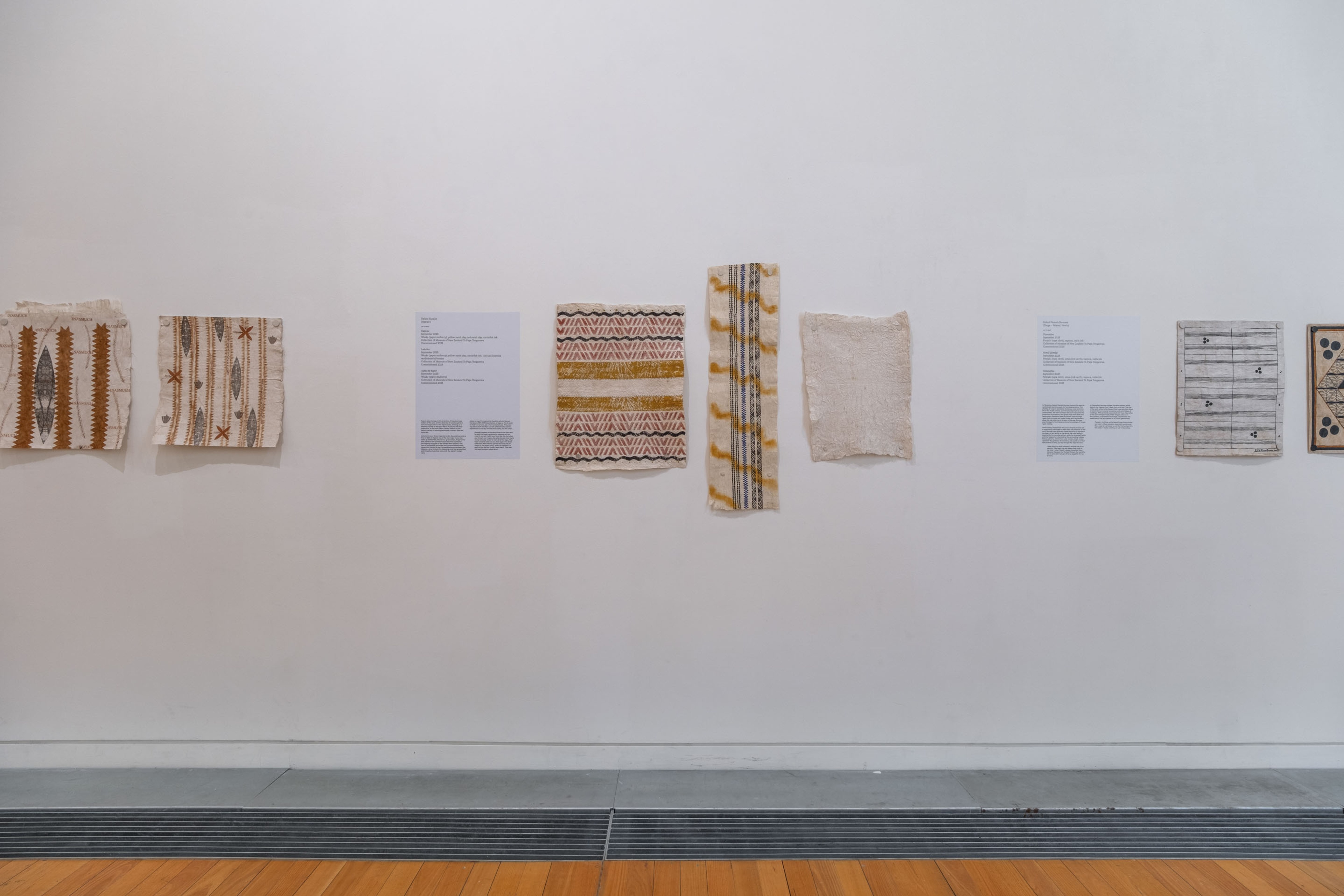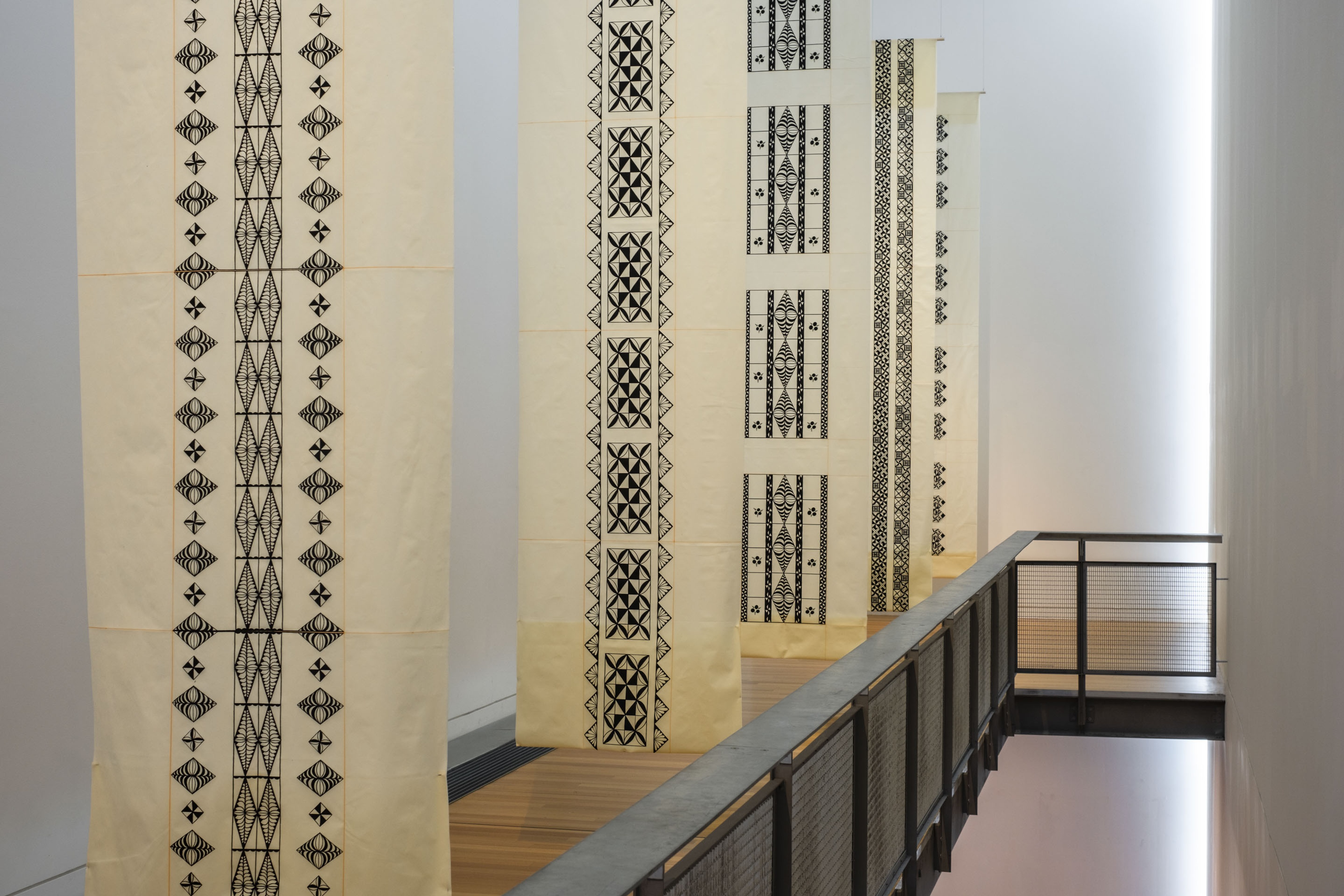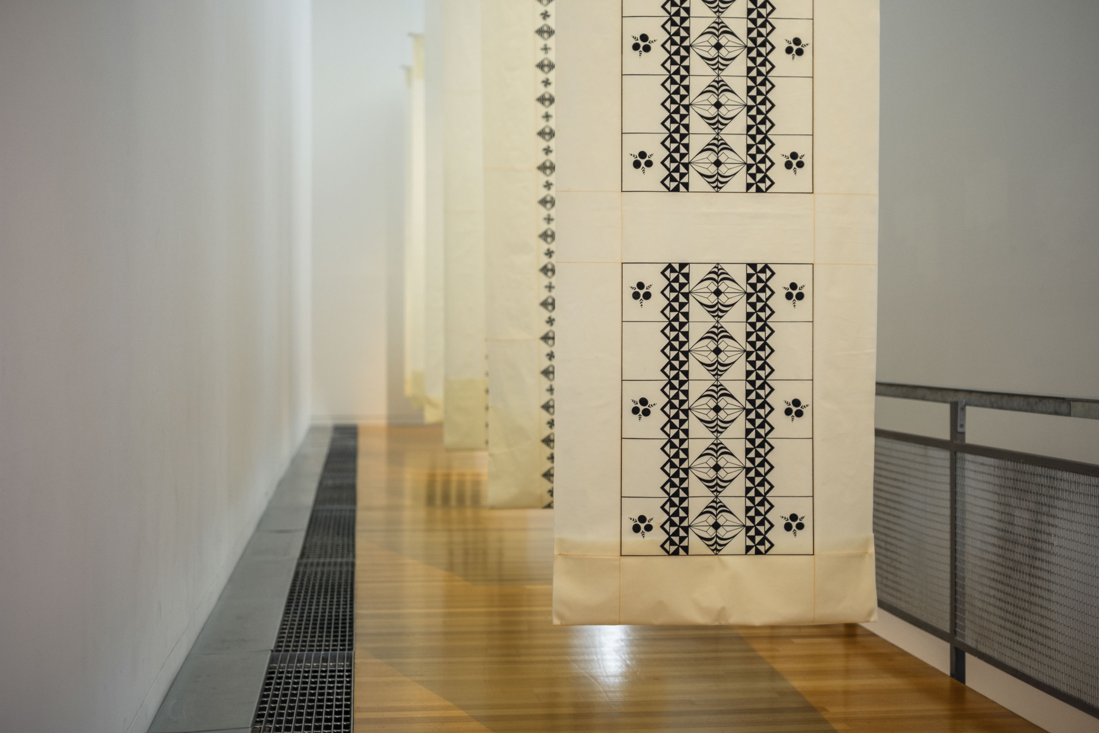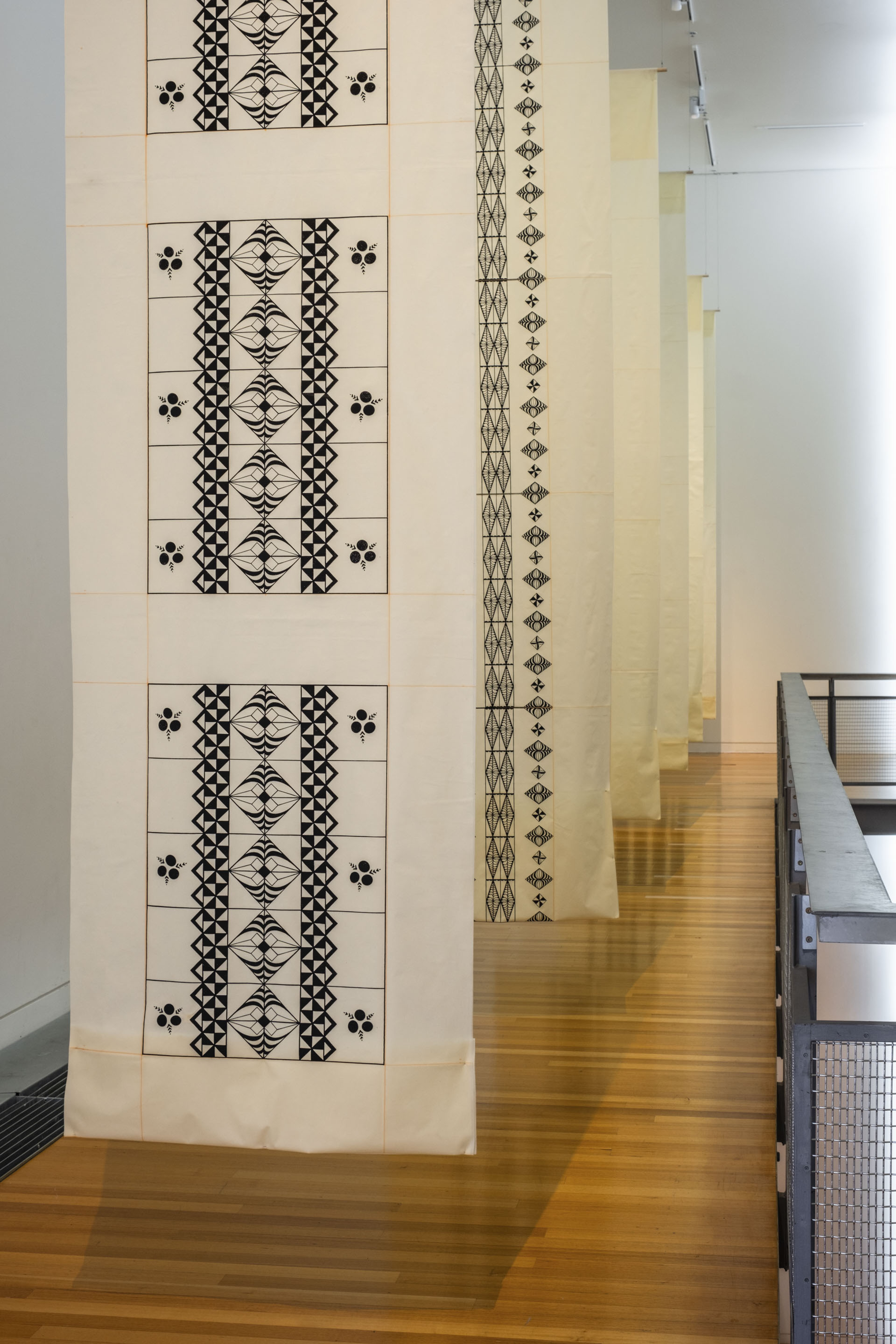 ‘Uhila Moe Langi Nai, Hala Kafa, 2024, ink on pepa koka’anga, six parts of 900 × 4000mm. Courtesy of the artist. Installation view, Vaiei Tupuna, Te Pātaka Toi Adam Art Gallery, Te Herenga Waka—Victoria University of Wellington, 2024. Photo: Ted Whitaker.