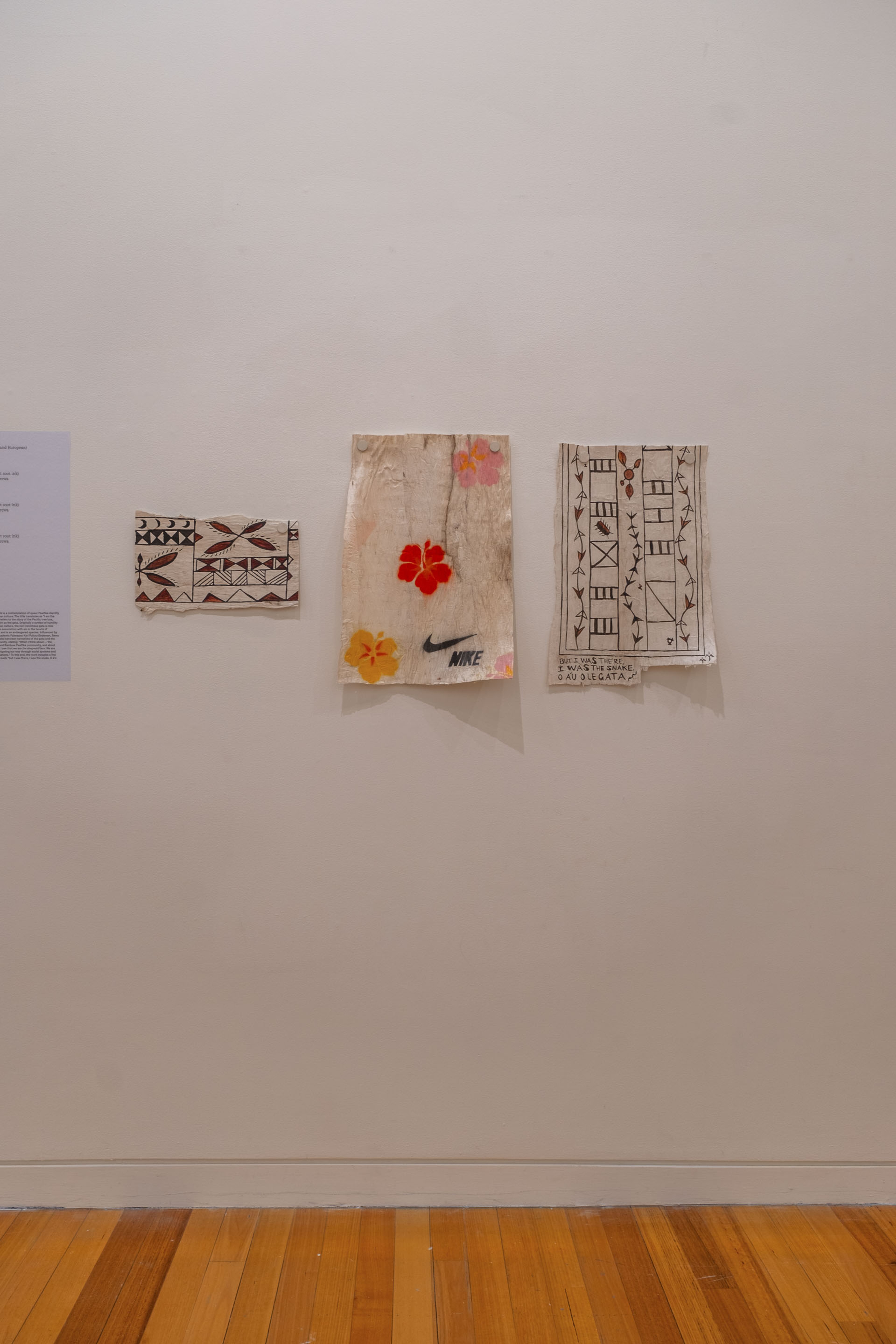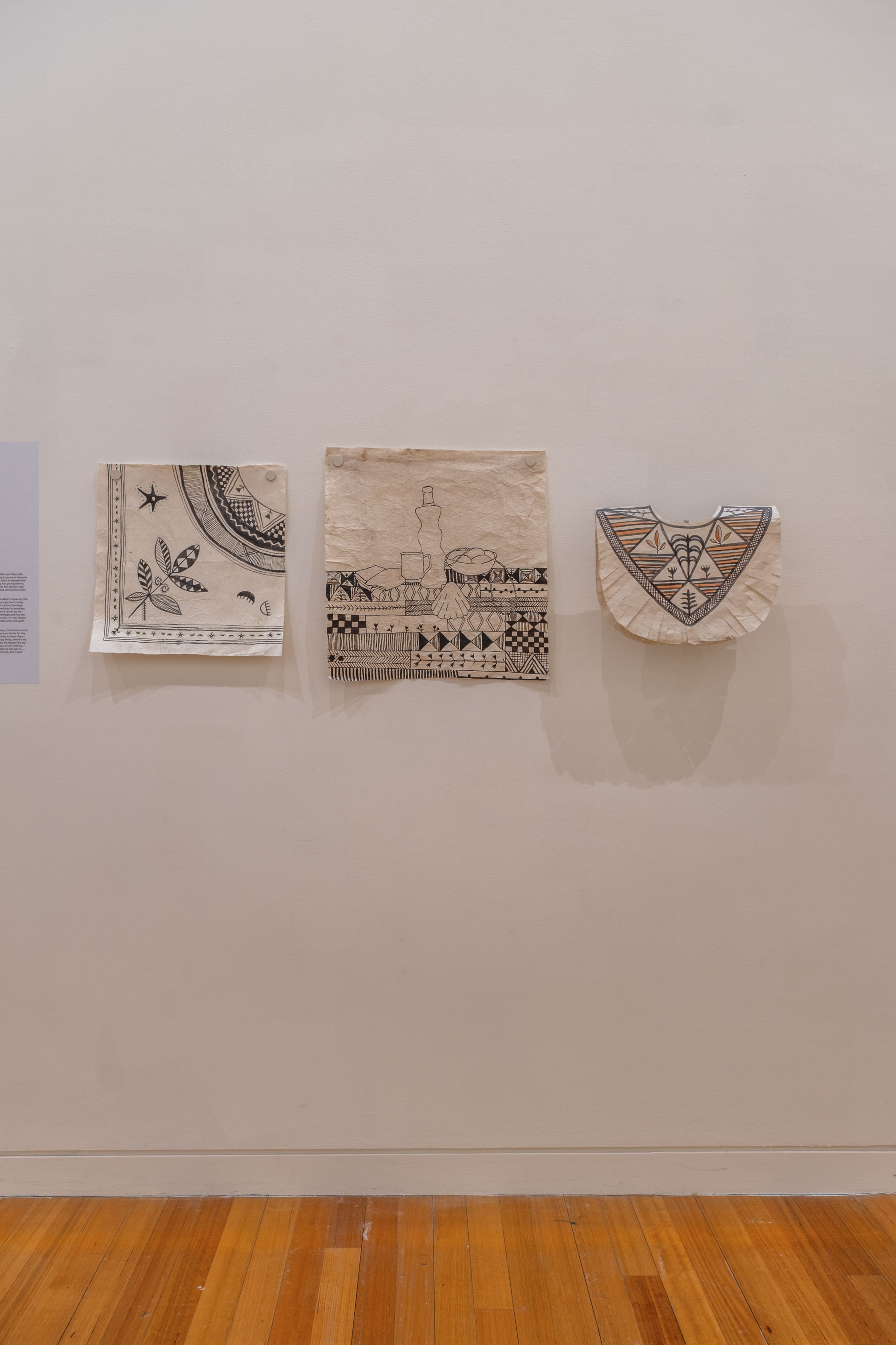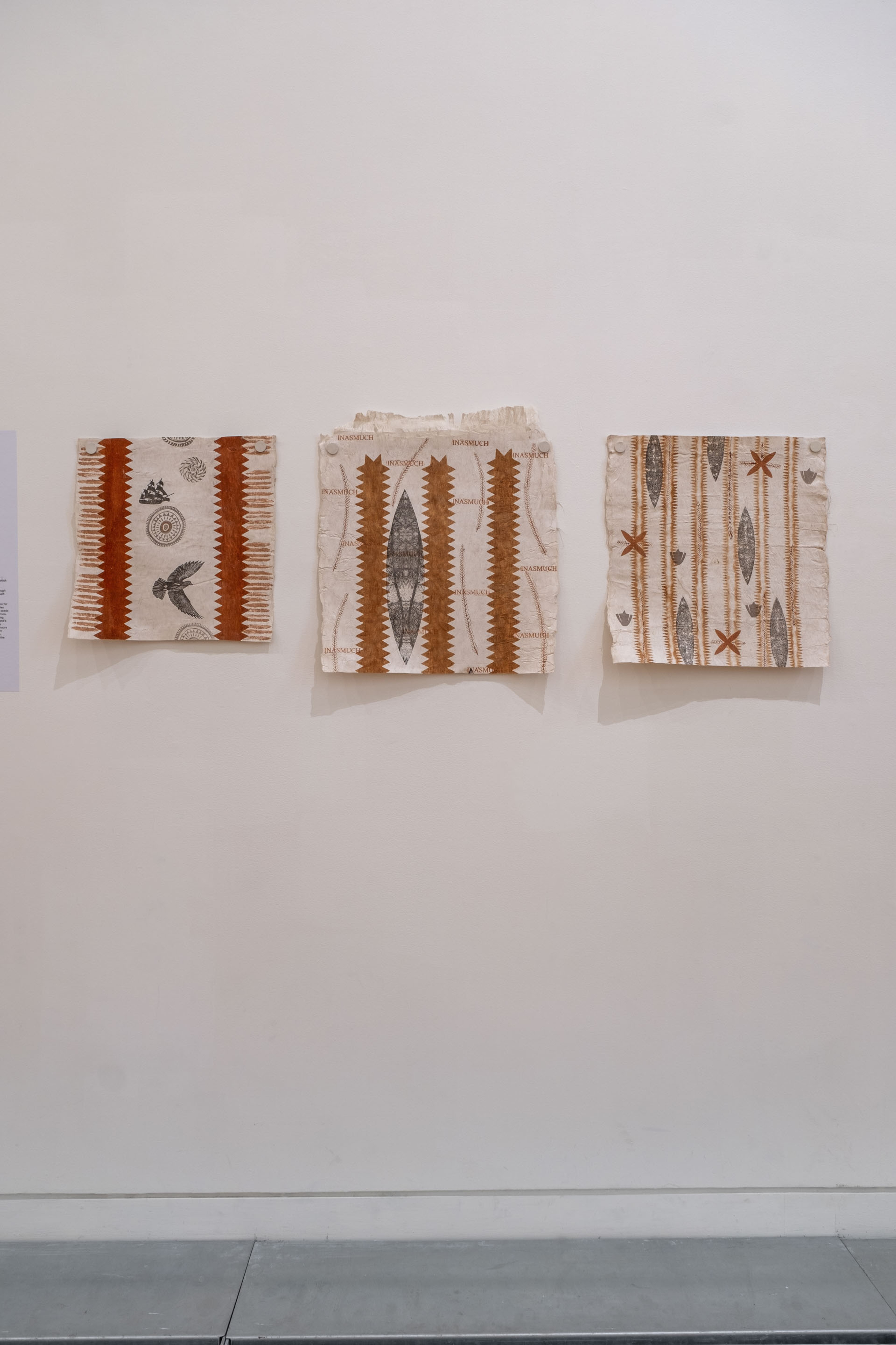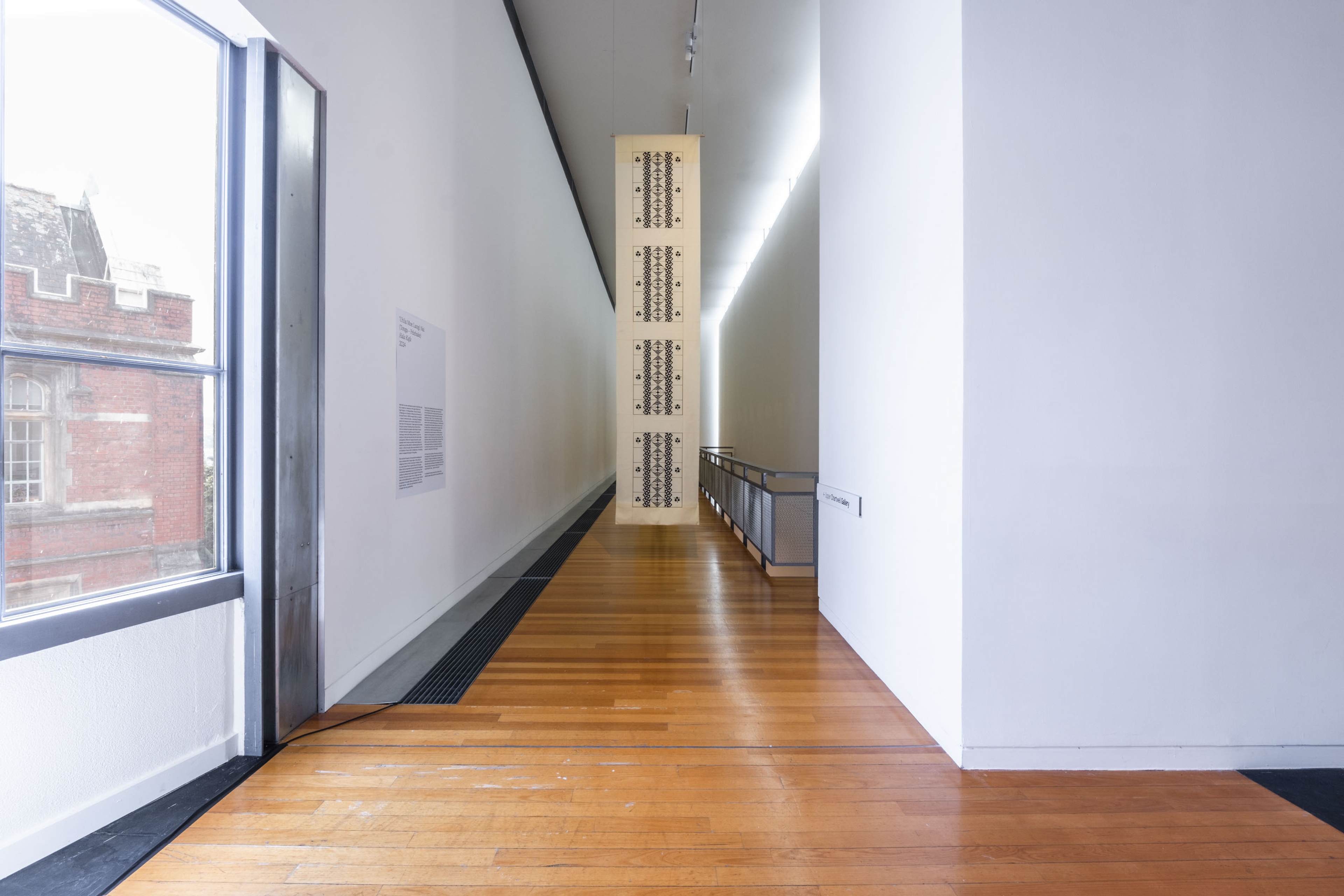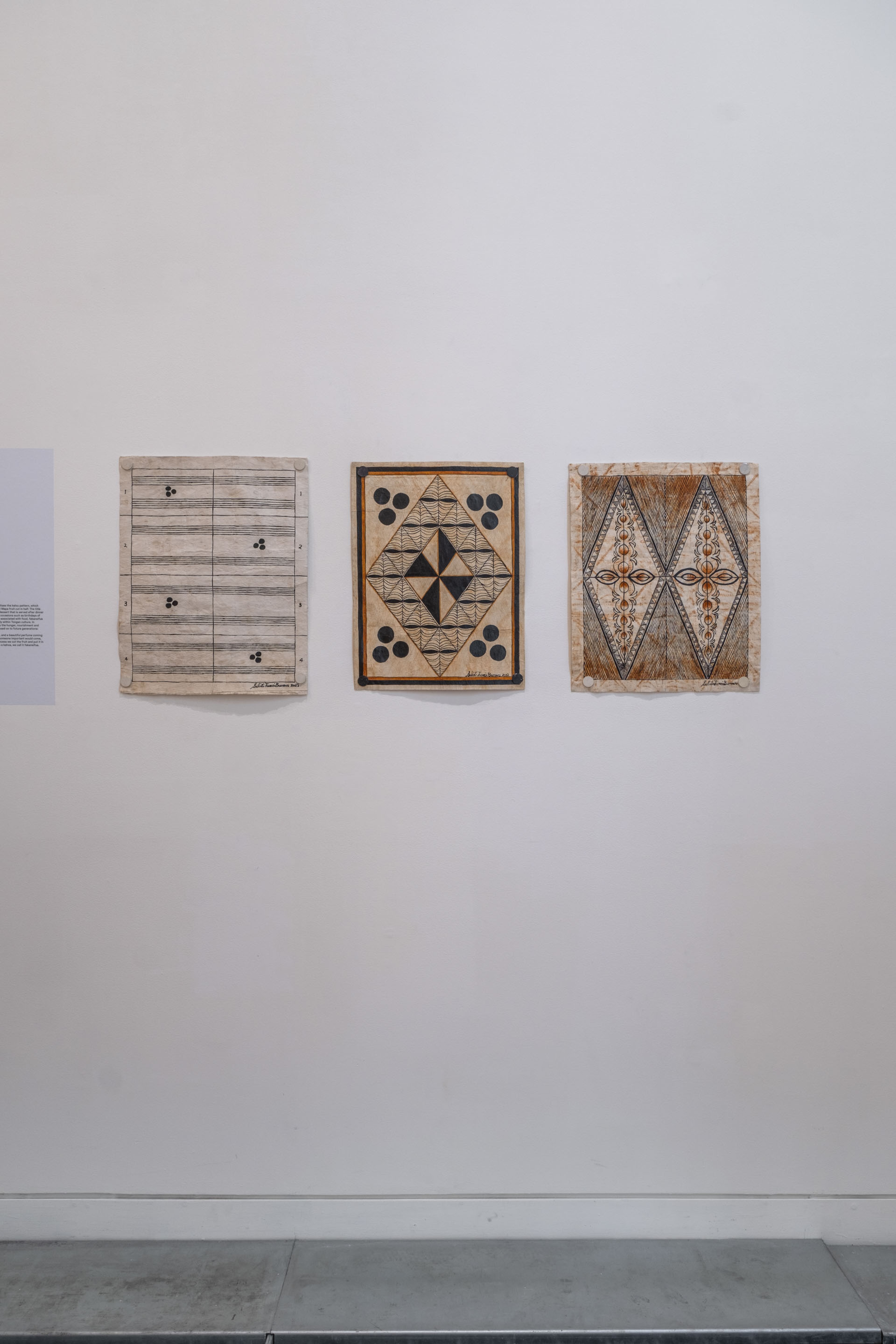 ‘Uhila Moe Langi Nai, Hala Kafa, 2024, ink on pepa koka’anga, six parts of 900 × 4000mm. Courtesy of the artist. Installation view, Vaiei Tupuna, Te Pātaka Toi Adam Art Gallery, Te Herenga Waka—Victoria University of Wellington, 2024. Photo: Ted Whitaker.