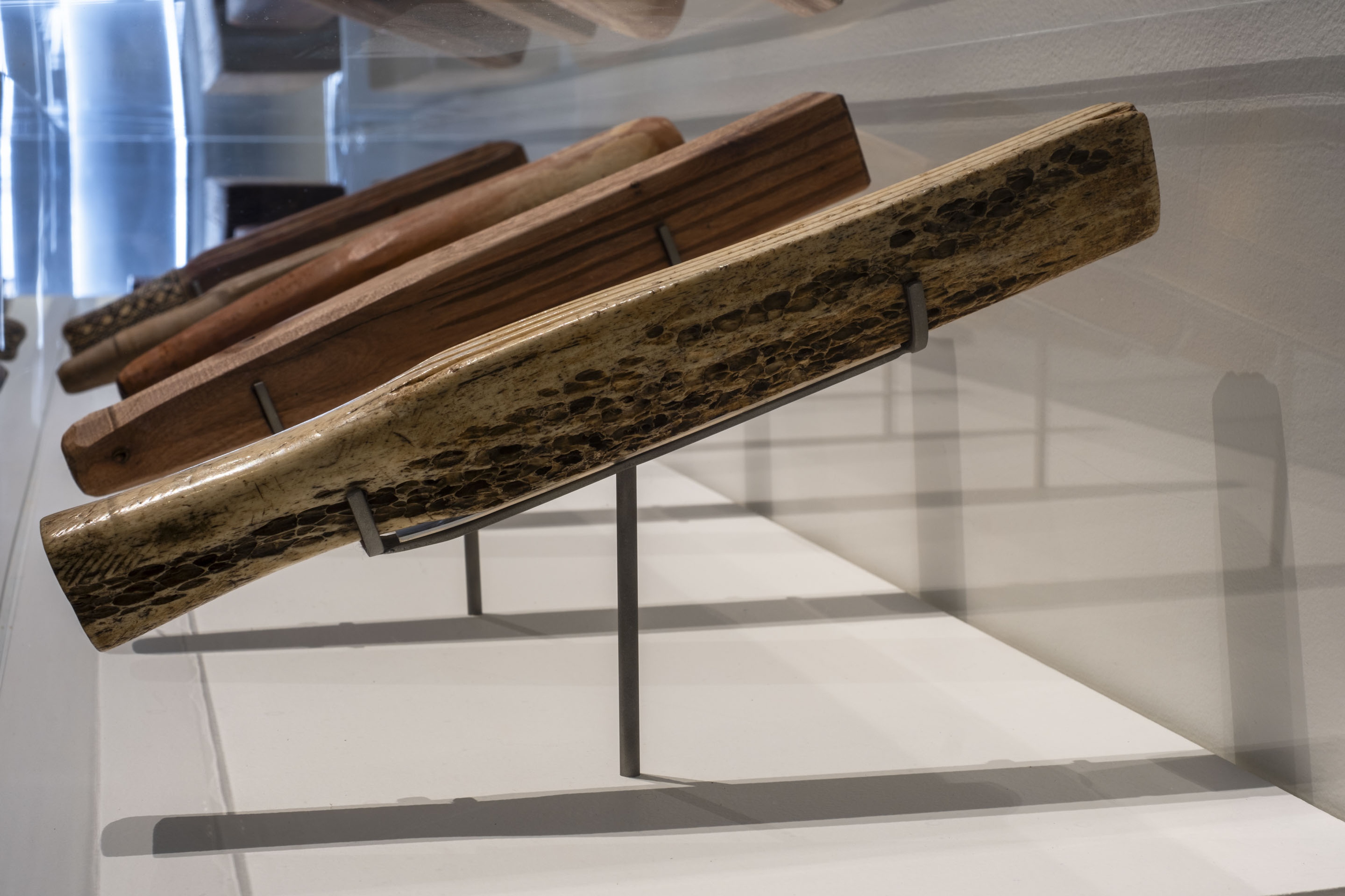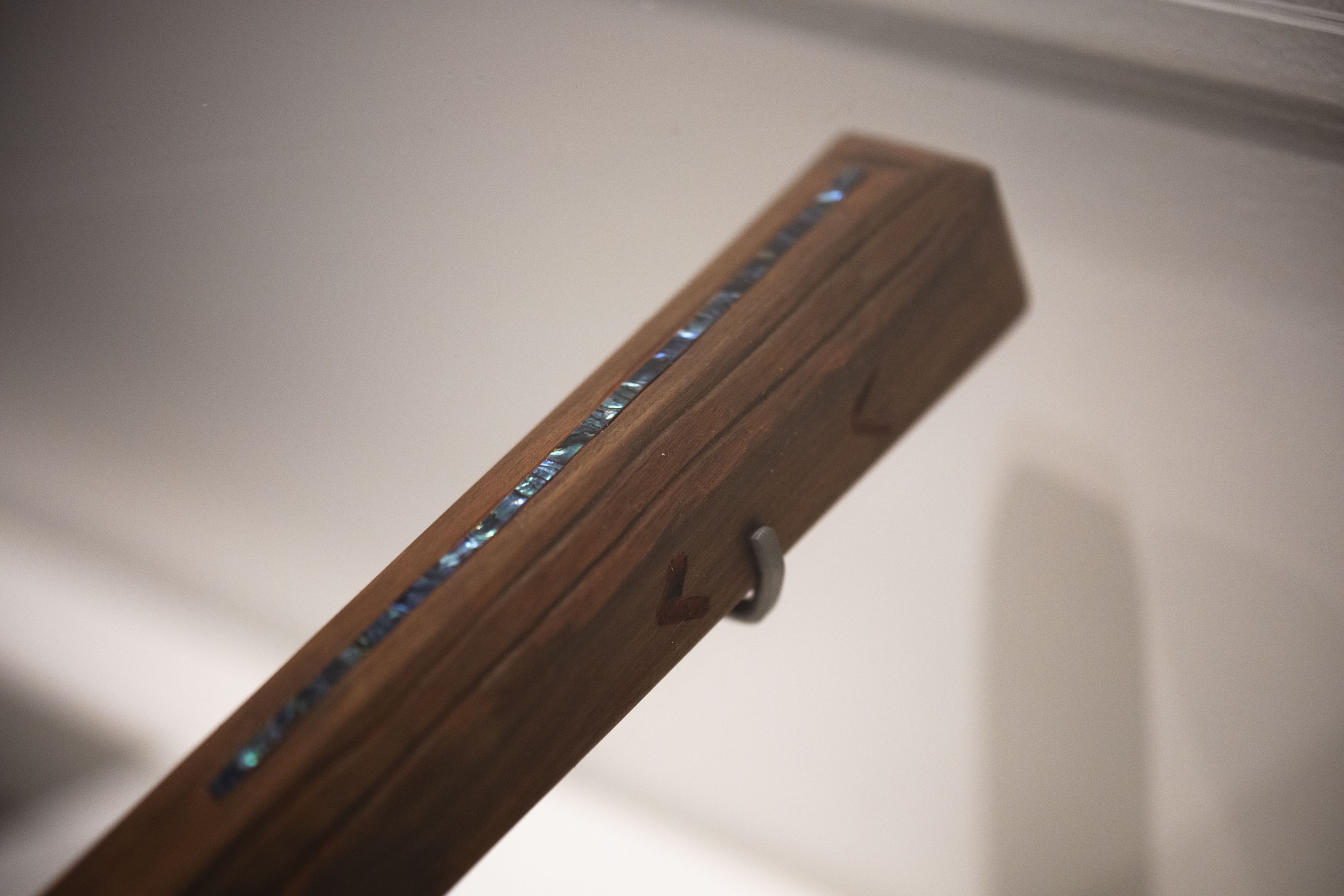 Cora-Allan, Ornate ike (tapa beater) (detail), 2021, pūriri, hiapo, pāua, kāpia ink, oil stain. Collection of Museum of New Zealand Te Papa Tongarewa. Purchased 2021. Installation view, ’Ahu: Ngā Wairua o Hina, Vaiei Tupuna, Te Pātaka Toi Adam Art Gallery, Te Herenga Waka—Victoria University of Wellington, 2024. Photo: Ted Whitaker.