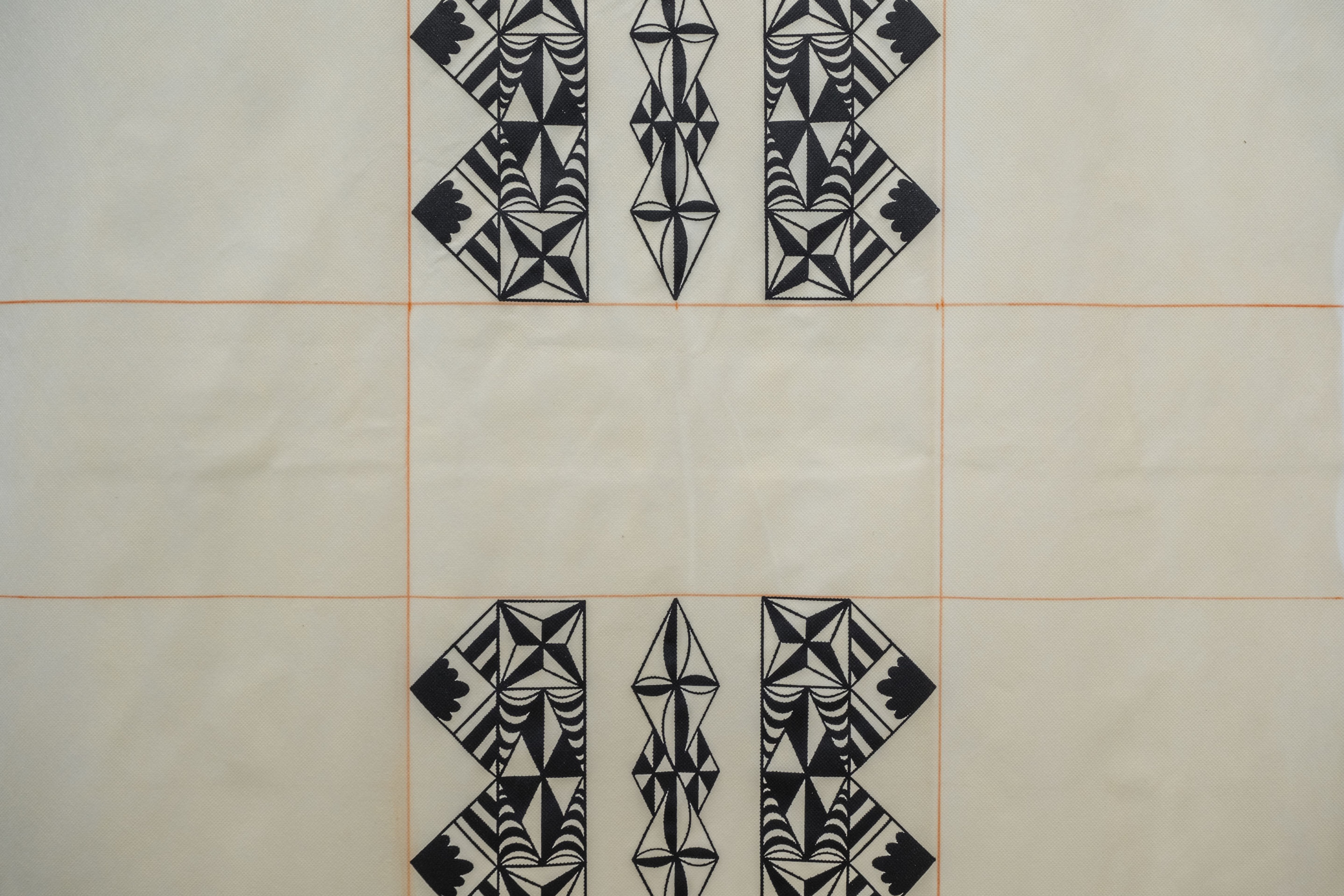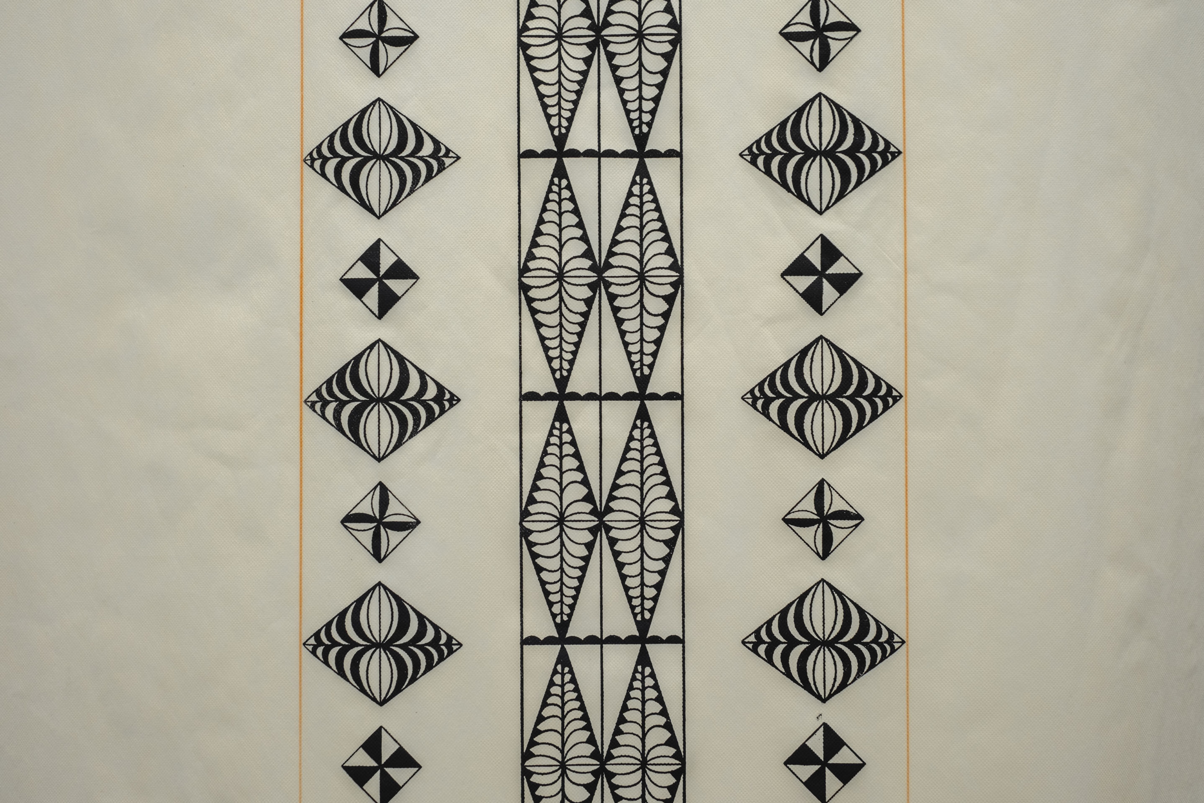‘Uhila Moe Langi Nai, Hala Kafa (detail), 2024, ink on pepa koka’anga, six parts of 900 × 4000mm. Courtesy of the artist. Installation view, Vaiei Tupuna, Te Pātaka Toi Adam Art Gallery, Te Herenga Waka—Victoria University of Wellington, 2024. Photo: Ted Whitaker.