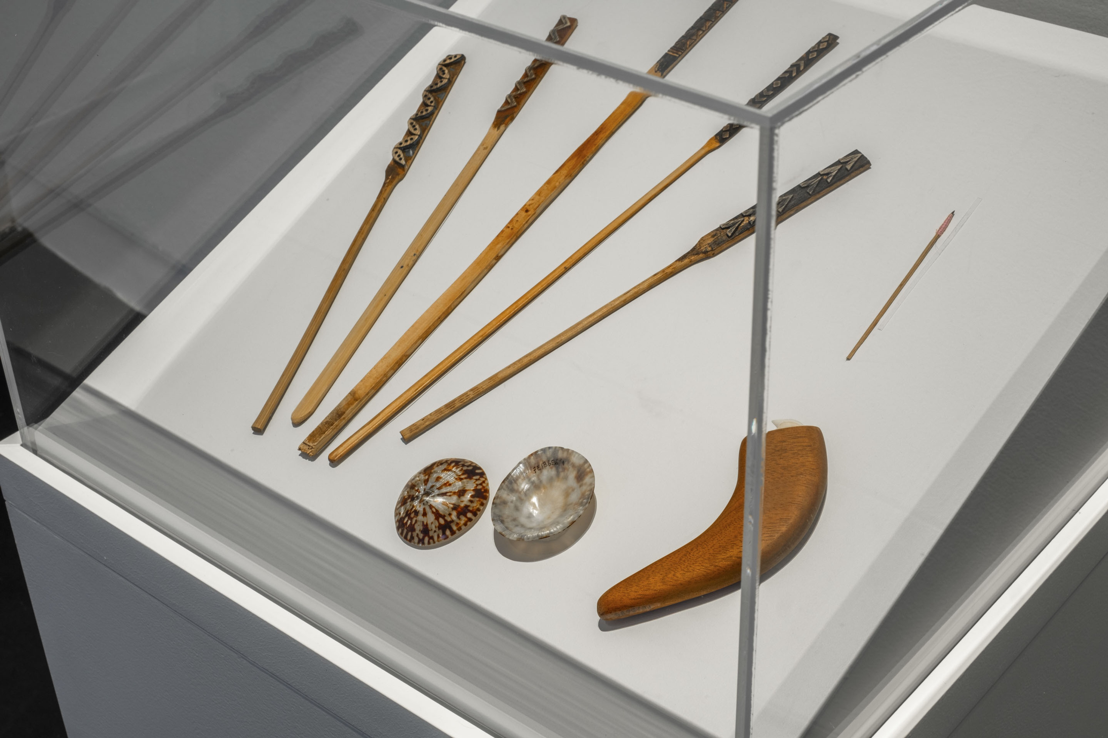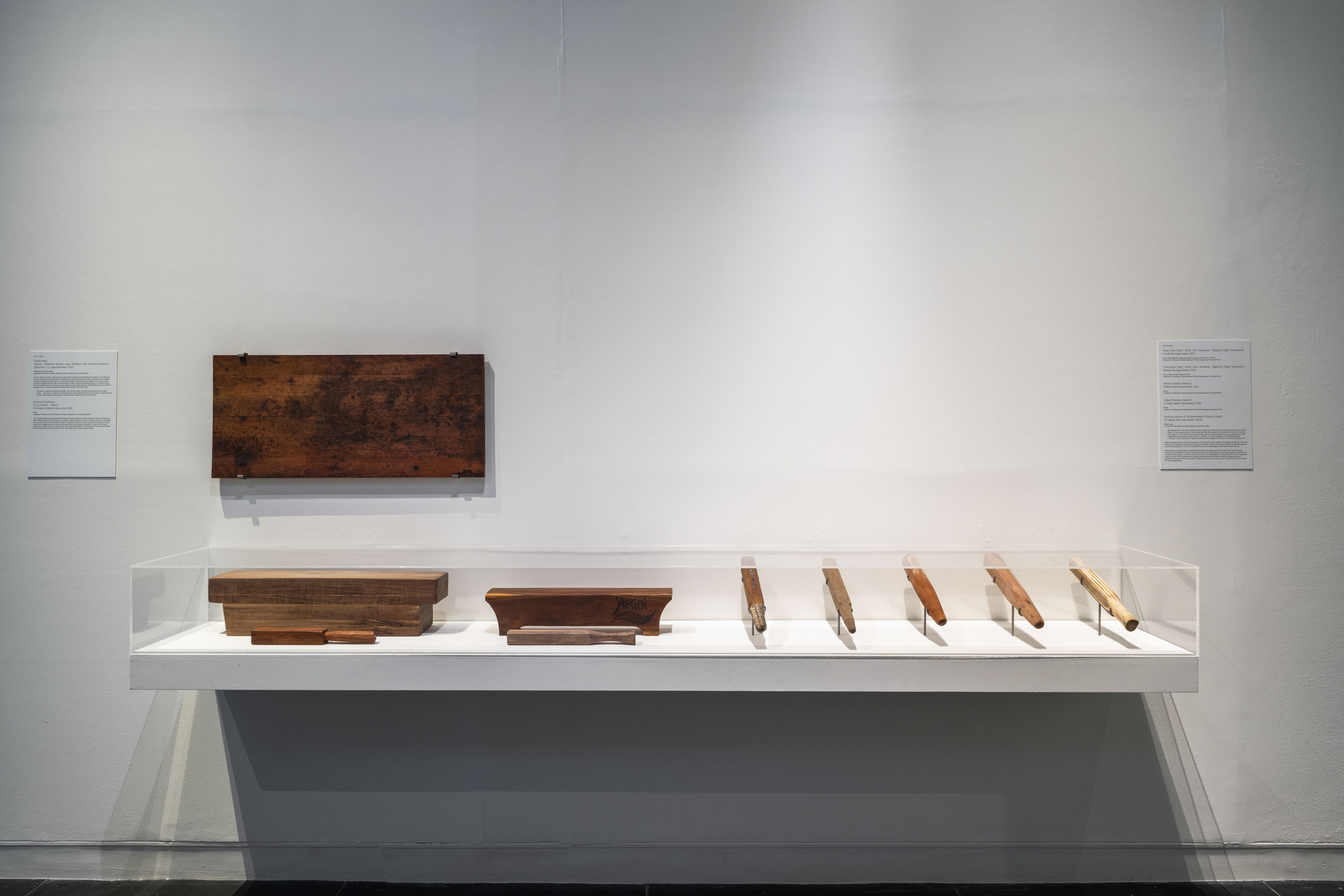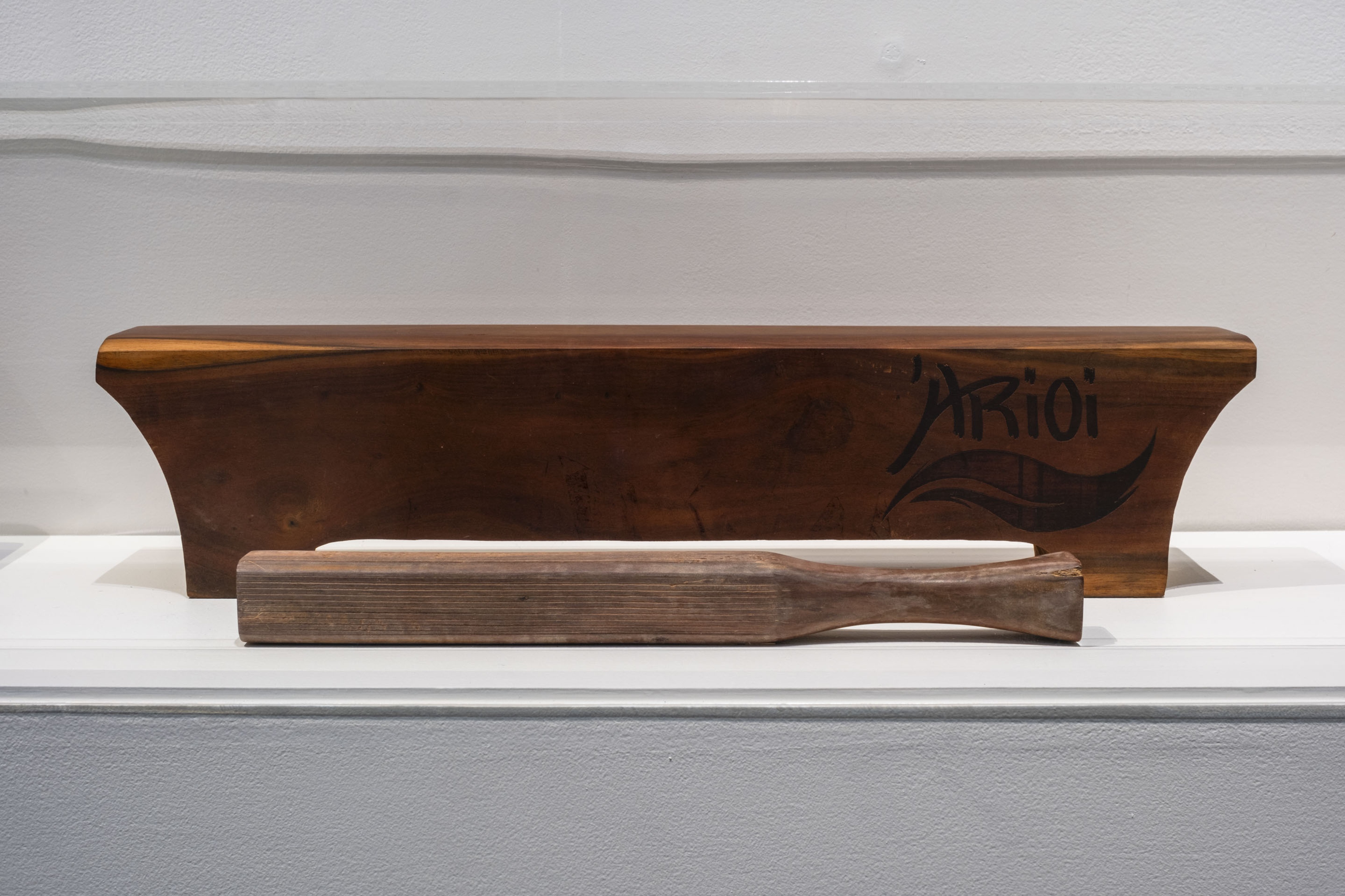 Hinatea Colombani, Í'e (Tahitian tapa beater), 2023, wood, 40 × 40 × 375mm; and Tutua (Tahitian tapa beating anvil), 2023, wood, 569 × 125 × 105mm. Collection of Museum of New Zealand Te Papa Tongarewa. Purchased 2021. Installation view, ’Ahu: Ngā Wairua o Hina, Vaiei Tupuna, Te Pātaka Toi Adam Art Gallery, Te Herenga Waka—Victoria University of Wellington, 2024. Photo: Ted Whitaker.