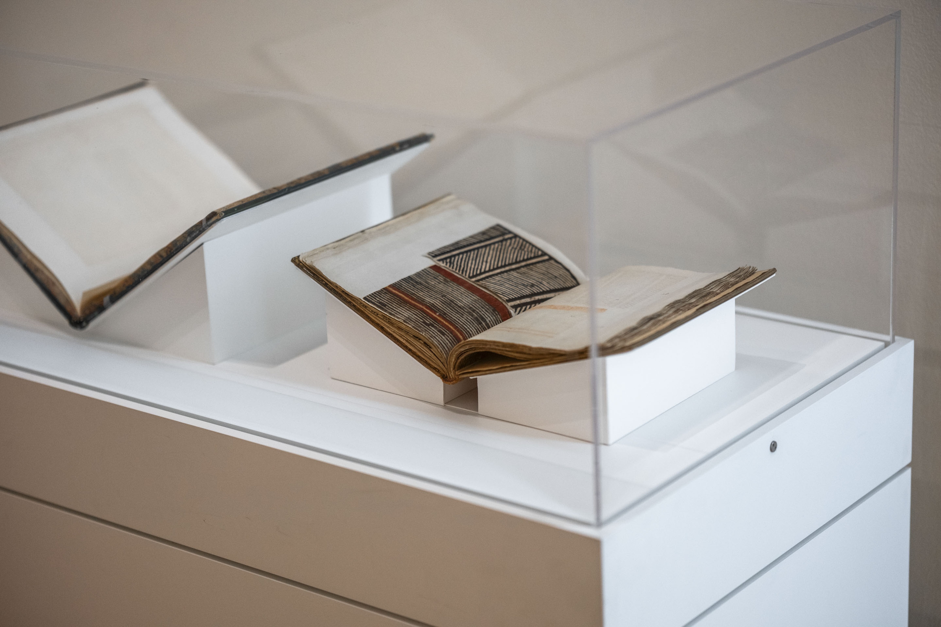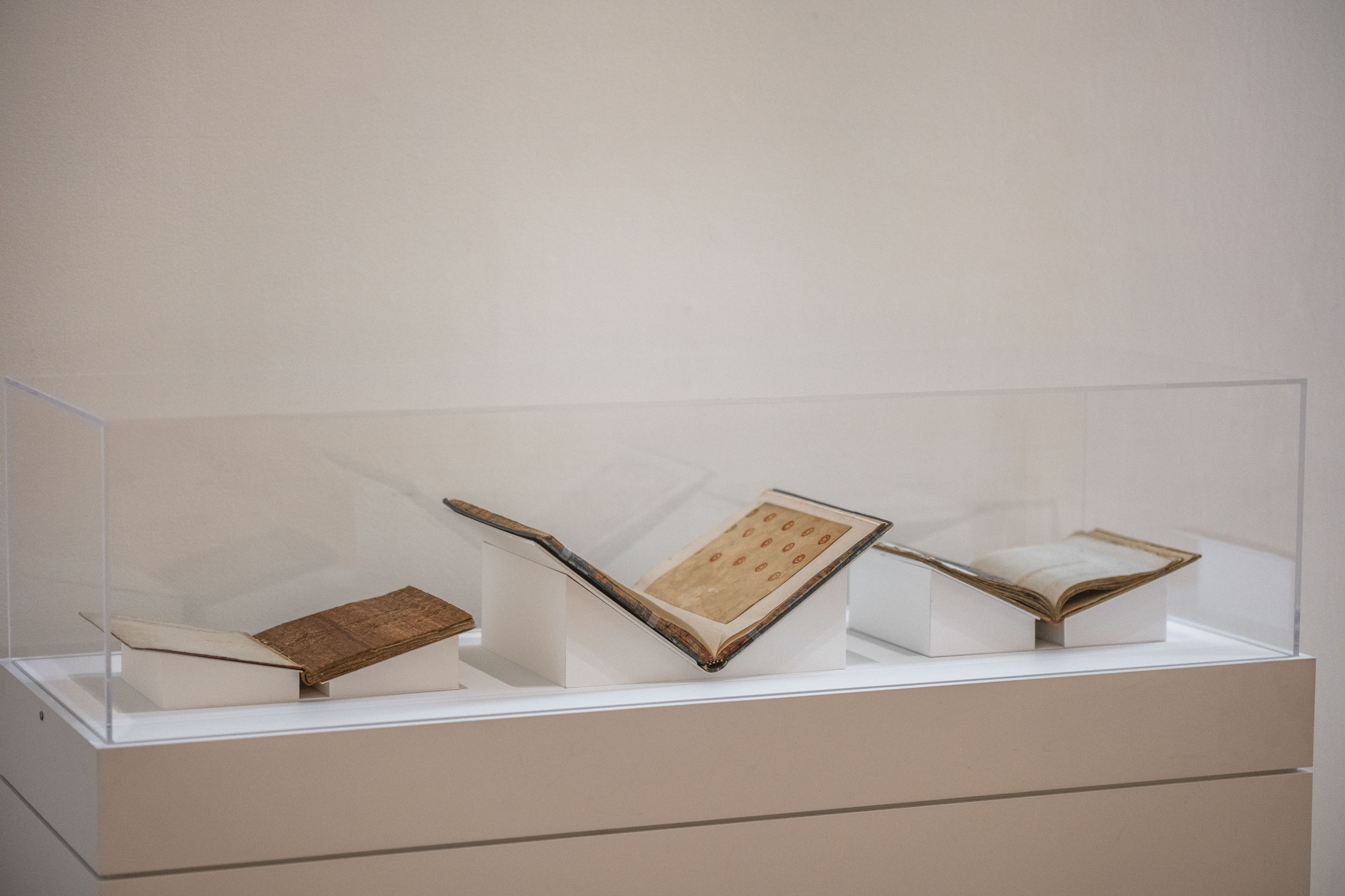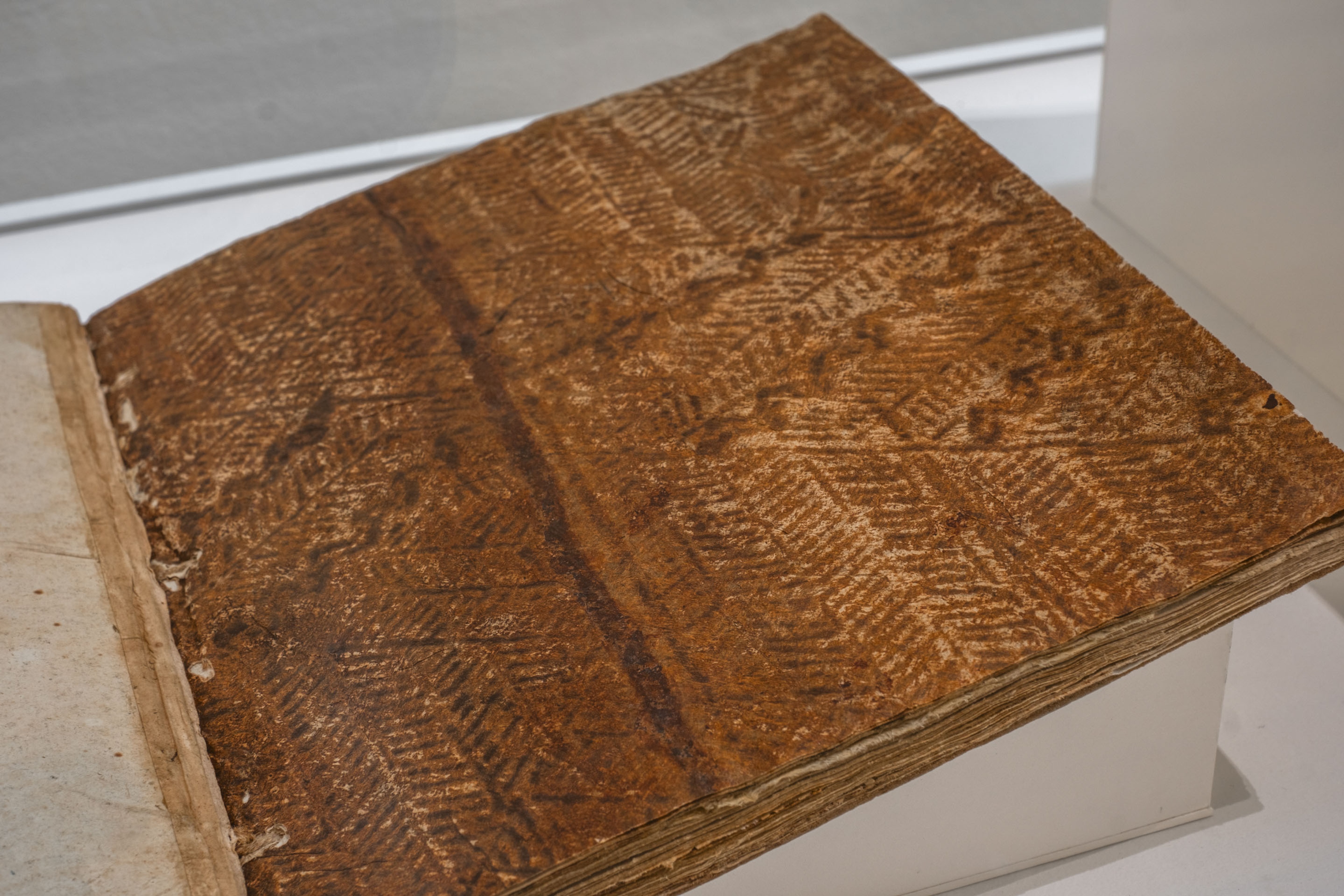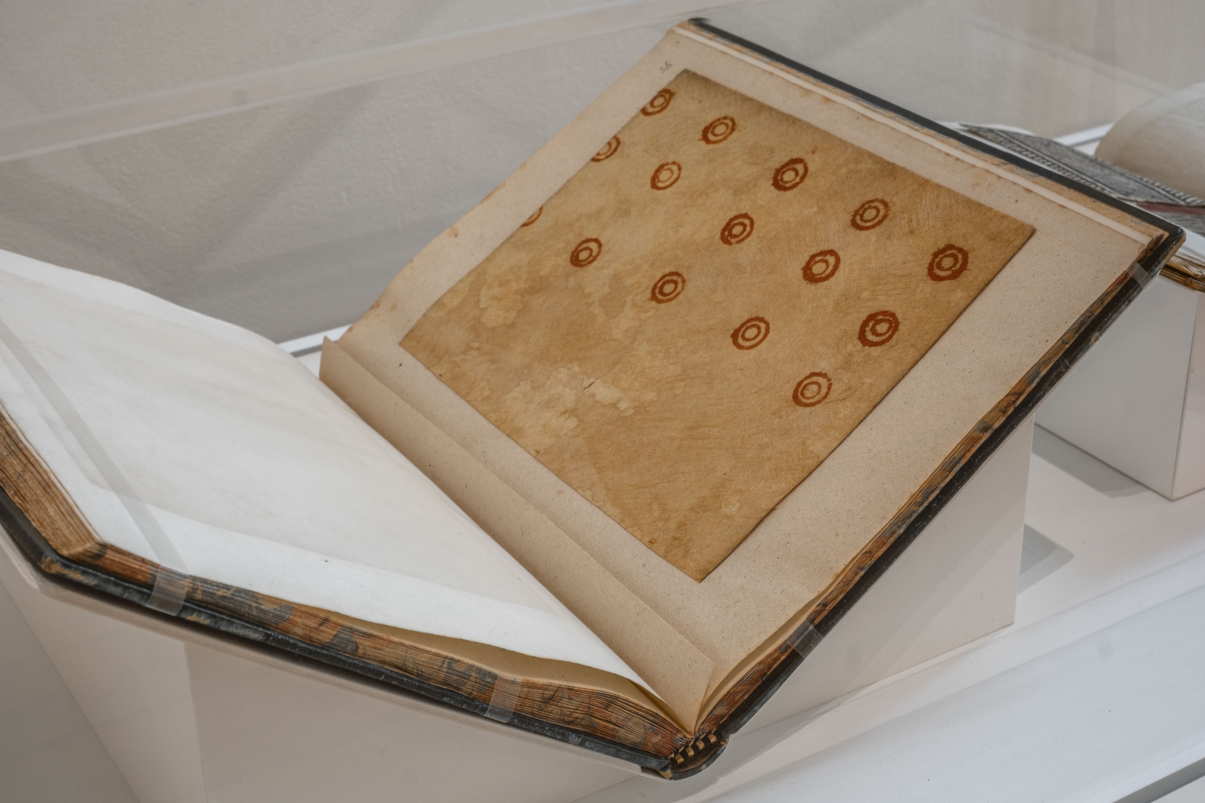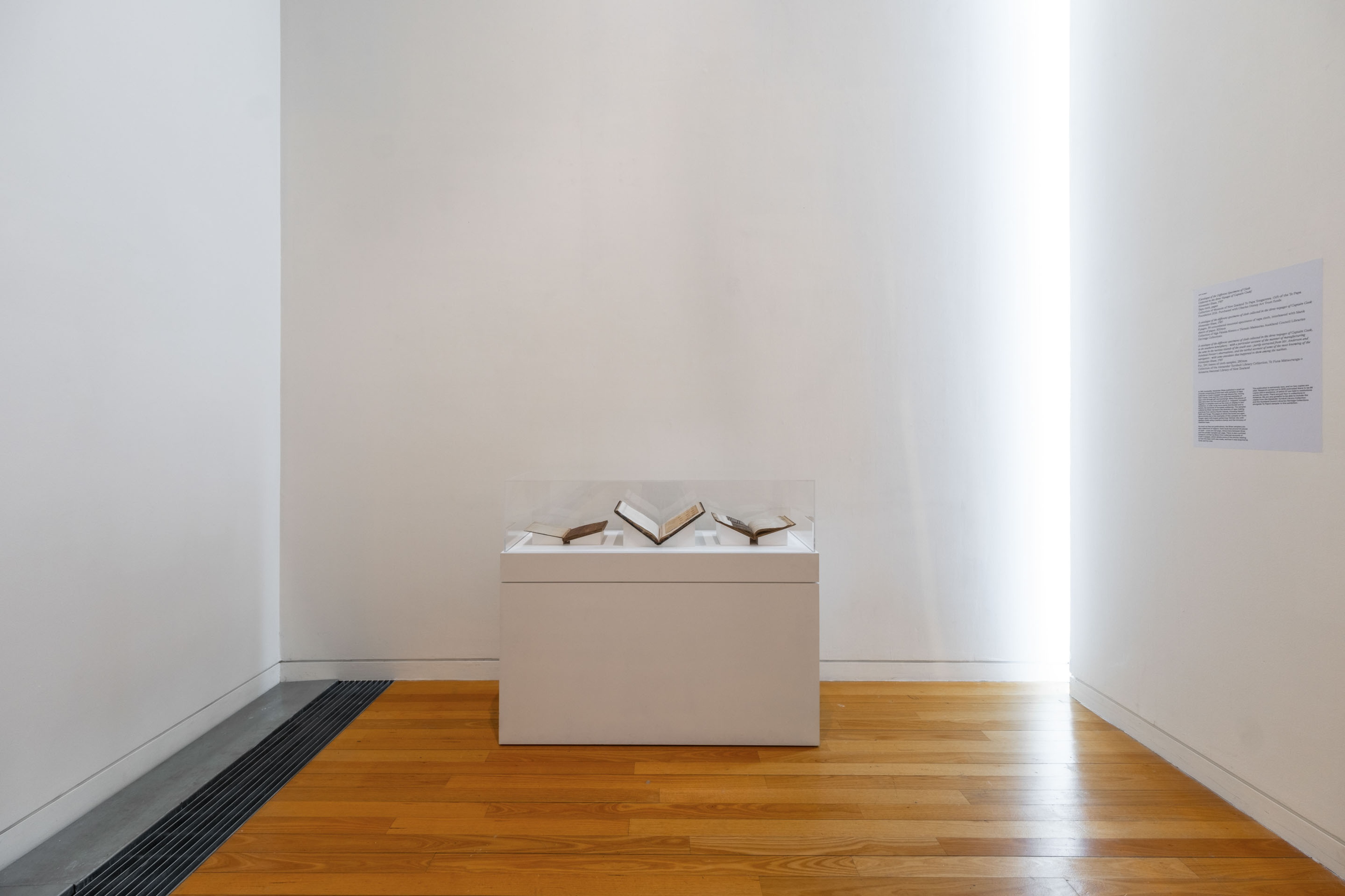 Alexander Shaw, A catalogue of the different specimens of cloth collected in the three voyages of Captain Cook, 1787, 8 pages, 39 unnumbered mounted specimens of tapa cloth, interleaved with blank sheets of paper, 300mm. Collection of Ngā Pātaka Kōrero o Tāmaki Makaurau Auckland Council Libraries Heritage Collections. Installation view, ’Ahu: Ngā Wairua o Hina, Vaiei Tupuna, Te Pātaka Toi Adam Art Gallery, Te Herenga Waka—Victoria University of Wellington, 2024. Photo: Ted Whitaker.